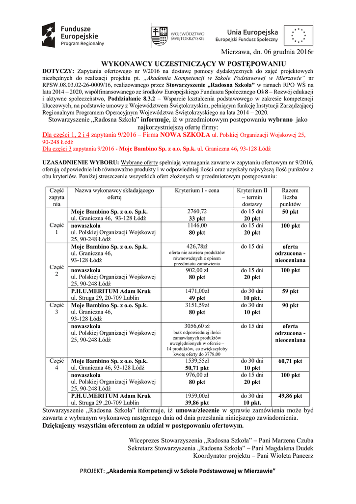 Mierzawa, dn. 06 grudnia 2016r WYKONAWCY UCZESTNICZĄCY W POSTĘPOWANIU DOTYCZY: Zapytania ofertowego nr 9/2016 na dostawę pomocy dydaktycznych do zajęć projektowych niezbędnych do realizacji projektu pt. „Akademia Kompetencji w Szkole Podstawowej w Mierzawie” nr RPSW.08.03.02-26-0009/16, realizowanego przez Stowarzyszenie „Radosna Szkoła” w ramach RPO WŚ na lata 2014 – 2020, współfinansowanego ze środków Europejskiego Funduszu Społecznego Oś 8 – Rozwój edukacji i aktywne społeczeństwo, Poddziałanie 8.3.2 – Wsparcie kształcenia podstawowego w zakresie kompetencji kluczowych, na podstawie umowy z Województwem Świętokrzyskim, pełniącym funkcję Instytucji Zarządzającej Regionalnym Programem Operacyjnym Województwa Świętokrzyskiego na lata 2014 – 2020. Stowarzyszenie „Radosna Szkoła” informuje, iż w przedmiotowym postępowaniu wybrano jako najkorzystniejszą ofertę firmy: Dla części 1, 2 i 4 zapytania 9/2016 – Firma NOWA SZKOŁA ul. Polskiej Organizacji Wojskowej 25, 90-248 Łódź Dla części 3 zapytania 9/2016 - Moje Bambino Sp. z o.o. Sp.k. ul. Graniczna 46, 93-128 Łódź UZASADNIENIE WYBORU: Wybrane oferty spełniają wymagania zawarte w zapytaniu ofertowym nr 9/2016, oferują odpowiednie lub równoważne produkty i w odpowiedniej ilości oraz uzyskały najwyższą ilość punktów z obu kryteriów. Poniżej streszczenie wszystkich ofert złożonych w przedmiotowym postępowaniu: Część zapyta nia Część 1 Część 2 Część 3 Część 4 Nazwa wykonawcy składającego ofertę Kryterium I - cena Moje Bambino Sp. z o.o. Sp.k. ul. Graniczna 46, 93-128 Łódź nowaszkoła ul. Polskiej Organizacji Wojskowej 25, 90-248 Łódź Moje Bambino Sp. z o.o. Sp.k. ul. Graniczna 46, 93-128 Łódź nowaszkoła ul. Polskiej Organizacji Wojskowej 25, 90-248 Łódź P.H.U.MERITUM Adam Kruk ul. Struga 29, 20-709 Lublin Moje Bambino Sp. z o.o. Sp.k. ul. Graniczna 46, 93-128 Łódź nowaszkoła ul. Polskiej Organizacji Wojskowej 25, 90-248 Łódź Moje Bambino Sp. z o.o. Sp.k. ul. Graniczna 46, 93-128 Łódź nowaszkoła ul. Polskiej Organizacji Wojskowej 25, 90-248 Łódź P.H.U.MERITUM Adam Kruk ul. Struga 29 ,20-709 Lublin 2760,72 33 pkt 1146,00 80 pkt Kryterium II – termin dostawy do 15 dni 20 pkt do 15 dni 20 pkt Razem liczba punktów 50 pkt 426,78zł do 15 dni oferta odrzucona nieoceniana 902,00 zł 80 pkt do 15 dni 20 pkt 100 pkt 1471,00zł 49 pkt 3151,59zł 80 pkt do 30 dni 10 pkt. do 30 dni 10 pkt 59 pkt 3056,60 zł do 15 dni oferta odrzucona nieoceniana 1539,55zł 50,71 pkt 976,00 zł 80 pkt do 30 dni 10 pkt do 15 dni 20 pkt 60,71 pkt 1959,00zł 39,86 pkt do 30 dni 10 pkt. 49,86 pkt oferta nie zawiera produktów równoważnych z opisem przedmiotu zamówienia brak odpowiedniej ilości zamawianych produktów uwzględnionych w ofercie – 14 produktów, co zwiększyłoby kwotę oferty do 3778,00 100 pkt 90 pkt 100 pkt Stowarzyszenie „Radosna Szkoła” informuje, iż umowa/zlecenie w sprawie zamówienia może być zawarta z wybranym wykonawcą następnego dnia od dnia przesłania niniejszego zawiadomienia. Dziękujemy wszystkim oferentom za udział w postępowaniu ofertowym. Wiceprezes Stowarzyszenia „Radosna Szkoła” – Pani Marzena Czuba Sekretarz Stowarzyszenia „Radosna Szkoła” – Pani Magdalena Dudek Koordynator projektu – Pani Wioleta Pancerz PROJEKT: „Akademia Kompetencji w Szkole Podstawowej w Mierzawie” BENEFICJENT: Stowarzyszenie „Radosna Szkoła”