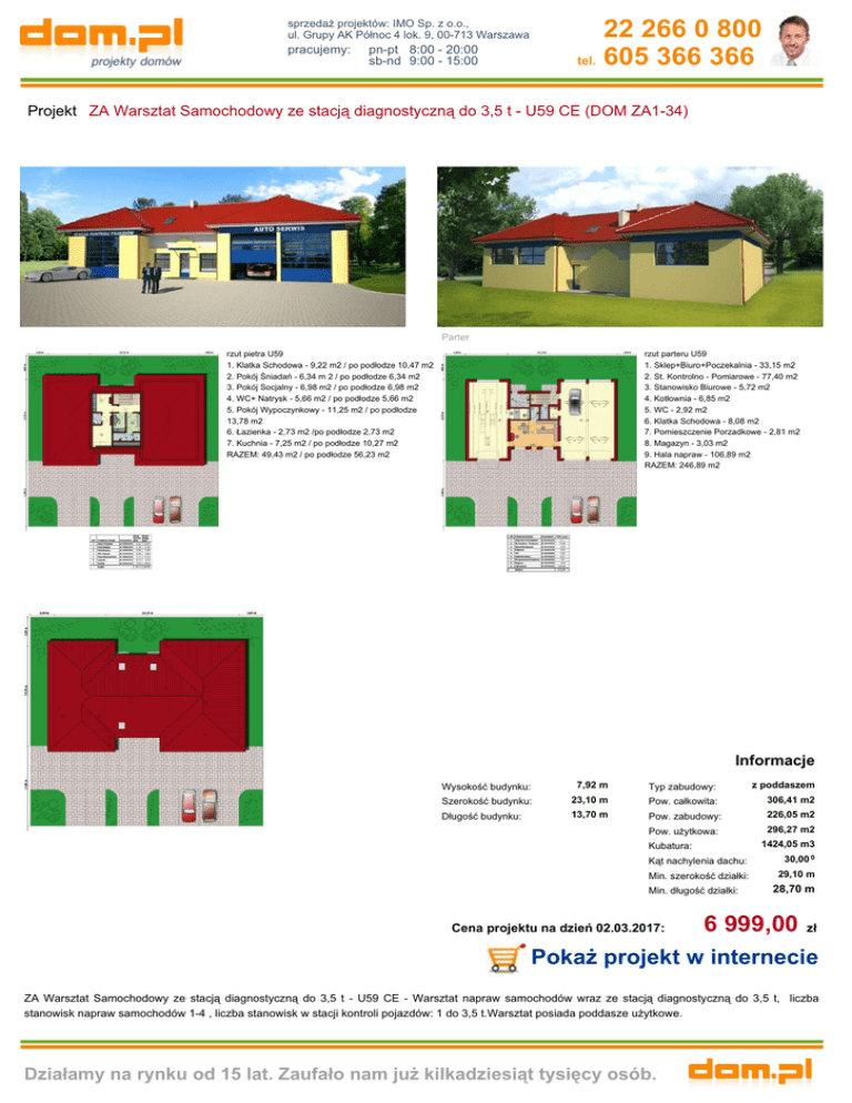 22 266 0 800 tel. 605 366 366 sprzedaż projektów: IMO Sp. z o.o., ul. Grupy AK Północ 4 lok. 9, 00-713 Warszawa pracujemy: pn-pt 8:00 - 20:00 sb-nd 9:00 - 15:00 Projekt ZA Warsztat Samochodowy ze stacją diagnostyczną do 3,5 t - U59 CE (DOM ZA1-34) Parter rzut pietra U59 1. Klatka Schodowa - 9,22 m2 / po podłodze 10,47 m2 2. Pokój Śniadań - 6,34 m 2 / po podłodze 6,34 m2 3. Pokój Socjalny - 6,98 m2 / po podłodze 6,98 m2 4. WC+ Natrysk - 5,66 m2 / po podłodze 5,66 m2 5. Pokój Wypoczynkowy - 11,25 m2 / po podłodze 13,78 m2 6. Łazienka - 2,73 m2 /po podłodze 2,73 m2 7. Kuchnia - 7,25 m2 / po podłodze 10,27 m2 RAZEM: 49,43 m2 / po podłodze 56,23 m2 rzut parteru U59 1. Sklep+Biuro+Poczekalnia - 33,15 m2 2. St. Kontrolno - Pomiarowe - 77,40 m2 3. Stanowisko Biurowe - 5,72 m2 4. Kotłownia - 6,85 m2 5. WC - 2,92 m2 6. Klatka Schodowa - 8,08 m2 7. Pomieszczenie Porzadkowe - 2,81 m2 8. Magazyn - 3,03 m2 9. Hala napraw - 106,89 m2 RAZEM: 246,89 m2 Informacje Wysokość budynku: 7,92 m Typ zabudowy: z poddaszem Szerokość budynku: 23,10 m Pow. całkowita: 306,41 m2 Długość budynku: 13,70 m Pow. zabudowy: 226,05 m2 Pow. użytkowa: 296,27 m2 1424,05 m3 Kubatura: Kąt nachylenia dachu: 30,00 0 Min. szerokość działki: 29,10 m Min. długość działki: Cena projektu na dzień 02.03.2017: 28,70 m 6 999,00 zł Pokaż projekt w internecie ZA Warsztat Samochodowy ze stacją diagnostyczną do 3,5 t - U59 CE - Warsztat napraw samochodów wraz ze stacją diagnostyczną do 3,5 t, liczba stanowisk napraw samochodów 1-4 , liczba stanowisk w stacji kontroli pojazdów: 1 do 3,5 t.Warsztat posiada poddasze użytkowe. Działamy na rynku od 15 lat. Zaufało nam już kilkadziesiąt tysięcy osób.