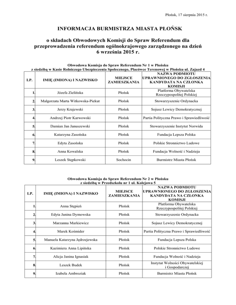 Płońsk, 17 sierpnia 2015 r. INFORMACJA BURMISTRZA MIASTA PŁOŃSK o składach Obwodowych Komisji do Spraw Referendum dla przeprowadzenia referendum ogólnokrajowego zarządzonego na dzień 6 września 2015 r. Obwodowa Komisja do Spraw Referendum Nr 1 w Płońsku z siedzibą w Kasie Rolniczego Ubezpieczenia Społecznego, Placówce Terenowej w Płońsku ul. Zajazd 4 NAZWA PODMIOTU MIEJSCE UPRAWNIONEGO DO ZGŁOSZENIA LP. IMIĘ (IMIONA) I NAZWISKO ZAMIESZKANIA KANDYDATA NA CZŁONKA KOMISJI Platforma Obywatelska Józefa Zielińska Płońsk 1. Rzeczypospolitej Polskiej 2. Małgorzata Marta Witkowska-Piekut Płońsk Stowarzyszenie Ordynacka 3. Jerzy Krajewski Płońsk Sojusz Lewicy Demokratycznej 4. Andrzej Piotr Karwowski Płońsk Partia Polityczna Prawo i Sprawiedliwość 5. Damian Jan Januszewski Płońsk Stowarzyszenie Instytut Norwida 6. Katarzyna Zasońska Płońsk Fundacja Lepsza Polska 7. Edyta Zasońska Płońsk Polskie Stronnictwo Ludowe 8. Anna Kowalska Płońsk Fundacja Wolność i Nadzieja 9. Leszek Stępkowski Sochocin Burmistrz Miasta Płońsk LP. 1. Obwodowa Komisja do Spraw Referendum Nr 2 w Płońsku z siedzibą w Przedszkolu nr 1 ul. Kolejowa 5 NAZWA PODMIOTU MIEJSCE UPRAWNIONEGO DO ZGŁOSZENIA IMIĘ (IMIONA) I NAZWISKO ZAMIESZKANIA KANDYDATA NA CZŁONKA KOMISJI Platforma Obywatelska Anna Stępień Płońsk Rzeczypospolitej Polskiej 2. Edyta Janina Dymowska Płońsk Stowarzyszenie Ordynacka 3. Marzanna Markiewicz Płońsk Sojusz Lewicy Demokratycznej 4. Marek Kośmider Płońsk Partia Polityczna Prawo i Sprawiedliwość 5. Manuela Katarzyna Jędrzejewska Płońsk Fundacja Lepsza Polska 6. Kazimiera Anna Lipińska Płońsk Polskie Stronnictwo Ludowe 7. Alicja Janina Ignasiak Płońsk Fundacja Wolność i Nadzieja 8. Leszek Budek Płońsk Instytut Wolności Obywatelskiej i Gospodarczej 9. Izabela Ambroziak Płońsk Burmistrz Miasta Płońsk Płońsk, 17 sierpnia 2015 r. LP. 1. Obwodowa Komisja do Spraw Referendum Nr 3 w Płońsku z siedzibą w Zespole Szkół nr 2 im. L. Rutkowskiego ul. ZWM 10 NAZWA PODMIOTU MIEJSCE UPRAWNIONEGO DO ZGŁOSZENIA IMIĘ (IMIONA) I NAZWISKO KANDYDATA NA CZŁONKA ZAMIESZKANIA KOMISJI Platforma Obywatelska Katarzyna Chudzyńska Płońsk Rzeczypospolitej Polskiej 2. Joanna Elżbieta Bukowska Płońsk Stowarzyszenie Ordynacka 3. Andrzej Waldemar Rykowski Płońsk Sojusz Lewicy Demokratycznej 4. Cezary Chodorski Płońsk Partia Polityczna Prawo i Sprawiedliwość 5. Joanna Kalinowska Płońsk Stowarzyszenie Instytut Norwida 6. Justyna Aleksandrowicz Płońsk Fundacja Lepsza Polska 7. Joanna Dorota Przedpełska Płońsk Polskie Stronnictwo Ludowe 8. Jolanta Jadwiga Madany Płońsk Instytut Wolności Obywatelskiej i Gospodarczej 9. Marek Lewandowski Drobin Burmistrz Miasta Płońsk Obwodowa Komisja do Spraw Referendum Nr 4 w Płońsku z siedzibą w Przedsiębiorstwie Gospodarki Komunalnej Sp. z o.o. w Płońsku przy ulicy Mickiewicza 4 NAZWA PODMIOTU MIEJSCE UPRAWNIONEGO DO ZGŁOSZENIA LP. IMIĘ (IMIONA) I NAZWISKO ZAMIESZKANIA KANDYDATA NA CZŁONKA KOMISJI Platforma Obywatelska Hanna Makowska-Oporska Płońsk 1. Rzeczypospolitej Polskiej 2. Maria Magdalena Witkowska Płońsk Stowarzyszenie Ordynacka 3. Iwona Grażyna Łoniewska Płońsk Sojusz Lewicy Demokratycznej 4. Ryszard Antoniewski Płońsk Partia Polityczna Prawo i Sprawiedliwość 5. Marcin Żołądek Płońsk Stowarzyszenie Instytut Norwida 6. Joanna Domańska Płońsk Fundacja Lepsza Polska 7. Dorota Cieszewska Płońsk Polskie Stronnictwo Ludowe 8. Grażyna Irena Zielińska Płońsk Fundacja Wolność i Nadzieja 9. Beata Klik Sarnowo Góry Burmistrz Miasta Płońsk Płońsk, 17 sierpnia 2015 r. Obwodowa Komisja do Spraw Referendum nr 5 w Płońsku z siedzibą w Zakładzie Gospodarki Mieszkaniowej (Biblioteka Pedagogiczna) ul. Warszawska 7 NAZWA PODMIOTU MIEJSCE UPRAWNIONEGO DO ZGŁOSZENIA LP. IMIĘ (IMIONA) I NAZWISKO ZAMIESZKANIA KANDYDATA NA CZŁONKA KOMISJI Platforma Obywatelska Barbara Bilińska Płońsk 1. Rzeczypospolitej Polskiej 2. Joanna Janina Piechocka Płońsk Stowarzyszenie Ordynacka 3. Anna Gabryela Rogacka Płońsk Sojusz Lewicy Demokratycznej 4. Marcin Maciej Kośmider Płońsk Partia Polityczna Prawo i Sprawiedliwość 5. Damian Bułka Płońsk Stowarzyszenie Instytut Norwida 6. Henryka Żebrowska Płońsk Fundacja Lepsza Polska 7. Irena Gizińska Płońsk Polskie Stronnictwo Ludowe 8. Emilia Orłowska Płońsk Fundacja Wolność i Nadzieja 9. Jagoda Katarzyna Mrozowicz Płońsk Burmistrz Miasta Płońsk LP. 1. Obwodowa Komisja do Spraw Referendum nr 6 w Płońsku z siedzibą w Gimnazjum Publicznym nr 2 im. Bolesława Chrobrego ul. Wolności 4 NAZWA PODMIOTU MIEJSCE UPRAWNIONEGO DO ZGŁOSZENIA IMIĘ (IMIONA) I NAZWISKO ZAMIESZKANIA KANDYDATA NA CZŁONKA KOMISJI Platforma Obywatelska Teresa Danuta Przyborowska Płońsk Rzeczypospolitej Polskiej 2. Danuta Modesta Borowska Płońsk Stowarzyszenie Ordynacka 3. Danuta Marianna Chodorska Płońsk Sojusz Lewicy Demokratycznej 4. Małgorzata Jaszczur Płońsk Partia Polityczna Prawo i Sprawiedliwość 5. Danuta Teresa Lewandowska Płońsk Fundacja Lepsza Polska 6. Agnieszka Gabriela Graczyk Płońsk Polskie Stronnictwo Ludowe 7. Katarzyna Weronika Szatkowska Płońsk Fundacja Wolność i Nadzieja 8. Elżbieta Kruszyńska Płońsk Instytut Wolności Obywatelskiej i Gospodarczej 9. Anna Małgorzata Czerniawska Płońsk Burmistrz Miasta Płońsk Płońsk, 17 sierpnia 2015 r. LP. 1. Obwodowa Komisja do Spraw Referendum nr 7 w Płońsku z siedzibą w Zespole Szkół Ogólnokształcących ul. Płocka 56 NAZWA PODMIOTU MIEJSCE UPRAWNIONEGO DO ZGŁOSZENIA IMIĘ (IMIONA) I NAZWISKO KANDYDATA NA CZŁONKA ZAMIESZKANIA KOMISJI Platforma Obywatelska Milena Beata Osiecka Płońsk Rzeczypospolitej Polskiej 2. Izabela Podgórska Płońsk Stowarzyszenie Ordynacka 3. Małgorzata Kurzątkowska Płońsk Partia Polityczna Prawo i Sprawiedliwość 4. Michał Żabowski Płońsk Stowarzyszenie Instytut Norwida 5. Izabela Laskowska Płońsk Fundacja Lepsza 