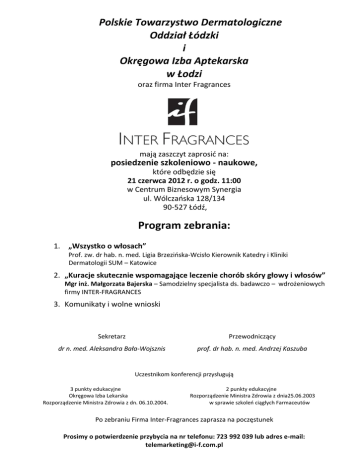 Polskie Towarzystwo Dermatologiczne Oddział Łódzki i Okręgowa Izba Aptekarska w Łodzi oraz firma Inter Fragrances mają zaszczyt zaprosić na: posiedzenie szkoleniowo - naukowe, które odbędzie się 21 czerwca 2012 r. o godz. 11:00 w Centrum Biznesowym Synergia ul. Wólczańska 128/134 90-527 Łódź, Program zebrania: 1. „Wszystko o włosach” Prof. zw. dr hab. n. med. Ligia Brzezińska-Wcisło Kierownik Katedry i Kliniki Dermatologii SUM – Katowice 2. „Kuracje skutecznie wspomagające leczenie chorób skóry głowy i włosów” Mgr inż. Małgorzata Bajerska – Samodzielny specjalista ds. badawczo – wdrożeniowych firmy INTER-FRAGRANCES 3. Komunikaty i wolne wnioski Sekretarz Przewodniczący dr n. med. Aleksandra Bała-Wojsznis prof. dr hab. n. med. Andrzej Kaszuba Uczestnikom konferencji przysługują 3 punkty edukacyjne Okręgowa Izba Lekarska Rozporządzenie Ministra Zdrowia z dn. 06.10.2004. 2 punkty edukacyjne Rozporządzenie Ministra Zdrowia z dnia25.06.2003 w sprawie szkoleń ciągłych Farmaceutów Po zebraniu Firma Inter-Fragrances zaprasza na poczęstunek Prosimy o potwierdzenie przybycia na nr telefonu: 723 992 039 lub adres e-mail: [email protected]