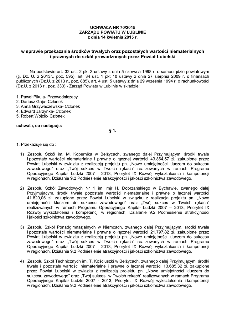 UCHWAŁA NR 70/2015 ZARZĄDU POWIATU W LUBLINIE z dnia 14 kwietnia 2015 r. w sprawie przekazania środków trwałych oraz pozostałych wartości niematerialnych i prawnych do szkół prowadzonych przez Powiat Lubelski Na podstawie art. 32 ust. 2 pkt 3 ustawy z dnia 5 czerwca 1998 r. o samorządzie powiatowym (tj. Dz. U. z 2013r., poz. 595), art. 34 ust. 1 pkt 10 ustawy z dnia 27 sierpnia 2009 r. o finansach publicznych (Dz.U. z 2013 r., poz. 885), art. 4 ust. 5 ustawy z dnia 29 września 1994 r. o rachunkowości (Dz.U. z 2013 r., poz. 330) - Zarząd Powiatu w Lublinie w składzie: 1. Paweł Pikula- Przewodniczący 2. Dariusz Gajo- Członek 3. Anna Grzywaczewska- Członek 4. Edward Jarzynka- Członek 5. Robert Wójcik- Członek uchwala, co następuje: § 1. 1. Przekazuje się do : 1) Zespołu Szkół im. M. Kopernika w Bełżycach, zwanego dalej Przyjmującym, środki trwałe i pozostałe wartości niematerialne i prawne o łącznej wartości 43.864,57 zł, zakupione przez Powiat Lubelski w związku z realizacją projektu pn. „Nowe umiejętności kluczem do sukcesu zawodowego” oraz „Twój sukces w Twoich rękach” realizowanych w ramach Programu Operacyjnego Kapitał Ludzki 2007 - 2013, Priorytet IX Rozwój wykształcenia i kompetencji w regionach, Działanie 9.2 Podniesienie atrakcyjności i jakości szkolnictwa zawodowego. 2) Zespołu Szkół Zawodowych Nr 1 im. mjr H. Dobrzańskiego w Bychawie, zwanego dalej Przyjmującym, środki trwałe pozostałe wartości niematerialne i prawne o łącznej wartości 41.820,06 zł, zakupione przez Powiat Lubelski w związku z realizacją projektu pn. „Nowe umiejętności kluczem do sukcesu zawodowego” oraz „Twój sukces w Twoich rękach” realizowanych w ramach Programu Operacyjnego Kapitał Ludzki 2007 – 2013, Priorytet IX Rozwój wykształcenia i kompetencji w regionach, Działanie 9.2 Podniesienie atrakcyjności i jakości szkolnictwa zawodowego. 3) Zespołu Szkół Ponadgimnazjalnych w Niemcach, zwanego dalej Przyjmującym, środki trwałe i pozostałe wartości niematerialne i prawne o łącznej wartości 21.797,82 zł, zakupione przez Powiat Lubelski w związku z realizacją projektu pn. „Nowe umiejętności kluczem do sukcesu zawodowego” oraz „Twój sukces w Twoich rękach” realizowanych w ramach Programu Operacyjnego Kapitał Ludzki 2007 - 2013, Priorytet IX Rozwój wykształcenia i kompetencji w regionach, Działanie 9.2 Podniesienie atrakcyjności i jakości szkolnictwa zawodowego. 4) Zespołu Szkół Technicznych im. T. Kościuszki w Bełżycach, zwanego dalej Przyjmującym, środki trwałe i pozostałe wartości niematerialne i prawne o łącznej wartości 13.685,32 zł, zakupione przez Powiat Lubelski w związku z realizacją projektu pn. „Nowe umiejętności kluczem do sukcesu zawodowego” oraz „Twój sukces w Twoich rękach” realizowanych w ramach Programu Operacyjnego Kapitał Ludzki 2007 - 2013, Priorytet IX Rozwój wykształcenia i kompetencji w regionach, Działanie 9.2 Podniesienie atrakcyjności i jakości szkolnictwa zawodowego. 5) Zespołu Szkół w Niedrzwicy Dużej, zwanego dalej Przyjmującym, środki trwałe i pozostałe wartości niematerialne i prawne o łącznej wartości 13.685,32 zł, zakupione przez Powiat Lubelski w związku z realizacją projektu pn. „Nowe umiejętności kluczem do sukcesu zawodowego” oraz „Twój sukces w Twoich rękach” realizowanych w ramach Programu Operacyjnego Kapitał Ludzki 2007 - 2013, Priorytet IX Rozwój wykształcenia i kompetencji w regionach, Działanie 9.2 Podniesienie atrakcyjności i jakości szkolnictwa zawodowego. 6) Zespołu Szkół Rolniczych Centrum Kształcenia Praktycznego w Pszczelej Woli, zwanego dalej Przyjmującym, środki trwałe i pozostałe wartości niematerialne i prawne o łącznej wartości 16.695,32 zł, zakupione przez Powiat Lubelski w związku z realizacją projektu pn. „Twój sukces w Twoich rękach” realizowanego w ramach Programu Operacyjnego Kapitał Ludzki 2007 - 2013, Priorytet IX Rozwój wykształcenia i kompetencji w regionach, Działanie 9.2 Podniesienie atrakcyjności i jakości szkolnictwa zawodowego. 7) Zespołu Szkół Techniki Rolniczej im. W. Witosa w Piotrowicach, zwanego dalej Przyjmującym, środki trwałe i pozostałe wartości niematerialne i prawne o łącznej wartości 40.797,82 zł, zakupione przez Powiat Lubelski w związku z realizacją projektu pn. „Nowe umiejętności kluczem do sukcesu zawodowego” oraz „Twój sukces w Twoich rękach” realizowanych w ramach Programu Operacyjnego Kapitał Ludzki 2007 - 2013, Priorytet IX Rozwój wykształcenia i kompetencji w regionach, Działanie 9.2 Podniesienie atrakcyjności i jakości szkolnictwa zawodowego. 2. Wykaz środków trwałych oraz pozostałych wartości niematerialnych o których mowa w ust. 1 stanowi załącznik do niniejszej uchwały. i prawnych, § 2. 1. Przekazanie dokonane zostanie na podstawie protokołu zdawczo-odbiorczego środka trwałego. 2. Przyjmujący przyjmie do ewidencji z obowiązującymi przepisami prawa. księgowej przekazane środki trwałe, zgodnie § 3. Przyjmujący zobowiązuje się do pokrywania we własnym zakresie wszystkich kosztów związanych z eksploatacją przedmiotu przekazania, w szczególności kosztów napraw, serwisów oraz kosztów amortyzacji. § 4. Wykonanie uchwały powierza się Staroście Lubelskiemu. —2— § 5. Uchwała wchodzi w życie z dniem podjęcia. PRZEWODNICZĄCY ZARZĄDU POWIATU W LUBLINIE Paweł Pikula Członkowie Zarządu Powiatu: 1. Dariusz Gajo……………………………………. 2. Anna Grzywaczewska………………………… 3. Edward Jarzynka………………………………. 4. Robert Wójcik………………………………….. —3— Załącznik do Uchwały Nr 70/2015 ZARZĄDU POWIATU W LUBLINIE z dnia 14 kwietnia 2015 Wykaz środków trwałych oraz pozostałych wartości niematerialnych i prawnych zakupionych w związku z realizacją projektu pn. „Nowe