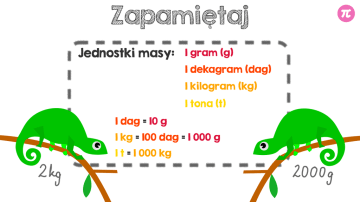 Zapamiętaj Jednostki masy: 1 gram (g) 1 dekagram (dag) 1 kilogram (kg) 1 tona (t) 1 dag = 10 g 1 kg = 100 dag = 1 000 g 1 t = 1 000 kg