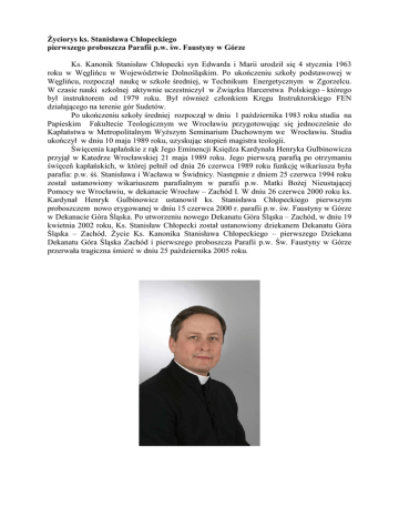 śyciorys ks. Stanisława Chłopeckiego pierwszego proboszcza Parafii p.w. św. Faustyny w Górze Ks. Kanonik Stanisław Chłopecki syn Edwarda i Marii urodził się 4 stycznia 1963 roku w Węglińcu w Województwie Dolnośląskim. Po ukończeniu szkoły podstawowej w Węglińcu, rozpoczął naukę w szkole średniej, w Technikum Energetycznym w Zgorzelcu. W czasie nauki szkolnej aktywnie uczestniczył w Związku Harcerstwa Polskiego - którego był instruktorem od 1979 roku. Był równieŜ członkiem Kręgu Instruktorskiego FEN działającego na terenie gór Sudetów. Po ukończeniu szkoły średniej rozpoczął w dniu 1 października 1983 roku studia na Papieskim Fakultecie Teologicznym we Wrocławiu przygotowując się jednocześnie do Kapłaństwa w Metropolitalnym WyŜszym Seminarium Duchownym we Wrocławiu. Studia ukończył w dniu 10 maja 1989 roku, uzyskując stopień magistra teologii. Święcenia kapłańskie z rąk Jego Eminencji Księdza Kardynała Henryka Gulbinowicza przyjął w Katedrze Wrocławskiej 21 maja 1989 roku. Jego pierwszą parafią po otrzymaniu święceń kapłańskich, w której pełnił od dnia 26 czerwca 1989 roku funkcję wikariusza była parafia: p.w. śś. Stanisława i Wacława w Świdnicy. Następnie z dniem 25 czerwca 1994 roku został ustanowiony wikariuszem parafialnym w parafii p.w. Matki BoŜej Nieustającej Pomocy we Wrocławiu, w dekanacie Wrocław – Zachód I. W dniu 26 czerwca 2000 roku ks. Kardynał Henryk Gulbinowicz ustanowił ks. Stanisława Chłopeckiego pierwszym proboszczem nowo erygowanej w dniu 15 czerwca 2000 r. parafii p.w. św. Faustyny w Górze w Dekanacie Góra Śląska. Po utworzeniu nowego Dekanatu Góra Śląska – Zachód, w dniu 19 kwietnia 2002 roku, Ks. Stanisław Chłopecki został ustanowiony dziekanem Dekanatu Góra Śląska – Zachód. śycie Ks. Kanonika Stanisława Chłopeckiego – pierwszego Dziekana Dekanatu Góra Śląska Zachód i pierwszego proboszcza Parafii p.w. Św. Faustyny w Górze przerwała tragiczna śmierć w dniu 25 października 2005 roku.