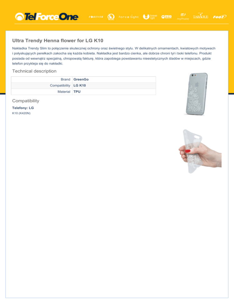Ultra Trendy Henna flower for LG K10 Nakładka Trendy Slim to połączenie skutecznej ochrony oraz świetnego stylu. W delikatnych ornamentach, kwiatowych motywach i połyskujących perełkach zakocha się każda kobieta. Nakładka jest bardzo cienka, ale dobrze chroni tył i boki telefonu. Produkt posiada od wewnątrz specjalną, chropowatą fakturę, która zapobiega powstawaniu nieestetycznych śladów w miejscach, gdzie telefon przykleja się do nakładki. Technical description Brand GreenGo Compatibility LG K10 Material TPU Compatibility Telefony: LG K10 (K420N)