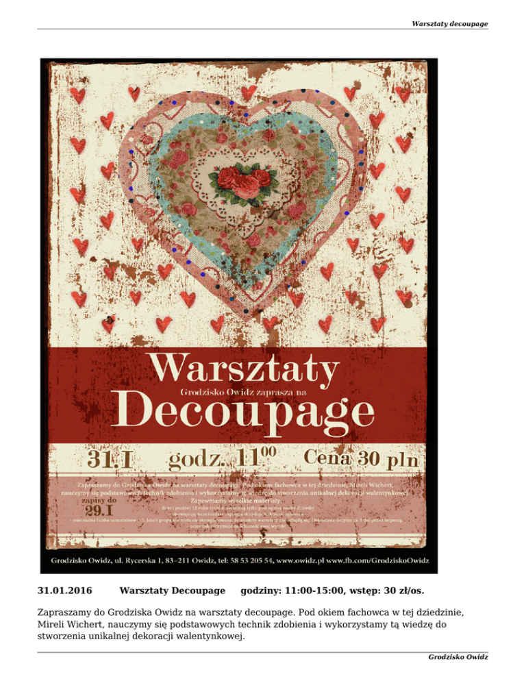Warsztaty decoupage 31.01.2016 Warsztaty Decoupage godziny: 11:00-15:00, wstęp: 30 zł/os. Zapraszamy do Grodziska Owidz na warsztaty decoupage. Pod okiem fachowca w tej dziedzinie, Mireli Wichert, nauczymy się podstawowych technik zdobienia i wykorzystamy tą wiedzę do stworzenia unikalnej dekoracji walentynkowej. Grodzisko Owidz Warsztaty decoupage Zapewniamy wszelkie materiały. - dzieci poniżej 12 roku życia uczestniczą tylko pod opieką osoby dorosłej - obowiązują wcześniejsze zapisy, a decyduje kolejność zgłoszeń - minimalna liczba uczestników: 10. Jeżeli grupa nie zostanie skompletowana, to niestety warsztaty nie odbędą się. Ostateczna decyzja na 3 dni przed imprezą. - uczestnik otrzymuje na własność swój wyrób! Grodzisko Owidz