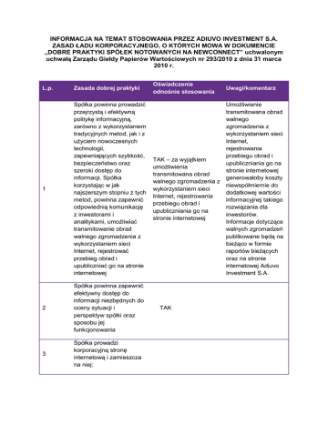 INFORMACJA NA TEMAT STOSOWANIA PRZEZ ADIUVO INVESTMENT S.A. ZASAD ŁADU KORPORACYJNEGO, O KTÓRYCH MOWA W DOKUMENCIE „DOBRE PRAKTYKI SPÓŁEK NOTOWANYCH NA NEWCONNECT” uchwalonym uchwałą Zarządu Giełdy Papierów Wartościowych nr 293/2010 z dnia 31 marca 2010 r. L.p. Zasada dobrej praktyki Oświadczenie odnośnie stosowania 1 Spółka powinna prowadzić przejrzystą i efektywną politykę informacyjną, zarówno z wykorzystaniem tradycyjnych metod, jak i z użyciem nowoczesnych technologii, zapewniających szybkość, bezpieczeństwo oraz szeroki dostęp do informacji. Spółka korzystając w jak najszerszym stopniu z tych metod, powinna zapewnić odpowiednią komunikację z inwestorami i analitykami, umożliwiać transmitowanie obrad walnego zgromadzenia z wykorzystaniem sieci Internet, rejestrować przebieg obrad i upubliczniać go na stronie internetowej Umożliwienie transmitowana obrad walnego zgromadzenia z wykorzystaniem sieci Internet, rejestrowania przebiegu obrad i TAK – za wyjątkiem upubliczniania go na umożliwienia stronie internetowej transmitowana obrad generowałoby koszty walnego zgromadzenia z niewspółmiernie do wykorzystaniem sieci dodatkowej wartości Internet, rejestrowania informacyjnej takiego przebiegu obrad i rozwiązania dla upubliczniania go na inwestorów. stronie internetowej Informacje dotyczące walnych zgromadzeń publikowane będą na bieżąco w formie raportów bieżących oraz na stronie internetowej Adiuvo Investment S.A. 2 Spółka powinna zapewnić efektywny dostęp do informacji niezbędnych do oceny sytuacji i perspektyw spółki oraz sposobu jej funkcjonowania 3 Spółka prowadzi korporacyjną stronę internetową i zamieszcza na niej: TAK Uwagi/komentarz 3.1 podstawowe informacje o spółce i jej działalności (strona startowa) TAK 3.2 opis działalności emitenta ze wskazaniem rodzaju działalności, z której emitent uzyskuje najwięcej przychodów TAK 3.3 opis rynku, na którym działa emitent, wraz z określeniem pozycji emitenta na tym rynku TAK 3.4 życiorysy zawodowe członków organów spółki TAK 3.5 powzięte przez zarząd, na podstawie oświadczenia członka rady nadzorczej, informacje o powiązaniach członka rady nadzorczej z akcjonariuszem dysponującym akcjami reprezentującymi nie mniej niż 5% ogólnej liczby głosów na walnym zgromadzeniu spółki TAK 3.6 dokumenty korporacyjne spółki TAK 3.7 zarys planów strategicznych spółki TAK 3.8 opublikowane prognozy wyników finansowych na bieżący rok obrotowy, wraz z założeniami do tych prognoz (w przypadku gdy emitent takie publikuje). NIE 3.9 strukturę akcjonariatu emitenta, ze wskazaniem głównych akcjonariuszy oraz akcji znajdujących się w wolnym obrocie TAK Emitent nie publikuje prognoz 3.10 dane oraz kontakt do osoby, która jest odpowiedzialna w spółce za relacje inwestorskie oraz kontakty z mediami 3.11 (skreślony) 3.12 opublikowane raporty bieżące i okresowe TAK 3.13 kalendarz zaplanowanych dat publikacji finansowych raportów okresowych, dat walnych zgromadzeń, a także spotkań z inwestorami i analitykami oraz konferencji prasowych TAK 3.14 informacje na temat zdarzeń korporacyjnych, takich jak wypłata dywidendy, oraz innych zdarzeń skutkujących nabyciem lub ograniczeniem praw po stronie akcjonariusza, z uwzględnieniem terminów oraz zasad przeprowadzania tych operacji. Informacje te powinny być zamieszczane w terminie umożliwiającym podjęcie przez inwestorów decyzji inwestycyjnych TAK 3.15 (skreślony) 3.16 pytanie akcjonariuszy dotyczące spraw objętych porządkiem obrad, zadawane przed i w trakcie walnego zgromadzenia, wraz z odpowiedziami na zadawane pytania TAK TAK 3.17 informację na temat powodów odwołania walnego zgromadzenia, zmiany terminu lub porządku obrad wraz z uzasadnieniem TAK 3.18 informację o przerwie w obradach walnego zgromadzenia i powodach zarządzenia przerwy TAK 3.19 informacje na temat podmiotu, z którym spółka podpisała umowę o świadczenie usług Autoryzowanego Doradcy ze wskazaniem nazwy, adresu strony internetowej, numerów telefonicznych oraz adresu poczty elektronicznej Doradcy TAK 3.20 informację na temat podmiotu, który pełni funkcję animatora akcji emitenta TAK 3.21 dokument informacyjny (prospekt emisyjny) spółki, opublikowany w ciągu ostatnich 12 miesięcy TAK 3.22 (skreślony) Informacje zawarte na stronie internetowej powinny być zamieszczane w sposób umożliwiający łatwy dostęp do tych informacji. Emitent powinien dokonywać aktualizacji informacji umieszczanych na stronie internetowej. W przypadku pojawienia się nowych, istotnych informacji lub wystąpienia istotnej zmiany informacji TAK umieszczanych na stronie internetowej, aktualizacja powinna zostać przeprowadzona niezwłocznie 4 Spółka prowadzi korporacyjną stronę internetową, według wyboru emitenta, w języku polskim lub angielskim. Raporty bieżące i okresowe powinny być zamieszczane na stronie internetowej co najmniej w tym samym języku, w którym następuje ich publikacja zgodnie z przepisami obowiązującymi emitenta 5 Spółka powinna prowadzić politykę informacyjną ze szczególnym uwzględnieniem potrzeb inwestorów indywidualnych. W tym celu Spółka, poza swoją stroną korporacyjną powinna wykorzystywać indywidualną dla danej spółki sekcję relacji inwestorskich znajdującą na stronie www.GPWInfoStrefa.pl 6 Emitent powinien utrzymywać bieżące kontakty z przedstawicielami Autoryzowanego Doradcy, celem umożliwienia mu prawidłowego wykonywania swoich obowiązków wobec emitenta. Spółka powinna wyznaczyć osobę odpowiedzialną za TAK TAK z wyłączeniem działu relacji inwestorskich na stronie www.GPWInfostrefa.pl TAK W ocenie Spółki bieżąco aktualizowana sekcja relacji inwestorskich prowadzona w ramach korporacyjnej strony internetowej jest wystarczającym źródłem wiedzy dla inwestorów kontakty z Autoryzowanym Doradcą 7 W przypadku, gdy w spółce nastąpi zdarzenie, któr