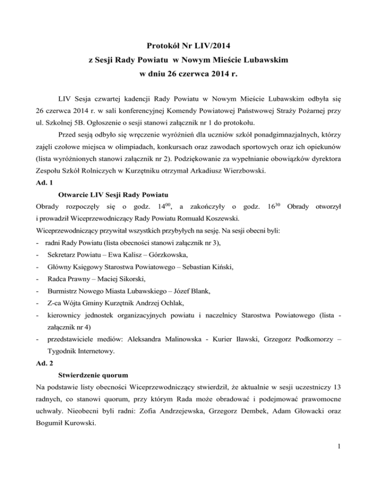 Protokół Nr LIV/2014 z Sesji Rady Powiatu w Nowym Mieście Lubawskim w dniu 26 czerwca 2014 r. LIV Sesja czwartej kadencji Rady Powiatu w Nowym Mieście Lubawskim odbyła się 26 czerwca 2014 r. w sali konferencyjnej Komendy Powiatowej Państwowej Straży Pożarnej przy ul. Szkolnej 5B. Ogłoszenie o sesji stanowi załącznik nr 1 do protokołu. Przed sesją odbyło się wręczenie wyróżnień dla uczniów szkół ponadgimnazjalnych, którzy zajęli czołowe miejsca w olimpiadach, konkursach oraz zawodach sportowych oraz ich opiekunów (lista wyróżnionych stanowi załącznik nr 2). Podziękowanie za wypełnianie obowiązków dyrektora Zespołu Szkół Rolniczych w Kurzętniku otrzymał Arkadiusz Wierzbowski. Ad. 1 Otwarcie LIV Sesji Rady Powiatu Obrady rozpoczęły się o godz. 1400, a zakończyły o godz. 1630 Obrady otworzył i prowadził Wiceprzewodniczący Rady Powiatu Romuald Koszewski. Wiceprzewodniczący przywitał wszystkich przybyłych na sesję. Na sesji obecni byli: - radni Rady Powiatu (lista obecności stanowi załącznik nr 3), - Sekretarz Powiatu – Ewa Kalisz – Górzkowska, - Główny Księgowy Starostwa Powiatowego – Sebastian Kiński, - Radca Prawny – Maciej Sikorski, - Burmistrz Nowego Miasta Lubawskiego – Józef Blank, - Z-ca Wójta Gminy Kurzętnik Andrzej Ochlak, - kierownicy jednostek organizacyjnych powiatu i naczelnicy Starostwa Powiatowego (lista załącznik nr 4) - przedstawiciele mediów: Aleksandra Malinowska - Kurier Iławski, Grzegorz Podkomorzy – Tygodnik Internetowy. Ad. 2 Stwierdzenie quorum Na podstawie listy obecności Wiceprzewodniczący stwierdził, że aktualnie w sesji uczestniczy 13 radnych, co stanowi quorum, przy którym Rada może obradować i podejmować prawomocne uchwały. Nieobecni byli radni: Zofia Andrzejewska, Grzegorz Dembek, Adam Głowacki oraz Bogumił Kurowski. 1 Ad. 3 Powołanie Sekretarza obrad Wiceprzewodniczący zaproponował, aby Sekretarzem obrad był p. Mirosław Galiński. Wiceprzewodniczący zapytał czy radny wyraża zgodę na pełnienie funkcji Sekretarza obrad. Radny Galiński wyraził zgodę. Wiceprzewodniczący zapytał kto z radnych jest za przyjęciem kandydatury radnego na sekretarza obrad. W głosowaniu wzięło udział 13 radnych. Wszyscy głosowali „za”. Ad. 4 Przyjęcie porządku obrad Wiceprzewodniczący poinformował, że radni otrzymali proponowany porządek obrad w materiałach na sesję (załącznik nr 5). Starosta wnioskowała o zdjęcie z porządku obrad uchwały w sprawie udzielenia pomocy finansowej Gminie Grodziczno z przeznaczeniem na realizację w roku 2014 zadania „Przebudowa drogi gminnej 183011N Mroczenko – Mroczno etap I”. Starosta wyjaśniła, że na razie Rada Gminy Grodziczno nie podjęła uchwały w sprawie udzielenie pomocy finansowej dla powiatu. Jeżeli Rada Gminy podejmie stosowną uchwałę, uchwała Rady Powiatu wróci na sesję lipcową. Wiceprzewodniczący poinformował, że wpłynął również wniosek Zarządu o rozszerzenie porządku obrad. Wiceprzewodniczący odczytał pismo (załącznik nr 6). Wiceprzewodniczący zapytał czy ktoś ma uwagi, pytania do zgłoszonych wniosków o zmianę porządku obrad. Radny Tomasz Szczepański zapytał czy problem wynika z braku porozumienia co do kwoty. Starosta powiedziała, że należy poczekać aż Rada Gminy podejmie uchwałę, tym bardziej, że była już sytuacją z inwestycją na drodze Boleszyn – Wlk. Leźno, kiedy trzeba było prosić Urząd Marszałkowski o przesunięcie terminu realizacji inwestycji. Porozumienie i realizacja zadania są nadal aktualne, chodzi tylko o przesunięcie uchwały na następną sesję i p. Wójt o tym wie. Wiceprzewodniczący zaproponował, aby w miejsce zdjętego punktu wstawić nową uchwałę. Propozycję przyjęto. Wiceprzewodniczący odczytał porządek obrad po zmianach: 1. 2. 3. 4. 5. Otwarcie LIV Sesji Rady Powiatu. Stwierdzenie quorum. Powołanie Sekretarza obrad. Przyjęcie porządku obrad. Przyjęcie protokołu z LIII Sesji Rady Powiatu. 2 6. Przedstawienie informacji nt. działań prowadzonych przez Spółdzielnię Socjalną „Nowy Horyzont” w Mszanowie. 7. Sprawozdanie z prac Zarządu. 8. Wnioski, interpelacje i zapytania radnych. 9. Raport o stanie sanitarnym Powiatu Nowomiejskiego za rok 2013. 10. Przerwa 11. Odpowiedzi na wnioski i zapytania radnych. 12. Podjęcie uchwały w sprawie zmiany uchwały Nr XLVII/364/2013 Rady Powiatu w Nowym Mieście Lubawskim z dnia 19.12.2013 r. w sprawie uchwalenia Wieloletniej Prognozy Finansowej Powiatu Nowomiejskiego na lata 2014 – 2034 oraz uchwał zmieniających: XLIX/383/2014 z dnia 23.01.2014 r., L/400/2014 z dnia 27.02.2014 r., LI/407/2014 z dnia 27.03.2014 r., LII/411/2014 z dnia 23.04.2013 r., LIII/419/2014 z dnia 28.05.2014 r. 13. Podjęcie uchwały w sprawie zmiany uchwały Nr XLVII/365/2013 Rady Powiatu w Nowym Mieście Lubawskim z dnia 19.12.2013 r. w sprawie uchwalenia budżetu powiatu nowomiejskiego na 2014 r. oraz uchwał zmieniających: XLIX/384/2014 z dnia 23.01.2014 r., L/401/2014 z dnia 27.02.2014 r., LI/408/2014 z dnia 27.03.2014 r., LII/412/2014 z dnia 23.04.2014 r., LIII/420/2014 z dnia 28.05.2014 r. 14. Podjęcie uchwały w sprawie zakresu i formy o przebiegu wykonania budżetu powiatu nowomiejskiego za I półrocze 2014r. oraz o kształtowaniu się Wieloletniej Prognozy Finansowej. 15. Podjęcie uchwały w sprawie rozpatrzenia skargi na działalność Starosty Nowomiejskiego. 16. Podjęcie uchwały w sprawie powierzenia Gminie Nowe Miasto Lubawskie z siedzibą w Mszanowie prowadzenia zadań z zakresu zarządzania przystankami komunikacyjnymi. 17. Podjęcie uchwały w sprawie udzielenia pomocy finansowej Gminie Biskupiec z przeznaczeniem na realizację w roku 2014 zadania „ Przebudowa dróg gminnych Szwarcenowo – Wonna – Czachówki oraz Rywałdzik – Mierzyn”. 18. Sprawy różne. 19. Zakończenie obrad LIV Sesji Rady Powiatu. Wiceprzewodniczący zapytał, kto z radnych głosuje za przyjęciem por