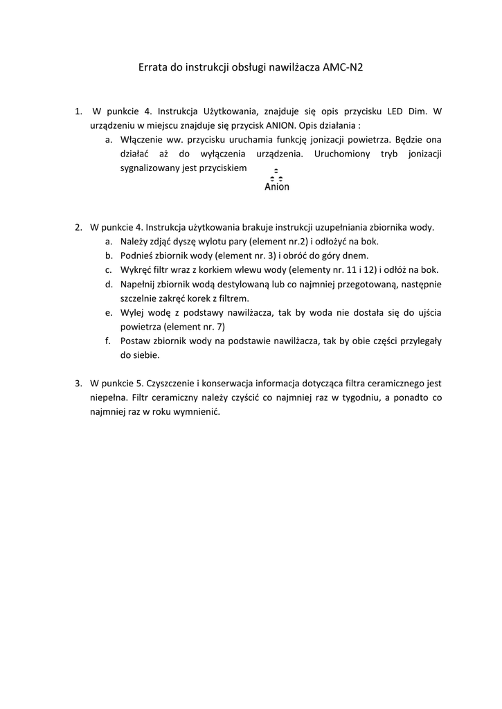 Errata do instrukcji obsługi nawilżacza AMC-N2