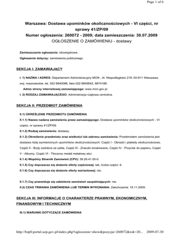 Page 1 of 6 Warszawa: Dostawa upominków okolicznościowych - VI części, nr sprawy 41/ZP/09 Numer ogłoszenia: 260072 - 2009; data zamieszczenia: 30.07.2009 OGŁOSZENIE O ZAMÓWIENIU - dostawy Zamieszczanie ogłoszenia: obowiązkowe. Ogłoszenie dotyczy: zamówienia publicznego. SEKCJA I: ZAMAWIAJĄCY I. 1) NAZWA I ADRES: Departament Administracyjny MON , Al. Niepodległości 218, 00-911 Warszawa, woj. mazowieckie, tel. 022 6840086, faks 022 6840642, 6874189. Adres strony internetowej zamawiającego: www.mon.gov.pl I. 2) RODZAJ ZAMAWIAJĄCEGO: Administracja rządowa centralna. SEKCJA II: PRZEDMIOT ZAMÓWIENIA II.1) OKREŚLENIE PRZEDMIOTU ZAMÓWIENIA II.1.1) Nazwa nadana zamówieniu przez zamawiającego: Dostawa upominków okolicznościowych - VI części, nr sprawy 41/ZP/09. II.1.2) Rodzaj zamówienia: dostawy. II.1.3) Określenie przedmiotu oraz wielkości lub zakresu zamówienia: Przedmiotem zamówienia jest dostawa niŜej wymienionych upominków okolicznościowych: Część I - Obrazki i plakiety okolicznościowe, Część II - Bryły ozdobne ze szkła, Część III - Znaczki emaliowane, Część IV - Przycisk do papieru, Część V - Albumy, Część VI - Tłoczony medal metalowy etui. II.1.4) Wspólny Słownik Zamówień (CPV): 39.29.41.00-0. II.1.5) Czy dopuszcza się złoŜenie oferty częściowej: tak, liczba części: 6. II.1.6) Czy dopuszcza się złoŜenie oferty wariantowej: nie. II.1.7) Czy przewiduje się udzielenie zamówień uzupełniających: nie. II.2) CZAS TRWANIA ZAMÓWIENIA LUB TERMIN WYKONANIA: Zakończenie: 15.11.2009. SEKCJA III: INFORMACJE O CHARAKTERZE PRAWNYM, EKONOMICZNYM, FINANSOWYM I TECHNICZNYM III.1) WARUNKI DOTYCZĄCE ZAMÓWIENIA http://bzp0.portal.uzp.gov.pl/index.php?ogloszenie=show&pozycja=260072&rok=20... 2009-07-30 Page 2 of 6 Informacja na temat wadium: Zamawiający nie przewiduje wnoszenia przez Wykonawców wadium III.2) WARUNKI UDZIAŁU Opis warunków udziału w postępowaniu oraz opis sposobu dokonywania oceny spełniania tych warunków: 1. O udzielenie zamówienie mogą ubiegać się Wykonawcy, którzy: 1) spełniają warunki zawarte w art. 22 ust. 1 ustawy prawo zamówień publicznych zwanej dalej ustawą; 2) nie podlegają wykluczeniu z postępowania o udzielenie zamówienia (art. 24 ust. 1 i 2 ustawy). 2. Ocena spełniania ww. warunków dokonana zostanie zgodnie z formułą spełnia - nie spełnia, w oparciu o informacje zawarte w dokumentach i oświadczeniach złoŜonych przez Wykonawców. Z treści załączonych dokumentów musi wynikać jednoznacznie, iŜ ww. warunki Wykonawca spełnił. 3. Niespełnienie chociaŜby jednego z ww. warunków skutkować będzie wykluczeniem Wykonawcy z postępowania. 4. Wykonawcy mogą wspólnie ubiegać się o udzielenie zamówienia. Wykonawcy występujący wspólnie muszą ustanowić pełnomocnika (spośród siebie) do reprezentowania ich w postępowaniu o udzielenie niniejszego zamówienia lub do reprezentowania ich w postępowaniu oraz zawarcia umowy o udzielenie przedmiotowego zamówienia publicznego. Uwaga: treść pełnomocnictwa powinna dokładnie określać zakres umocowania. Informacja o oświadczeniach i dokumentach, jakie mają dostarczyć wykonawcy w celu potwierdzenia spełniania warunków udziału w postępowaniu: Wykonawca składa oświadczenia i dokumenty: 1) wypełniony i podpisany formularz ofertowy, zgodnie z Załącznikiem nr 1 do SIWZ; 2) oświadczenie o spełnieniu warunków udziału w postępowaniu, zgodnie z Załącznikiem nr 2 do SIWZ; 3) aktualny odpis z właściwego rejestru albo zaświadczenie o wpisie do ewidencji gospodarczej, jeŜeli odrębne przepisy wymagają wpisu do rejestru lub zgłoszenia do ewidencji działalności gospodarczej wystawione nie wcześniej niŜ 6 miesięcy przed upływem terminu składania ofert (w formie oryginału lub kserokopii poświadczonej za zgodność z oryginałem przez Wykonawcę); 4) umowa spółki cywilnej, jeŜeli działalność gospodarcza jest prowadzona w formie spółki cywilnej (w formie oryginału lub kserokopii poświadczonej za zgodność z oryginałem przez Wykonawcę); 5) formularz cenowy, zgodnie z Załącznikiem nr 3 do SIWZ; 6) informację o części zamówienia, którą Wykonawca zamierza powierzyć podwykonawcom zgodnie z art. 36 ust 4 ustawy. 2. KaŜdy z Wykonawców wspólnie ubiegających się o udzielenie zamówienia musi oddzielnie udokumentować, Ŝe nie podlega wykluczeniu na podstawie art. 24 ust. 1 pkt 1-9 ustawy. 3. Zamawiający informuje, iŜ zgodnie z art. 96 ust. 3 ustawy oferty składane w postępowaniu o zamówienie publiczne są jawne i podlegają udostępnieniu od chwili ich otwarcia, z wyjątkiem informacji stanowiących tajemnicę przedsiębiorstwa w rozumieniu przepisów o zwalczaniu nieuczciwej konkurencji, jeśli Wykonawca, nie później niŜ w terminie składania ofert, zastrzegł, Ŝe nie mogą one być udostępniane. Przez tajemnicę przedsiębiorstwa w rozumieniu art. 11 ust. 4 ustawy z dnia 16 kwietnia 1993 r. o zwalczaniu nieuczciwej konkurencji (tekst jednolity: Dz. U. z 2003 r., Nr 153, poz. 1503 z późn. zm.) rozumie się nieujawnione do wiadomości publicznej informacje techniczne, technologiczne, organizacyjne przedsiębiorstwa lub inne informacje posiadające wartość gospodarczą, co do których przedsiębiorca podjął niezbędne działania w celu zachowania ich poufności, tzn. zastrzegł http://bzp0.portal.uzp.gov.pl/index.php?ogloszenie=show&pozycja=260072&rok=20... 2009-07-30 Page 3 of 6 składając ofertę, iŜ nie mogą być one udostępnione innym uczestnikom postępowania. Stosowne zastrzeŜenie Wykonawca winien złoŜyć na formularzu ofertowym. W przeciwnym razie cała oferta zostanie ujawniona na Ŝyczenie kaŜdego uczestnika postępowania. Zamawiający zaleca, aby informacje zastrzeŜone jako tajemnica przedsiębiorstwa były przez Wykonawcę złoŜone w oddzielnej wewnętrznej kopercie z oznakowaniem tajemnica przedsiębiorstwa, lub spięte (zszyte) oddzielnie od pozostałych, j
