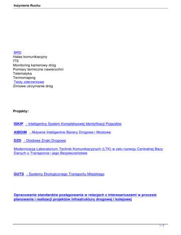 Inżynieria Ruchu BRD Hałas komunikacyjny ITS Monitoring kamerowy dróg Pomiary termiczne nawierzchni Telematyka Termomaping Testy zderzeniowe Zimowe utrzymanie dróg Projekty: ISKIP - Inteligentny System Kompleksowej Identyfikacji Pojazdów AIBDiM - Aktywne Inteligentne Bariery Drogowe i Mostowe DZD - Diodowe Znaki Drogowe Modernizacja Laboratorium Technik Komunikacyjnych (LTK) w celu rozwoju Centralnej Bazy Danych o Transporcie i jego Bezpieczeństwie GUTS - Systemy Ekologicznego Transportu Miejskiego Opracowanie standardów postępowania w relacjach z interesariuszami w procesie planowania i realizacji projektów infrastruktury drogowej i kolejowej 1/2 Inżynieria Ruchu Nowa generacja barier ochronnych zwiększających poziom bezpieczeństwa w ruchu drogowym - Nowoczesność na skrzyżowaniu - wywiad z mgr. inż. Leszkiem Kornalewskim dla Radia Kraków w magazynie "Radiostrada". - Zapraszamy do lektury wywiadu poświęconego projektowi ISKIP, którego udzielił mgr inż. Tadeusz Dzienis z Instytutu Badawczego Dróg i Mostów. - Zachęcamy do zapoznania się z informacjami dotyczącymi zorganizowanego przez Instytut Badawczy Dróg i Mostów seminarium poświęconego Aktywnym Inteligentnym Barierom Drogowym i Mostowym AIBDiM . - Zapraszamy do lektury artykułu na temat projektu ISKIP, zamieszczonego w serwisie PAP "Nauka w Polsce". - Polecamy wypowiedź mgr. inż. Michała Karkowskiego dla portalu TVN Warszawa na temat odcinkowego pomiaru prędkości. - Polskie Radio o sposobach na piratów drogowych. Wywiad z mgr. inż. Michałem Karkowskim. - Co potrafią setki kamer przy naszych drogach? Artykuł w portalu Wirtualna Polska o ISKIP. - Inteligentna kontrola - wywiad z mgr. inż. Michałem Karkowskim na temat ISKIP - Polskie inteligentne bariery drogowe zwiększą bezpieczeństwo samochodów - artykuł na temat projektu AIBDiM w serwisie PAP "Nauka w Polsce" - System Red Light czuwa nad przejściami - wdrożenia systemu ISKIP w Ostrołęce - Europejski Magazyn Plus - wywiad z Michałem Karkowskim i Jackiem Trzeszkowskim na temat Aktywnych Inteligentnych Barier Drogowych i Mostowych 2/2