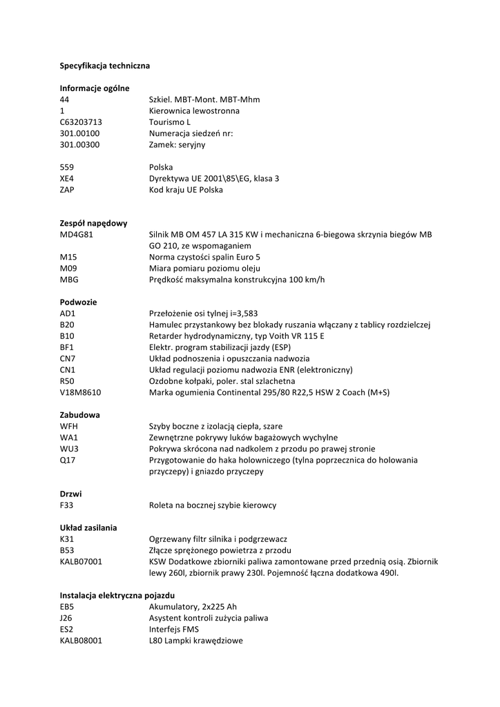 Specyfikacjatechniczna Informacjeogólne 44 Szkiel.MBT-Mont.MBT-Mhm 1 Kierownicalewostronna C63203713 TourismoL 301.00100 Numeracjasiedzeńnr: 301.00300 Zamek:seryjny 559 Polska XE4 DyrektywaUE2001\85\EG,klasa3 ZAP KodkrajuUEPolska Zespółnapędowy MD4G81 SilnikMBOM457LA315KWimechaniczna6-biegowaskrzyniabiegówMB GO210,zewspomaganiem M15 NormaczystościspalinEuro5 M09 Miarapomiarupoziomuoleju MBG Prędkośćmaksymalnakonstrukcyjna100km/h Podwozie AD1 Przełożenieositylneji=3,583 B20 Hamulecprzystankowybezblokadyruszaniawłączanyztablicyrozdzielczej B10 Retarderhydrodynamiczny,typVoithVR115E BF1 Elektr.programstabilizacjijazdy(ESP) CN7 Układpodnoszeniaiopuszczanianadwozia CN1 UkładregulacjipoziomunadwoziaENR(elektroniczny) R50 Ozdobnekołpaki,poler.stalszlachetna V18M8610 MarkaogumieniaContinental295/80R22,5HSW2Coach(M+S) Zabudowa WFH Szybybocznezizolacjąciepła,szare WA1 Zewnętrznepokrywylukówbagażowychwychylne WU3 Pokrywaskróconanadnadkolemzprzodupoprawejstronie Q17 Przygotowaniedohakaholowniczego(tylnapoprzecznicadoholowania przyczepy)igniazdoprzyczepy Drzwi F33 Roletanabocznejszybiekierowcy Układzasilania K31 Ogrzewanyfiltrsilnikaipodgrzewacz B53 Złączesprężonegopowietrzazprzodu KALB07001 KSWDodatkowezbiornikipaliwazamontowaneprzedprzedniąosią.Zbiornik lewy260l,zbiornikprawy230l.Pojemnośćłącznadodatkowa490l. Instalacjaelektrycznapojazdu EB5 Akumulatory,2x225Ah J26 Asystentkontrolizużyciapaliwa ES2 InterfejsFMS KALB08001 L80Lampkikrawędziowe Stanowiskokierowcy C27 FA3 FN1 E33 KB0926001 W07 JR4 J53 JT4 EKS E13 FZ7 F30 SI1 SP5 097060020 097070020 097075020 097080020 S83 S84 SN1 SF5 Klaksonpneumatycznyprod.Hellauruchamianyelektrycznie Lusterkogłówneidodatkowozewnętrzne,ogrzewane,główneregulowane elektrycznieiskładanemechanicznie Lusterkoawaryjneobustronne Mikrofonręcznywtablicyrozdzielczej KSW.InstalacjazgniazdemdodatkowegomikrofonunasłupkuBpoprawej stronie Centralnyzamekpokrywlukubagażowego(osobnopolewejiprawej stronie),zprzełącznikiemnatabl.rozdzielczej Akustycznysygnałostrzegawczyprzywłączonymbieguwstecznym(możliwe odłączenie) Systemppoż.zprzewodemdetekcyjnymdomonitorowaniakomorysilnika Tachografcyfrowy(DTCO) GniazdoUSBzfunkcjąładowania(10,5W/2,1A)dlamałychurządzeń elektronicznychnp.dlakomórki Gniazdozapalniczkowi24V,natablicyrozdzielczej Immobilizerwkluczyku Roletaprzeciwsłonecznanaszybieprzedniej,uruchomianaelektrycznie FotelkierowcyISRI6860/875,obrotowy,regulowanytłumikdrgańwpionie, regulacjaoparcia,bezstopniowaregulacjawysokościzfunkcjąpamięci, regulacjagłębokościpoduszkisiedzenia,regulacjawpoziomie,zintegrowany 3-punktowypasbezpieczeństwa,regulacjakątapochylenia,regulacja barkowa,szybkieobniżanie,zintegrowanyukładpneumatycznydo dopasowaniakonturuoparcia. Tapicerkafotelakierowcy -siedziskoioparcie kolor:tomek Mat.-Nr.:4889 -obszycieboczne: kolor:anthrazit Mat.Nr.:7302 -częściboczne kolor:anthrazit Mat.-Nr.:7302 -tyłoparcia: kolor:anthrazit Mat.-Nr.:7302 Siedziskoioparciekierowcyztkaniny Częściboczneztkaniny Bocznaczęśćoparciakierowcyzmateriału Tylnaczęśćoparciaztkaniny Podłokietnikfotelakierowcyzlewej Podłokietnikfotelakierowcyzprawej Siedzeniepilota1-miejscowe(po-str.przejścia)zpodłokietnikiem,pasem3punktowym,składane Tapicerowaniefotelapilotaodmienne -siedziskoioparcie: kolor:tomek Mat.-Nr.:4889 -boki: kolor:anthrazit Mat.-Nr.:7302 -tyłoparcia: kolor:anthrazit Mat.-Nr.:7302 097220020 Siedziskoioparciefotelapilotazmateriału 097230020 Częścibocznefotelapilotazmateriału 097240020 Tylna/bocznaczęśćoparciapilotazmateriału Klima/ogrzewanie/wentyl. HK3 Układklimatyzacjinadachu35KWzautomatykąklimatyzacjiidodatkową klimatyzacjąstanowiskakierowcy H09 Ogrzewaniekonwektorowenaścianachbocznych Elementyzabudowy VF2 Schowekwielofunkcyjnyzawejściemśrodkowym V11 Toaletawodna(WC),podpodłogąprzeddrzwiamiśrodkowymi VM5 Pojemniknaodpadkizbokuprzytoalecieśrodkowej KB1130001 KSW:ZabudowakuchnipokładowejFRENZLFOB519 V24 Lodówkazprzodupoprawejstronie Siedzenia UBM SiedzeniaMercedes-BenzRavelStarXtra(TSX2) U60 Układfoteli1/60 UG8 Siedzisko,wwersjidługiej UVM Tapicerkazosobnątkaninąnastronętylnąoparciaiczęściboczne 124600010 Tapicerkafotelipasażerskich Siedzisko,oparcieiczęściboczne: kolor:tomek Mat.-Nr.:4889 tyłoparcia: kolor:anthrazit Mat.-Nr.:7302 124700020 Siedziskoioparcieztkaniny 125300020 Tylnaczęśćoparciaztkaniny UNA 60 Tapicerkazagłówkazeskórynaturalnej 125451010 Kolorystykaobszycia kolor:gelb Mat.-Nr.:1926 UWX 60 Obszyciekrawędzifotelipasażerskichzweluru 125651010 Kolorystykaobszycia kolor:gelb Mat.-Nr.:4695 UG4 Oparciafotelipasażerskichregulowane UTA Podłokietnikzintegrowany,odstronyprzejścia,obrotowy S77 2-punktowypasbezpieczeństwaprzywszystkichsiedzeniachpasażerskich U74 Fotelpasażerskiodstr.przejściabocznieregulowany UT3 53 Stolikskładany,przymocowanydotylnejczęścioparciafotelapasażera U71 Siatkanabagaż,natylnejczęścioparciainaściancedziałowej UTG Uchwytzintegrowanynaoparciu,odstronyprzejściaiodstronyściany UTT 53 Haczyknatorbęprzyzintegrowanymuchwycie UVC Numeracjasiedzeń,wersja1,liczbyod1doXkolejnodlawszystkichmiejsc siedzących Układyinformacji ERB Instalacjaaudio-/videoprod.BoschProfessional,Line3,odtwarzacznaCDi DVD,zosobnymprogramemipilotem.ŁączeUSB(MP3/WMA) E54 Głośniki:po7sztpolewejiprawejstronie E74 Panelsygn.pasażerskiejzprzyciskiemnadkażdympodwójnymsiedzeniemz żądaniemSTOPiblokadąpowtórzenia,przyciskwzywaniapilotazlampką sygnalizac.nadkażdympodwójnymsiedzeniem KALB13001 KSW:Możliwośćzamontowaniamonitora19”nastałezprzodu- przygotowanieelektryczneimechaniczne KALB13002 KSW:Możliwośćzamontowaniamonitora19”nastałepośrodku- przygotowanieelektryczneimechaniczne Wyposażeniewnętrzainne Y46 Zestawnarzędzikompletny L27 Lampkaprzysiedzeniuobokkierowcy,poprawejstronie,nasłupkuA V55 Linkadozagrodzeniaśrodkowegoprzejściazakierowcą V49 Półkanaściankachdziałowychz2uchwytaminakubki V59 Poręczpolewejstronieprzypółcenabaga