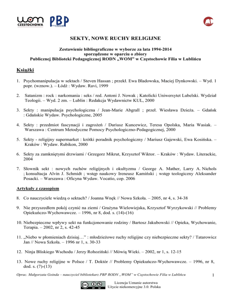 SEKTY, NOWE RUCHY RELIGIJNE Zestawienie bibliograficzne w wyborze za lata 1994-2014 sporządzone w oparciu o zbiory Publicznej Biblioteki Pedagogicznej RODN „WOM” w Częstochowie Filia w Lublińcu Książki 1. Psychomanipulacja w sektach / Steven Hassan ; przekł. Ewa Bladowska, Maciej Dynkowski. – Wyd. 1 popr. (wznow.). – Łódź : Wydaw. Ravi, 1999 2. Satanizm : rock : narkomania : seks / red. Antoni J. Nowak ; Katolicki Uniwersytet Lubelski. Wydział Teologii. – Wyd. 2 zm. – Lublin : Redakcja Wydawnictw KUL, 2000 3. Sekty : manipulacja psychologiczna / Jean-Marie Abgrall ; przeł. Wiesława Dzieża. – Gdańsk : Gdańskie Wydaw. Psychologiczne, 2005 4. Sekty : przedmiot fascynacji i zagrożeń / Dariusz Kuncewicz, Teresa Opolska, Maria Wasiak. – Warszawa : Centrum Metodyczne Pomocy Psychologiczno-Pedagogicznej, 2000 5. Sekty - religijny supermarket : krótki poradnik psychologiczny / Mariusz Gajewski, Ewa Kosińska. – Kraków : Wydaw. Rubikon, 2000 6. Sekty za zamkniętymi drzwiami / Grzegorz Mikrut, Krzysztof Wiktor. – Kraków : Wydaw. Literackie, 2004 7. Słownik sekt : nowych ruchów religijnych i okultyzmu / George A. Mather, Larry A. Nichols ; konsultacja Alvin J. Schmidt ; wstęp naukowy Ireneusz Kamiński ; wstęp teologiczny Aleksander Posacki. – Warszawa : Oficyna Wydaw. Vocatio, cop. 2006 Artykuły z czasopism 8. Co nauczyciele wiedzą o sektach? / Joanna Wnęk // Nowa Szkoła. – 2005, nr 4, s. 34-38 9. Nie przyszedłem pokój czynić na ziemi / Grażyna Wielowiejska, Krzysztof Wyrzykowski // Problemy Opiekuńczo-Wychowawcze. – 1996, nr 8, dod. s. (14)-(16) 10. Niebezpieczne wpływy sekt na funkcjonowanie rodziny / Bartosz Jakubowski // Opieka, Wychowanie, Terapia. – 2002, nr 2, s. 42-45 11. „Niebo w płomieniach dzisiaj…” : młodzieżowe ruchy religijne czy niebezpieczne sekty? / Tatarowicz Jan // Nowa Szkoła. – 1996 nr 1, s. 30-33 12. Ninja Bliskiego Wschodu / Jerzy Rohoziński // Mówią Wieki. – 2002, nr 1, s. 12-15 13. Nowe ruchy religijne w Polsce / T. Doktór // Problemy Opiekuńczo-Wychowawcze. – 1996, nr 8, dod. s. (7)-(13) Oprac. Małgorzata Goinda – nauczyciel bibliotekarz PBP RODN „WOM” w Częstochowie Filia w Lublińcu Licencja Uznanie autorstwa Użycie niekomercyjne 3.0. Polska 1 14. Psychospołeczne aspekty patologii społecznych w Polsce / Czesław Cekiera // Problemy Alkoholizmu. – 2001 , nr 1, s. 4-8 15. Sekta - jej istota, przejawy i metody działania / Jarosław Gara // Opieka, Wychowanie, Terapia. – 2002, nr 2, s. 39-41 16. Sekty - etiologia powstania i rozwoju / Joanna Katarzyna Frankowiak // Nowa Szkoła. – 2008, nr 4, s. 42-48 17. Sekty - zagrożenia i pułapki : zestawienie bibliograficzne w wyborze za lata 1994-2004 (I półrocze) / oprac. Teresa Biegun // Biblioteka w Szkole. - 2004, [nr] 10, s. 26-27 18. Sekty - zagrożenie nie tylko dla młodzieży / Tomasz Franc ; rozm. przepr. Roma Kwiecińska // Nowa Szkoła. – 2002, nr 6, s. 44-49 19. Sekty / Ewa Matysiak // Częstochowski Biuletyn Oświatowy. – 1997, nr 2, s. 80-83 20. Sekty / J. Makowska // Problemy Opiekuńczo-Wychowawcze. – 1994, nr 5, dod. s. (4)-(6) 21. Sekty : wybrane mechanizmy psychomanipulacji / Marta Rubaj // Nowa Szkoła. – 2002, nr 2, s. 47-52 22. Sekty i zagrożenia z nimi związane / Eugenia Ewa Mandal // Chowanna. – 1998, t. 1, s. 18-23 23. Sekty w szkole? / Janusz Bujak // Problemy Narkomanii. – 2005, nr 4, s. 73-76 24. Subkultury młodzieżowe : sataniści / Czesław Cekiera // Problemy Alkoholizmu. – 1994, nr 7, dod. s. IV-VII 25. Współczesne sekty i ich zagrożenia : zestawienie bibliograficzne w wyborze / oprac. Józefa Drozdowska // Poradnik Bibliotekarza. - 2001, [nr] 11, s. 32-34 Oprac. Małgorzata Goinda – nauczyciel bibliotekarz PBP RODN „WOM” w Częstochowie Filia w Lublińcu Licencja Uznanie autorstwa Użycie niekomercyjne 3.0. Polska 2