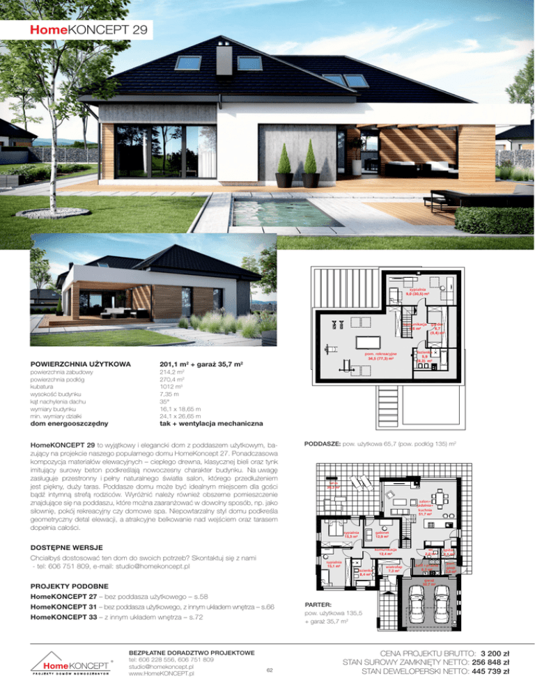HomeKONCEPT 29 sypialnia 9,0 (30,5) m² komunikacja 9,6 m² POWIERZCHNIA UŻYTKOWA pom. rekreacyjne 34,5 (77,3) m² 201,1 m + garaż 35,7 m 2 2 garder . 6,7 (9,4) m² łazienka 5,9 (8,3) m² powierzchnia zabudowy 214,2 m2 powierzchnia podłóg 270,4 m2 kubatura1012 m3 wysokość budynku 7,35 m kąt nachylenia dachu 35° wymiary budynku 16,1 x 18,65 m min. wymiary działki 24,1 x 26,65 m dom energooszczędny tak + wentylacja mechaniczna HomeKONCEPT 29 to wyjątkowy i elegancki dom z poddaszem użytkowym, bazujący na projekcie naszego popularnego domu HomeKoncept 27. Ponadczasowa kompozycja materiałów elewacyjnych – ciepłego drewna, klasycznej bieli oraz tynk imitujący surowy beton podkreślają nowoczesny charakter budynku. Na uwagę zasługuje przestronny i pełny naturalnego światła salon, którego przedłużeniem jest piękny, duży taras. Poddasze domu może być idealnym miejscem dla gości bądź intymną strefą rodziców. Wyróżnić należy również obszerne pomieszczenie znajdujące się na poddaszu, które można zaaranżować w dowolny sposób, np. jako siłownię, pokój rekreacyjny czy domowe spa. Niepowtarzalny styl domu podkreśla geometryczny detal elewacji, a atrakcyjne belkowanie nad wejściem oraz tarasem dopełnia całości. PODDASZE: pow. użytkowa 65,7 (pow. podłóg 135) m2 taras 38,3 m² salon+ jadalnia+ kuchnia 51,7 m² sypialnia 15,3 m² DOSTĘPNE WERSJE gabinet 12,9 m² komunikacja 12,4 m² Chciałbyś dostosować ten dom do swoich potrzeb? Skontaktuj się z nami - tel: 606 751 809, e-mail: [email protected] sypialnia 15,1 m² łazienka 8,4 m² PROJEKTY PODOBNE wiatrołap 7,3 m² wc 2,0 m² kotł.+pralnia 5,3 m² spiżar. 2,1 m² pom. gosp. 3,0 m² garaż 35,7 m² HomeKONCEPT 27 – bez poddasza użytkowego – s.58 HomeKONCEPT 31 – bez poddasza użytkowego, z innym układem wnętrza – s.66 HomeKONCEPT 33 – z innym układem wnętrza – s.72 ® BEZPŁATNE DORADZTWO PROJEKTOWE tel: 606 228 556, 606 751 809 [email protected] www.HomeKONCEPT.pl 62 PARTER: pow. użytkowa 135,5 + garaż 35,7 m2 CENA PROJEKTU BRUTTO: 3 200 zł STAN SUROWY ZAMKNIĘTY NETTO: 256 848 zł STAN DEWELOPERSKI NETTO: 445 739 zł