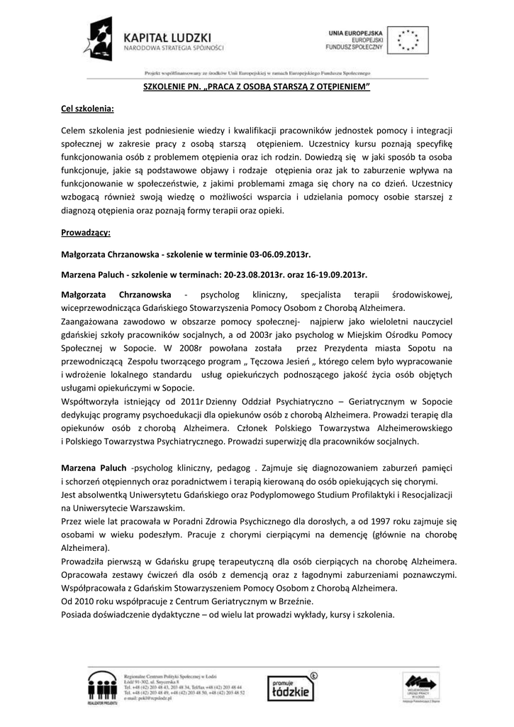 SZKOLENIE PN. „PRACA Z OSOBĄ STARSZĄ Z OTĘPIENIEM” Cel szkolenia: Celem szkolenia jest podniesienie wiedzy i kwalifikacji pracowników jednostek pomocy i integracji społecznej w zakresie pracy z osobą starszą otępieniem. Uczestnicy kursu poznają specyfikę funkcjonowania osób z problemem otępienia oraz ich rodzin. Dowiedzą się w jaki sposób ta osoba funkcjonuje, jakie są podstawowe objawy i rodzaje otępienia oraz jak to zaburzenie wpływa na funkcjonowanie w społeczeństwie, z jakimi problemami zmaga się chory na co dzień. Uczestnicy wzbogacą również swoją wiedzę o możliwości wsparcia i udzielania pomocy osobie starszej z diagnozą otępienia oraz poznają formy terapii oraz opieki. Prowadzący: Małgorzata Chrzanowska - szkolenie w terminie 03-06.09.2013r. Marzena Paluch - szkolenie w terminach: 20-23.08.2013r. oraz 16-19.09.2013r. Małgorzata Chrzanowska - psycholog kliniczny, specjalista terapii środowiskowej, wiceprzewodnicząca Gdańskiego Stowarzyszenia Pomocy Osobom z Chorobą Alzheimera. Zaangażowana zawodowo w obszarze pomocy społecznej- najpierw jako wieloletni nauczyciel gdańskiej szkoły pracowników socjalnych, a od 2003r jako psycholog w Miejskim Ośrodku Pomocy Społecznej w Sopocie. W 2008r powołana została przez Prezydenta miasta Sopotu na przewodniczącą Zespołu tworzącego program „ Tęczowa Jesień „ którego celem było wypracowanie i wdrożenie lokalnego standardu usług opiekuńczych podnoszącego jakość życia osób objętych usługami opiekuńczymi w Sopocie. Współtworzyła istniejący od 2011r Dzienny Oddział Psychiatryczno – Geriatrycznym w Sopocie dedykując programy psychoedukacji dla opiekunów osób z chorobą Alzheimera. Prowadzi terapię dla opiekunów osób z chorobą Alzheimera. Członek Polskiego Towarzystwa Alzheimerowskiego i Polskiego Towarzystwa Psychiatrycznego. Prowadzi superwizję dla pracowników socjalnych. Marzena Paluch -psycholog kliniczny, pedagog . Zajmuje się diagnozowaniem zaburzeń pamięci i schorzeń otępiennych oraz poradnictwem i terapią kierowaną do osób opiekujących się chorymi. Jest absolwentką Uniwersytetu Gdańskiego oraz Podyplomowego Studium Profilaktyki i Resocjalizacji na Uniwersytecie Warszawskim. Przez wiele lat pracowała w Poradni Zdrowia Psychicznego dla dorosłych, a od 1997 roku zajmuje się osobami w wieku podeszłym. Pracuje z chorymi cierpiącymi na demencję (głównie na chorobę Alzheimera). Prowadziła pierwszą w Gdańsku grupę terapeutyczną dla osób cierpiących na chorobę Alzheimera. Opracowała zestawy ćwiczeń dla osób z demencją oraz z łagodnymi zaburzeniami poznawczymi. Współpracowała z Gdańskim Stowarzyszeniem Pomocy Osobom z Chorobą Alzheimera. Od 2010 roku współpracuje z Centrum Geriatrycznym w Brzeźnie. Posiada doświadczenie dydaktyczne – od wielu lat prowadzi wykłady, kursy i szkolenia. SZCZEGÓŁOWY PROGRAM SZKOLENIA PN. „PRACA Z OSOBĄ STARSZĄ Z OTĘPIENIEM” ZAGADNIENIE Problematyka starzenia się CZĘŚĆ TEORETYCZNA Przebieg starzenia się. Starzejący się mózg. Potrzeby ludzi w wieku podeszłym. Straty wynikające z procesu starzenia się. Zaburzenia zachowania u osób w wieku podeszłym. CZĘŚĆ PRAKTYCZNA Zapoznanie ze skalą GDS służącą do oceny poziomu depresji u osób w wieku podeszłym. ILOŚĆ GODZIN 4,5 godziny Wykład – 4 godz. Przedstawienie skali ”Satysfakcji z życia”. Celem tych zajęć jest wykształcenie umiejętności stosowania tych narzędzi w ramach pracy zawodowej. Zajęcia praktyczne – 0,5 godz. Depresja wieku podeszłego. Problematyka samotności oraz samobójstw osób w „późnej dorosłości”. Choroby otępienne /Choroba Alzheimera oraz inne rodzaje otępienia – naczyniopochodne, czołowo – skroniowe, z ciałami Lewy’ego/. Przyczyny, objawy, Problemy pojawiające się w przebiegu otępienia: Przedstawienie MMSE – podstawowego narzędzia - zaburzenia poznawcze przesiewowego służącego do rozpoznania poziomu otępienia. - zaburzenia zachowania - zaburzenia w komunikacji z otoczeniem Przygotowanie uczestników do samodzielnego stosowania testu w ramach własnej pracy. 4,5 godziny Wykład – 4 godz. Zajęcia praktyczne – 0,5 godz. - trudności z samodzielnym funkcjonowaniem. oddziaływania terapeutyczne. Postępowanie diagnostyczne w przypadku podejrzenia otępienia. Człowiek w podeszłym wieku Opieka w warunkach domowych. /w tym chory/ Podopieczny w ramach opieki dziennej. Praca w zespołach – próba zaplanowania optymalnego systemu opieki dla określonych przypadków. 12 godzin Indywidualizacja postępowania wobec podopiecznych /praca na przypadkach/. Ćwiczenia –3 godz. Wykład – 9 godz. w systemie opieki Formy pracy z osobami w wieku podeszłym. Chory w systemie opieki całodobowej. Oddziaływania terapeutyczne w stosunku do: - starszych zdrowych osób - osób chorych (z otępieniem) w wieku podeszłym. Tworzenie scenariuszy zajęć do pracy z osobami w wieku podeszłym. Formy zajęć terapeutycznych /terapia zajęciowa, terapia usprawniająca procesy poznawcze, arteterapia, terapia walidacyjna i inne/. Prezentacja własnych doświadczeń uczestników szkolenia. Strategia komunikacji z pacjentami otępiennymi – program KONTAKT. Metody wsparcia bliskich zajmujących się osobami z demencją w celu zapobiegania wypaleniu opiekunów. HARMONOGRAM SZKOLENIA „PRACA Z OSOBĄ STARSZĄ Z OTĘPIENIEM” Data Godziny zajęć Liczba godzin zajęć Temat zajęć – 16:00 wyjazd z Łodzi - 18:30 Kolacja 8.00 – 9.00 – Śniadanie 9.00 – 10.30 – Zajęcia 10.30 – 10.45 – Przerwa 10.45 – 12.15 – Zajęcia 12.15 – 12.30 – Przerwa 12.30 – 14.00 – Zajęcia 14.00 – 15.00 – Obiad 15.00 – 16. 30 – Zajęcia 18.30 – Kolacja 8.00 – 9.00 – Śniadanie 2 Problematyka starzenia się 2 Problematyka starzenia się 2 Problematyka starzenia się (0,5h) Choroby otępienne (1,5 h) 2 Choroby otępienne 9.00 – 10.30 – Zajęcia 2 Choroby otępien