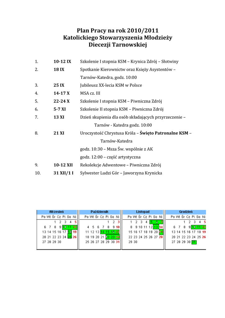 Plan Pracy na rok 2010/2011 Katolickiego Stowarzyszenia Młodzieży Diecezji Tarnowskiej 1. 10-12 IX Szkolenie I stopnia KSM – Krynica Zdrój – Słotwiny 2. 18 IX Spotkanie Kierownictw oraz Księży Asystentów – Tarnów-Katedra, godz. 10:00 3. 25 IX Jubileusz XX-lecia KSM w Polsce 4. 14-17 X MSA cz. III 5. 22-24 X Szkolenie I stopnia KSM – Piwniczna Zdrój 6. 5-7 XI Szkolenie II stopnia KSM – Piwniczna Zdrój 7. 13 XI Dzień skupienia dla osób składających przyrzeczenie – Tarnów - Katedra godz. 10:00 8. 21 XI Uroczystość Chrystusa Króla – Święto Patronalne KSM – Tarnów-Katedra godz. 10:30 – Msza Św. wspólnie z AK godz. 12:00 – część artystyczna 9. 10-12 XII Rekolekcje Adwentowe – Piwniczna Zdrój 10. 31 XII/1 I Sylwester Ludzi Gór – Jaworzyna Krynicka 11. 23 I Spotkanie Opłatkowe KSM DT - Gnojnik 12. 19 II X Turniej Halowej Piłki Nożnej 13. 26 II Spotkanie Kierownictw oraz Księży Asystentów – Stary Sącz - Diecezjalne Centrum Pielgrzymowania im. Jana Pawła II 14. 4-6 III MSA cz. I - Piwniczna Zdrój 15. 1-3 IV Rekolekcje Wielkopostne – Krynica Zdrój – Słotwiny 16. 17 IV Niedziela Palmowa – Tarnów-Katedra 17. 14 V Diecezjalna Pielgrzymka do Zabawy oraz Spotkanie Kierownictw 18. 20-22 V XVI Rajd im. Ks. Walentego Gadowskiego w Beskidzie Sądeckim 19. 3-5 VI MSA cz. II – Piwniczna Zdrój 20. 11 VI Finał XV Edycji Siatkarsko – Koszykarskiej Ligi KSM 21. 22. Wakacje: - Papieskie Dni Młodych - Miasteczko Modlitewne - MSA cz. III - Obozy wakacyjne - Obozy językowe eMKa - Szkolenia Ogólnopolskie KSM - PPT na Jasną Górę 23. 9-11 IX Szkolenie I stopnia KSM - Piwniczna Zdrój 24. 17 IX Spotkanie Kierownictw oraz Księży Asystentów – Tarnów-Katedra 25. 7-9 X MSA cz. I 26. 14-16 X Szkolenie I stopnia KSM – Krynica Zdrój 27. 21-23 X Szkolenie II stopnia KSM – Piwniczna Zdrój 28. 12 XI Dzień skupienia dla osób składających przyrzeczenie – Tarnów-Katedra 29. 20 XI Uroczystość Chrystusa Króla – Święto Patronalne KSM