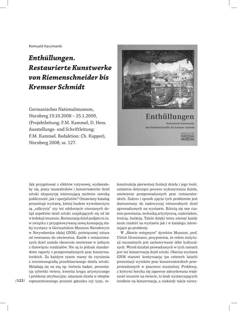 Romuald Kaczmarek Enthüllungen. Restaurierte Kunstwerke von Riemenschneider bis Kremser Schmidt Germanisches Nationalmuseum, Nürnberg 19.10.2008 – 25.1.2009, (Projektleitung: F.M. Kammel, D. Hess. Ausstellungs- und Schriftleitung: F.M. Kammel. Redaktion: Ch. Kupper), Nürnberg 2008, ss. 127. /122/ Jak przygotować z efektów rutynowej, wydawałoby się, pracy muzealników i konserwatorów dzieł sztuki ekspozycję interesującą zarówno szeroką publiczność, jak i specjalistów? Omawiany katalog prezentuje wystawę, której hasłem wywoławczym są „odkrycia” czy też odsłonięcie nieznanych dotąd aspektów dzieł sztuki znajdujących się od lat w kolekcji muzeum. Restaurację dzieł podjęto m.in. w związku z przygotowywaną nową koncepcją stałej wystawy w Germańskim Muzeum Narodowym w Norymberdze (dalej GNM), poświęconej sztuce od renesansu do oświecenia. Każde z restaurowanych dzieł zostało obszernie omówione w jednym z dziewięciu rozdziałów. Nie są to jednak standardowe raporty z przeprowadzonych prac konserwatorskich. Za każdym razem mamy do czynienia z minimonografią przedstawianego dzieła sztuki. Składają się na nią np. historia badań, prezentacja sylwetki twórcy, kwestia kręgu artystycznego i problemy atrybucyjne, ukazanie dzieła w obrębie reprezentowanego przezeń gatunku czy typu, re- konstrukcja pierwotnej funkcji dzieła i jego treść, ustalenia dotyczące procesu wykonywania dzieła, omówienie przeprowadzonych prac restauratorskich. Zakres i sposób ujęcia tych problemów jest dostosowany do nadzwyczaj różnorodnych dzieł zgromadzonych na wystawie. Różnią się one czasem powstania, techniką artystyczną, materiałem, treścią, funkcją. Także dzięki temu niemal każdy może znaleźć na wystawie jak i w katalogu interesujące go problemy. W „Słowie wstępnym” dyrektor Muzeum, prof. Ulrich Grossmann, przypomina, że celem instytucji muzealnych jest zachowywanie dóbr kulturalnych. Wśród działań prowadzonych w tych ramach jest też konserwacja dzieł sztuki. Obecna wystawa GNM stanowi kontynuację (po czterech latach) prezentacji wyników prac konserwatorskich przeprowadzonych w pracowni muzealnej. Problemy, z którymi boryka się zapewne zdecydowana większość muzeów na świecie, to brak wystarczających środków na konserwację, a niekiedy także niewy- Romuald Kaczmarek / Enthüllungen. Restaurierte Kunstwerke von Riemenschneider bis Kremser Schmidt starczalność własnego zespołu konserwatorów. W tym przypadku działania Muzeum wspomogła dotacja fundacji Ernst von Siemens Kunststiftung, nakierowana na wspieranie działań badawczych łączących historię kultury z poznawaniem i stosowaniem technik artystycznych. Takie sprecyzowanie celów niewątpliwie wymusza intensywną współpracę historyków sztuki ze specjalistami od konserwacji dzieł sztuki, a ona, jak widać z omawianego katalogu, przynosi ważne efekty na obu polach. Jako wcale niepowszechnie istniejącą w Niemczech praktykę opisano tu również poradzenie sobie ze szczupłością zespołu konserwatorów zatrudnionych na stałe w Muzeum, który stanął przed zadaniem przeprowadzenia w stosunkowo krótkim czasie pracochłonnych działań na grupie obiektów. Sięgnięto po specjalistów pracujących na własną rękę, poza ramami instytucji muzealnych, a więc i w nieco innych warunkach rynkowych, ze wszystkimi tego konsekwencjami. Dla utrzymania wysokich standardów zarówno w pracy restauratorskiej, jak i badawczej oraz w celu wykorzystania doświadczeń zdobytych na dziełach z muzealnej kolekcji cały ten zespół działał wspólnie w ramach pracowni muzealnej, mając też możliwość stałej, wzajemnej konsultacji i dyskusji. Pierwsze studium poświęcone jest parze wykonanych w naturalnej skali, reliefowych figur św. Katarzyny i św. Jerzego z warsztatu Daniela Maucha (zm. 1539). Ten szwabski snycerz, czynny w Ulm od ok. 1502 do 1529 r., emigrował następnie z rodzinnego miasta w wyniku braku zamówień spowodowanego być może reformatorskimi nastrojami i osiadł w Liège (Leodium), m.in. dzięki pomocy swego wcześniej przybyłego do Niderlandów syna. Wymienione figury trafiły do zbioru muzealnego w 1872 r. jako destrukty i bez określonej proweniencji. Analiza kompozycji i porównanie z kompletnymi nastawami ołtarzowymi warsztatu pozwoliły obecnie jedynie na ustalenie, iż obie płaskorzeźby dekorowały lewe skrzydło ołtarza, który stanowiłby pod względem skali największe ze znanych dotąd dzieł warsztatu Maucha. Ponadto obserwacje technologiczne wskazują na to, że inaczej niż sugerowała to dotychczasowa ekspozycja, pierwotnie obie płaskorzeźby zamontowane były na jednym skrzydle. Badania polichromii pozwoliły z kolei na wysunięcie sugestii, iż przy jej wykonaniu pracować mogli szwabscy malarze spoza Ulm, gdyż dotąd obfite stosowanie w ornamentalnej partii polichromii techniki dekoracji „sgraffitowej” stwierdzano głównie w ośrodkach prowincji szwabskiej. Równie skąpe są informacje o pierwotnych proweniencjach półfigurowego, drewnianego wizerunku Madonny z Dzieciątkiem, wiązanego z warsztatem Tilmana Riemenschneidera. Najważniejszym efektem obecnej pracy nad rzeźbą, prócz propozycji datowania dzieła na późniejszy niż dotąd czas (ok. 1520) i potwierdzenia istnienia usuniętej w XIX w. polichromii, a także korony, jest odkrycie w piersi półfigury otworu o kilkucentymetrowej średnicy. Został on w późniejszym okresie wypełniony. Badacze skłonni są widzieć w nim pierwotne depositorium relikwiowe, a figurę postrzegają w związku z tym jako wizerunek procesyjny. Zbliża to funkcję tej rzeźby do innych półfigurowych przedstawień Madonny i świętych z kręgu Riemenschneidera. Z podobnego czasu jak dwa omówione przykłady pochodzi wczesnorenesansowa grupa rzeźbiarska Marii i Józefa (ze sceny Adoracji Dzieciątka), stanowiąca jeden z elementów niegdysiejszego, monume