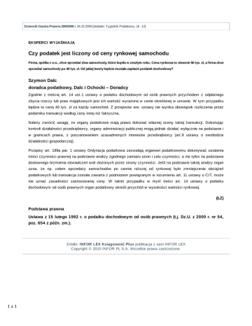 Dziennik Gazeta Prawna 209/2009 z 26.10.2009 [dodatek: Tygodnik Podatkowy, str. 12] EKSPERCI WYJAŚNIAJĄ Czy podatek jest liczony od ceny rynkowej samochodu Firma, spółka z o.o., chce sprzedać dwa samochody, które kupiła w zeszłym roku. Cena rynkowa to obecnie 50 tys. zł, a firma chce sprzedać samochody po 40 tys. zł. Od jakiej kwoty będzie musiała zapłacić podatek dochodowy? Szymon Dalc doradca podatkowy, Dalc i Ochocki – Doradcy Zgodnie z treścią art. 14 ust.1 ustawy o podatku dochodowym od osób prawnych przychodem z odpłatnego zbycia rzeczy lub praw majątkowych jest ich wartość wyrażona w cenie określonej w umowie. W tym przypadku będzie to cena 40 tys. zł za każdy samochód. Z przepisów ww. ustawy nie wynika obowiązek rozliczenia przez podatnika transakcji według ceny innej niż faktyczna. Należy zwrócić uwagę, że organy podatkowe mają prawo dokonać własnej oceny takiej transakcji. Dokonując kontroli działalności przedsiębiorcy, organy administracji publicznej mogą jednak działać wyłącznie na podstawie i w granicach prawa, z poszanowaniem uzasadnionych interesów przedsiębiorcy (art.9 ustawy o swobodzie działalności gospodarczej). Przepisy art. 199a par. 1 ustawy Ordynacja podatkowa zezwalają organowi podatkowemu dokonywać ustalenia treści czynności prawnej na podstawie analizy zgodnego zamiaru stron i celu czynności, a nie tylko na podstawie dosłownego brzmienia oświadczeń woli złożonych przez strony czynności. Jeśli na podstawie takiej analizy organ uzna, że np. celem sprzedaży samochodów po cennie niższej od rynkowej było zmniejszenie obciążeń podatkowych lub transakcja została zawarta z podmiotem powiązanym w rozumieniu art. 11 ustawy o CIT, może nie uznać zasadności zastosowanej ceny. W takim przypadku w myśl treści art. 14 ustawy o podatku dochodowym od osób prawnych organ podatkowy określi przychód w wysokości wartości rynkowej. (ŁZ) Podstawa prawna Ustawa z 15 lutego 1992 r. o podatku dochodowym od osób prawnych (t.j. Dz.U. z 2000 r. nr 54, poz. 654 z późn. zm.). Zródło: INFOR LEX Księgowość Plus publikacja z serii INFOR LEX Copyright © 2010 INFOR PL S.A. Wszelkie prawa zastrzeżone. 1z1