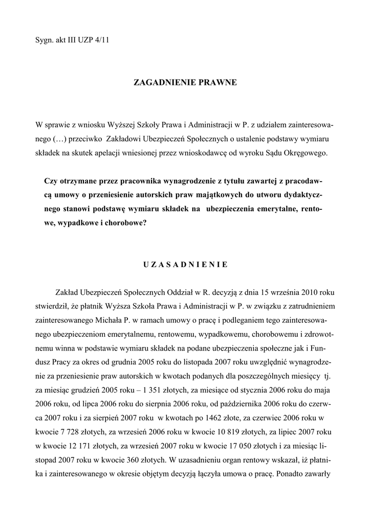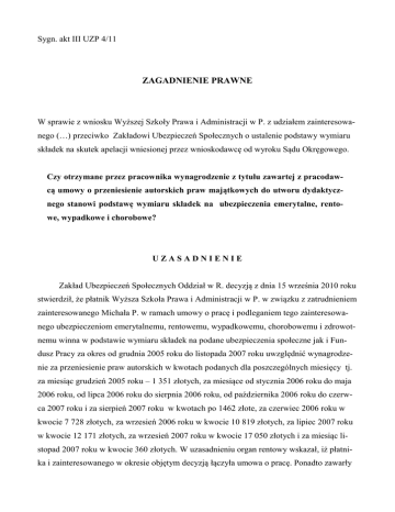 Sygn. akt III UZP 4/11 ZAGADNIENIE PRAWNE W sprawie z wniosku Wyższej Szkoły Prawa i Administracji w P. z udziałem zainteresowanego (…) przeciwko Zakładowi Ubezpieczeń Społecznych o ustalenie podstawy wymiaru składek na skutek apelacji wniesionej przez wnioskodawcę od wyroku Sądu Okręgowego. Czy otrzymane przez pracownika wynagrodzenie z tytułu zawartej z pracodawcą umowy o przeniesienie autorskich praw majątkowych do utworu dydaktycznego stanowi podstawę wymiaru składek na ubezpieczenia emerytalne, rentowe, wypadkowe i chorobowe? UZASADNIENIE Zakład Ubezpieczeń Społecznych Oddział w R. decyzją z dnia 15 września 2010 roku stwierdził, że płatnik Wyższa Szkoła Prawa i Administracji w P. w związku z zatrudnieniem zainteresowanego Michała P. w ramach umowy o pracę i podleganiem tego zainteresowanego ubezpieczeniom emerytalnemu, rentowemu, wypadkowemu, chorobowemu i zdrowotnemu winna w podstawie wymiaru składek na podane ubezpieczenia społeczne jak i Fundusz Pracy za okres od grudnia 2005 roku do listopada 2007 roku uwzględnić wynagrodzenie za przeniesienie praw autorskich w kwotach podanych dla poszczególnych miesięcy tj. za miesiąc grudzień 2005 roku – 1 351 złotych, za miesiące od stycznia 2006 roku do maja 2006 roku, od lipca 2006 roku do sierpnia 2006 roku, od października 2006 roku do czerwca 2007 roku i za sierpień 2007 roku w kwotach po 1462 złote, za czerwiec 2006 roku w kwocie 7 728 złotych, za wrzesień 2006 roku w kwocie 10 819 złotych, za lipiec 2007 roku w kwocie 12 171 złotych, za wrzesień 2007 roku w kwocie 17 050 złotych i za miesiąc listopad 2007 roku w kwocie 360 złotych. W uzasadnieniu organ rentowy wskazał, iż płatnika i zainteresowanego w okresie objętym decyzją łączyła umowa o pracę. Ponadto zawarły one umowy o przeniesienie majątkowych praw autorskich do utworu dydaktycznego tj. wygłoszenia wykładów, opracowania i utrwalenia programu zajęć na dany temat z poszczególnych przedmiotów, opracowania i utrwalenia tematu zadań, sprawdzianów, zaliczeń i egzaminów wraz z ich przeprowadzeniem, dokonanie oceny i recenzji prac pisemnych jak i dyplomowych oraz magisterskich wraz z ich promotorstwem. Za wykonane utwory płatnik zobowiązał się zapłacić honorarium: kwotowe w stosunku do wygłoszonych wykładów i utrwalenia zajęć, a liczone jako iloczyn godzin prac, recenzji, egzaminów i stawki wskazanej w aneksie do umowy wobec pozostałych utworów. Według organu rentowego podane umowy o przeniesieniu majątkowych praw autorskich stanowią w rzeczywistości umowy o dzieło o czym świadczą chociażby zawarte w ich treści sformułowania. W konsekwencji umowy te powodują konieczność stosowania wobec nich treści art. 8 ust. 2a ustawy z dnia 13 października 1998 roku o systemie ubezpieczeń społecznych. Rodzą więc obowiązek opłacenia składek, gdyż każda z nich została podpisana ze swoim pracodawcą i w jej efekcie następuje wykonanie pracy na jego rzecz. Dochód otrzymany z tytułu takiej umowy podlega oskładkowaniu łącznie z dochodem z tytułu stosunku pracy po myśli art. 18a ustawy o systemie ubezpieczeń społecznych. W odwołaniu od podanej decyzji płatnik Wyższa Szkoła Prawa i Administracji w P. wniosła o jej zmianę poprzez stwierdzenie, że płatnik nie miał obowiązku odprowadzania składek na ubezpieczenia społeczne, zdrowotne i Fundusz Pracy od wypłaconych zainteresowanemu w okresie od grudnia 2005 roku do listopada 2007 roku kwot mających swoje źródło w umowach o przeniesienie majątkowych praw autorskich, gdyż zainteresowany z tytułu tych umów nie podlegał ubezpieczeniom społecznym. Odwołująca się zarzuciła organowi rentowemu błędne zakwalifikowanie omów o przeniesienie praw autorskich do utworu dydaktycznego jako umów o dzieło. Niewątpliwie zainteresowany jako nauczyciel akademicki jest twórcą w rozumieniu ustawy o prawach autorskich, a wytwory jego działalności stanowią utwory w rozumieniu tego prawa. Użycie w treści umów sformułowań typu „zamawia” czy „wykonać” nie oznacza zmiany prawnego charakteru zawartych umów. Rozstrzygające znaczenie w tej mierze miała zgodna wola stron, których zamiarem było zawarcie umowy o przeniesieniu praw autorskich. Umowa taka jest odmienna od umów wskazanych w art. 8 ust. 2a ustawy o systemie ubezpieczeń społecznych. Stąd też wynika brak obowiązku opłacenia składek od wynagrodzeń wypłaconych na jej podstawie. Ponadto odwołująca się zauważyła, iż jej stanowisko dotyczące prawnego charakteru podanych umów znalazło swoje potwierdzenie w wynikach kontroli organu rentowego dokonywanych w okresach od 1999 roku do listopada 2005 roku. Organ rentowy wówczas nie kwestionował stosowania wspomnianych umów jak i braku ich oskładkowania. Wystawiał również zaświadczenia o niezaleganiu w opłacaniu składek za okres od listopada 2006 roku do czerwca 2010 roku. To zachowanie utwierdzało płatnika w poglądzie o prawidłowości jego działań. Uzasadnieniem obecnie wydanej decyzji nie mogą być względy natury fiskalnej. Wynika to chociażby ze stanowiska zawartego w orzeczeniu Trybunału Konstytucyjnego z dnia 11 maja 2004 roku w sprawie sygn. akt K 4/03, z którego wynika, iż dokonanie czynności prawnych zgodnych z prawem i przy braku zakazów osiągania celu tych czynności nie może skutkować ich kwalifikowaniem wskazującym osiągnięty cel jako równy z celami zakazanymi przez prawo. Zakład Ubezpieczeń Społecznych Oddział w R. wniósł o oddalenie odwołania podtrzymując swoje stanowisko zawarte w zaskarżonej decyzji i uznając je za w pełni uprawnione dokonanymi ustaleniami i oceną stosowanego prawa. Ponadto organ rentowy zauważył brak podstaw do powoływania się na jego stanowisko zawarte w zaświadczeniach o braku zaległości z tytułu ubezpieczeń, gdyż te ostatnie wydane zostały na podstawie systemu informatycznego na dzień ich wydania i potwierdza