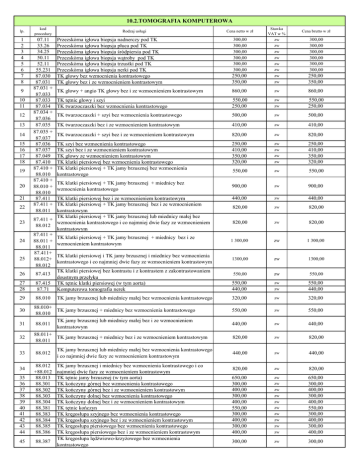 10.2.TOMOGRAFIA KOMPUTEROWA lp. 1 2 3 4 5 6 7 8 9 10 11 12 13 14 15 16 17 18 19 20 21 22 23 24 25 26 27 28 29 30 31 kod procedury 07.11 33.26 34.25 50.11 52.11 55.231 87.030 87.031 87.031 + 87.033 87.033 87.034 87.034 + 87.036 87.035 87.035 + 87.037 87.036 87.037 87.049 87.410 87.410 + 88.010 87.410 + 88.010 + 88.010 87.411 87.411 + 88.011 Rodzaj usługi zw zw 250,00 350,00 TK głowy + angio TK głowy bez i ze wzmocnieniem kontrastowym 860,00 zw 860,00 TK tętnic głowy i szyi TK twarzoczaszki bez wzmocnienia kontrastowego 550,00 250,00 zw zw 550,00 250,00 TK twarzoczaszki + szyi bez wzmocnienia kontrastowego 500,00 zw 500,00 TK twarzoczaszki bez i ze wzmocnieniem kontrastowym 410,00 zw 410,00 TK twarzoczaszki + szyi bez i ze wzmocnieniem kontrastowym 820,00 zw 820,00 TK szyi bez wzmocnienia kontrastowego TK szyi bez i ze wzmocnieniem kontrastowym TK głowy ze wzmocnieniem kontrastowym TK klatki piersiowej bez wzmocnienia kontrastowego TK klatki piersiowej + TK jamy brzusznej bez wzmocnienia kontrastowego 250,00 410,00 350,00 320,00 zw zw 250,00 410,00 350,00 320,00 550,00 zw 550,00 900,00 zw 900,00 440,00 zw 440,00 820,00 zw 820,00 820,00 zw 820,00 1 300,00 zw 1 300,00 1300,00 zw 1300,00 550,00 zw 550,00 550,00 440,00 zw zw 550,00 440,00 320,00 zw 320,00 550,00 zw 550,00 440,00 zw 440,00 820,00 zw 820,00 440,00 zw 440,00 820,00 zw 820,00 650,00 300,00 400,00 300,00 400,00 550,00 300,00 400,00 300,00 400,00 zw zw 650,00 300,00 400,00 300,00 400,00 550,00 300,00 400,00 300,00 400,00 300,00 zw 300,00 TK klatki piersiowej + TK jamy brzusznej + miednicy bez wzmocnienia kontrastowego TK jamy brzusznej lub miednicy małej bez wzmocnienia kontrastowego 88.010+ TK jamy brzusznej + miednicy bez wzmocnienia kontrastowego 88.010 TK jamy brzusznej lub miednicy małej bez i ze wzmocnieniem 88.011 kontrastowym 88.011+ TK jamy brzusznej + miednicy bez i ze wzmocnieniem kontrastowym 88.011 33 88.012 35 36 37 38 39 40 41 42 43 44 88.012 +88.012 88.013 88.301 88.302 88.303 88.304 88.381 88.383 88.384 88.385 88.386 45 88.387 Cena brutto w zł 250,00 350,00 32 34 Stawka VAT w % zw Przezskórna igłowa biopsja nadnerczy pod TK Przezskórna igłowa biopsja płuca pod TK Przezskórna igłowa biopsja śródpiersia pod TK Przezskórna igłowa biopsja wątroby pod TK Przezskórna igłowa biopsja trzustki pod TK Przezskórna igłowa biopsja nerki pod TK TK głowy bez wzmocnienia kontrastowego TK głowy bez i ze wzmocnieniem kontrastowym TK klatki piersiowej bez i ze wzmocnieniem kontrastowym TK klatki piersiowej + TK jamy brzusznej bez i ze wzmocnieniem kontrastowym TK klatki piersiowej + TK jamy brzusznej lub miednicy małej bez 87.411 + wzmocnienia kontrastowego i co najmniej dwie fazy ze wzmocnieniem 88.012 kontrastowym 87.411 + TK klatki piersiowej + TK jamy brzusznej + miednicy bez i ze 88.011 + wzmocnieniem kontrastowym 88.011 87.411+ TK klatki piersiowej i TK jamy brzusznej i miednicy bez wzmocnienia 88.012+ kontrastowego i co najmniej dwie fazy ze wzmocnieniem kontrastowym 88.012 TK klatki piersiowej bez kontrastu i z kontrastem z zakontrastowaniem 87.413 doustnym przełyku 87.415 TK tętnic klatki piersiowej (w tym aorta) 87.71 Komputerowa tomografia nerek 88.010 Cena netto w zł TK jamy brzusznej lub miednicy małej bez wzmocnienia kontrastowego i co najmniej dwie fazy ze wzmocnieniem kontrastowym TK jamy brzusznej i miednicy bez wzmocnienia kontrastowego i co najmniej dwie fazy ze wzmocnieniem kontrastowym TK tętnic jamy brzusznej (w tym aorta) TK kończyny górnej bez wzmocnienia kontrastowego TK kończyny górnej bez i ze wzmocnieniem kontrastowym TK kończyny dolnej bez wzmocnienia kontrastowego TK kończyny dolnej bez i ze wzmocnieniem kontrastowym TK tętnic kończyn TK kręgosłupa szyjnego bez wzmocnienia kontrastowego TK kręgosłupa szyjnego bez i ze wzmocnieniem kontrastowym TK kręgosłupa piersiowego bez wzmocnienia kontrastowego TK kręgosłupa piersiowego bez i ze wzmocnieniem kontrastowym TK kręgosłupa lędźwiowo-krzyżowego bez wzmocnienia kontrastowego 300,00 300,00 300,00 300,00 300,00 300,00 zw zw zw zw zw zw zw zw zw zw zw zw zw zw zw 300,00 300,00 300,00 300,00 300,00 300,00 46 47 88.388 TK kręgosłupa lędźwiowo-krzyżowego bez i ze wzmocnieniem kontrastowym 89.00 TK Konsultacja TK 400,00 zw 400,00 90,00 zw 90,00
