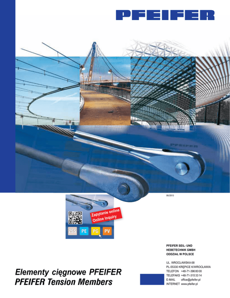 06/2013 line nie on a t y p a Z Inquiry Online ZSS PE PG PV PFEIFER Seil- und Hebetechnik GmbH Oddział w Polsce Elementy cięgnowe PFEIFER PFEIFER Tension Members ul. Wrocławska 68 PL-55330 Krępice k/Wrocławia TELEFON +48-71-396 80 00 Telefaks +48-71-315 33 14 E-MAIL [email protected] INTERNET www.pfeifer.pl Seilbau Cable Structures Elementy cięgnowe PFEIFER PFEIFER Tension Members Konstrukcje cięgnowe znajdują szerokie zastosowanie w budownictwie − zarówno przy budowie nowych obiektów jak i przy remontach starych budynków oraz modernizacji istniejących konstrukcji nośnych. Firma Pfeifer − od wielu lat specjalizująca się w tej dziedzinie − opracowała szeroką gamę produktów, oferujących estetyczne i ekonomiczne rozwiązania dla każdego z tych zastosowań oraz dla różnych rodzajów obciążeń. Wszystkie cięgna marki PFEIFER spełniają najwyższe wymagania techniczne obowiązujące obecnie w Niemczech i Europie oraz posiadają odpowiednie aprobaty. The construction industry uses tension members both in sophisticated new structures and the redevelopment of old buildings or the strengthening of existing load-bearing structures. PFEIFER has been specialising in these applications for many years and has developed a comprehensive range of products that offers an aesthetic and economic solution for any type of application and load range. All PFEIFER tension members respect the currently highest technical requirements and carry respective approvals in Germany and Europe. Systemy produktów PFEIFER PFEIFER Product Systems W zależności od charakteru przedsięwzięcia budowlanego stosuje się różne systemy produktów. Ich cechą wspólną jest dążenie do zapewnienia najwyższej jakości za rozsądną cenę. Systemy produktów PFEIFER spełniają te wymagania zapewniając łatwość projektowania i realizacji. Systemy dzielą się na: In the building industry, different systems are used to suit different applications. The requirement for high quality and economic efficiency is common to all. PFEIFER product systems fulfil these requirements and in addition, enable simple planning and realisation. The systems can be broken down into the following groups: ZSSSystem cięgien prętowych PE liny spiralne otwarte – stal szlachetna PG liny spiralne otwarte – powłoka GALFAN PV liny spiralne zamknięte – powłoka GALFAN ZSS PE PG PV Przykłady różnych zastosowań naszych systemów znajdą Państwo na kolejnych stronach. Jeśli w ramach konkretnego przedsięwzięcia budowlanego potrzebujecie Państwo indywidualnego i skutecznego rozwiązania, nasz zespół doświadczonych specjalistów w każdej chwili służy radą i pomocą techniczną. Chętnie wesprzemy Państwa również pomocą naszego doświadczonego zespołu montażowego. Korzystając z naszego specjalistycznego sprzętu zmontujemy Państwa konstrukcję cięgnową, przy pomocy odpowiednich narzędzi sprężymy i określimy występujące w niej siły. The following pages show examples of various application possi bilities. Should you need a specific individual solution, our team of experienced specialists will be glad to assist you at anytime. Likewise, our experienced installation team would also be pleased to help. We pretension tension members with our own equipment and calculate the forces with devices specifically developed for the purpose. Tension Rod System Open Spiral Strand – Stainless Steel Open Spiral Strand – GALFAN Full Locked Cable – GALFAN Spis treści Content Zastosowania Applications line nie on a t y p a Z Inquiry Online Technika Engineering Karty techniczne Data Sheets Aprobaty Technical Approvals Formularz kontaktowy oraz zamówieniowy Inquiry and order form 2 www.pfeifer.de/seilbau www.pfeifer.de/cable-structures ZSS PE PG PV Find cables and tension rods Szybko i bez trudu znajdziecie for your project quickly and easily. Państwo liny i cięgna prętowe odpowiednie dla Waszej inwestycji! 06/2013 Seilbau Cable Structures Państwa korzyści Your advantages System produktów PFEIFER PFEIFER Product Systems prosty simple n Dostosowany do metod pracy projektanta: n Adapted to the planner’s requirements: Najważniejsza jest nośność konstrukcji! n Uwzględnia najnowsze normy i metody obliczeniowe n Przejrzysty wykaz produktów, przydatne kodowanie load-bearing capacity is fundamental! n The latest standards and assessment concepts are considered kolorystyczne, systematyczne nazewnictwo produktów n Clear depiction, helpful colour coding, systematic product designation wytrzymały capable n Wysokowydajne systemy linowe PFEIFER wymiaro n High-performance PFEIFER cable systems are dimen- wane są na charakterystyczną siłę zrywającą ZB,k sioned to the characteristic value of breaking load ZB,k n Rozsądne stopniowanie wytrzymałości n Sensibly adjusted graduation in performance n Przenoszenie dużych sił przy niewielkich przekrojach n High force transmission achieved with small cross sections szybki quick n Przejrzysty wykaz produktów z kodowaniem n Consistently colour-coded product overview kolorystycznym n znajdowanie odpowiedniego systemu cięgnowego 06/2013 PFEIFER bez czasochłonnego wyszukiwania n No time consuming search. Find the right Cable System with ease 3 Seilbau Cable Structures System cięgien prętowych – Zastosowania The Tension Rod System – Application Przykłady zastosowań systemów cięgien prętowych Application Examples for Tension Rod Systems Aprobowane mocowanie elementów ściskanych Approved compression rod connector Zewnętrzne sprężenie dźwigarów Truss system Odciągi pylonów Pylon bracing 4 06/2013 Cable Structures System cięgien prętowych – Zastosowania The Tension Rod System – Application Seilbau Podwieszenie cięgna zrealizowane na pręcie / na mufie Suspension of the bar / at the coupler Stężenia wiatrowe z blachami węzłowymi Wind bracing with intersection plate 06/2013 5 Seilbau Cable Structures Systemy linowe – Zastosowania 