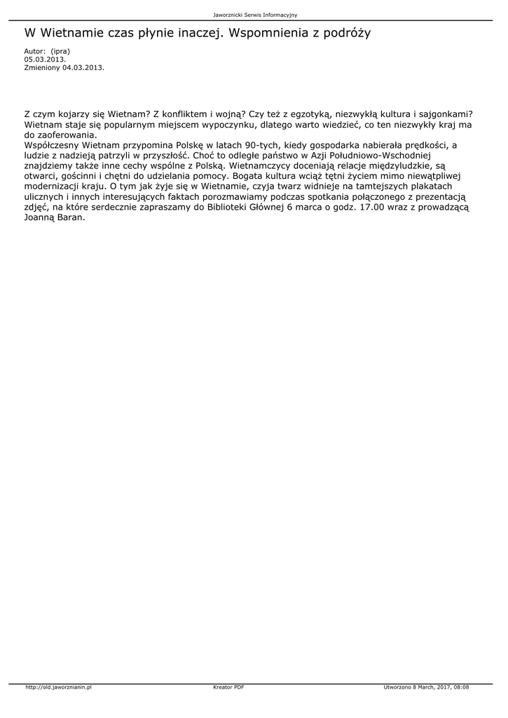 Jaworznicki Serwis Informacyjny W Wietnamie czas płynie inaczej. Wspomnienia z podróży Autor: (ipra) 05.03.2013. Zmieniony 04.03.2013. Z czym kojarzy się Wietnam? Z konfliktem i wojną? Czy też z egzotyką, niezwykłą kultura i sajgonkami? Wietnam staje się popularnym miejscem wypoczynku, dlatego warto wiedzieć, co ten niezwykły kraj ma do zaoferowania. Współczesny Wietnam przypomina Polskę w latach 90-tych, kiedy gospodarka nabierała prędkości, a ludzie z nadzieją patrzyli w przyszłość. Choć to odległe państwo w Azji Południowo-Wschodniej znajdziemy także inne cechy wspólne z Polską. Wietnamczycy doceniają relacje międzyludzkie, są otwarci, gościnni i chętni do udzielania pomocy. Bogata kultura wciąż tętni życiem mimo niewątpliwej modernizacji kraju. O tym jak żyje się w Wietnamie, czyja twarz widnieje na tamtejszych plakatach ulicznych i innych interesujących faktach porozmawiamy podczas spotkania połączonego z prezentacją zdjęć, na które serdecznie zapraszamy do Biblioteki Głównej 6 marca o godz. 17.00 wraz z prowadzącą Joanną Baran. http://old.jaworznianin.pl Kreator PDF Utworzono 8 March, 2017, 08:08
