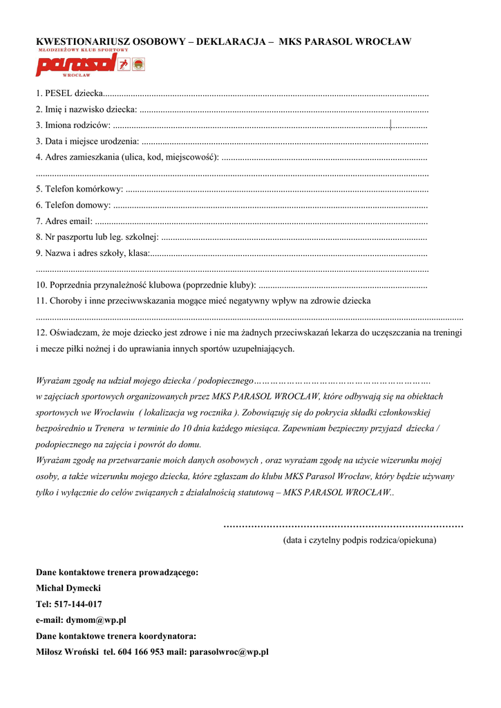 KWESTIONARIUSZ OSOBOWY – DEKLARACJA – MKS PARASOL WROCŁAW 1. PESEL dziecka............................................................................................................................................. 2. Imię i nazwisko dziecka: ............................................................................................................................. 3. Imiona rodziców: ........................................................................................................................................ 3. Data i miejsce urodzenia: ............................................................................................................................ 4. Adres zamieszkania (ulica, kod, miejscowość): ......................................................................................... .......................................................................................................................................................................... 5. Telefon komórkowy: ................................................................................................................................... 6. Telefon domowy: ........................................................................................................................................ 7. Adres email: ................................................................................................................................................ 8. Nr paszportu lub leg. szkolnej: ................................................................................................................... 9. Nazwa i adres szkoły, klasa:........................................................................................................................ .......................................................................................................................................................................... 10. Poprzednia przynależność klubowa (poprzednie kluby): ......................................................................... 11. Choroby i inne przeciwwskazania mogące mieć negatywny wpływ na zdrowie dziecka ......................................................................................................................................................................................... 12. Oświadczam, że moje dziecko jest zdrowe i nie ma żadnych przeciwskazań lekarza do uczęszczania na treningi i mecze piłki nożnej i do uprawiania innych sportów uzupełniających. Wyrażam zgodę na udział mojego dziecka / podopiecznego………………………….……………………………. w zajęciach sportowych organizowanych przez MKS PARASOL WROCŁAW, które odbywają się na obiektach sportowych we Wrocławiu ( lokalizacja wg rocznika ). Zobowiązuję się do pokrycia składki członkowskiej bezpośrednio u Trenera w terminie do 10 dnia każdego miesiąca. Zapewniam bezpieczny przyjazd dziecka / podopiecznego na zajęcia i powrót do domu. Wyrażam zgodę na przetwarzanie moich danych osobowych , oraz wyrażam zgodę na użycie wizerunku mojej osoby, a także wizerunku mojego dziecka, które zgłaszam do klubu MKS Parasol Wrocław, który będzie używany tylko i wyłącznie do celów związanych z działalnością statutową – MKS PARASOL WROCŁAW.. …………………………………………………………………… (data i czytelny podpis rodzica/opiekuna) Dane kontaktowe trenera prowadzącego: Michał Dymecki Tel: 517-144-017 e-mail: [email protected] Dane kontaktowe trenera koordynatora: Miłosz Wroński tel. 604 166 953 mail: [email protected] Regulamin zawodnika: 1. Na trening przychodzę 15 minut przed zajęciami. 2. Przed i po treningu pomagam trenerowi przynieść bądź zanieść sprzęt sportowy (piłki, tyczki, pachołki, krążki). 3. Będąc na boisku przed treningiem nie oddaję strzałów na bramkę, tylko indywidualnie bądź z kolegami rozgrzewam się z piłką. 4. Napój zostawiam przed treningiem za linią boczną, pamiętając, że wszelkie napoje gazowane są zabronione. 5. Spożywam napój tylko w określonych przez trenera przerwach podczas zajęć. 6. Podczas treningu skupiam się na ćwiczeniach, zabawach i grach, pamiętając, że rozmowa z kolegami lub obserwującymi rodzicami nie może mieć miejsca. 7. Po treningu nie zostawiam żadnych śmieci po sobie (puste butelki, reklamówki, itp.), tylko wyrzucam je do pojemnika na śmieci. 8. Obowiązki szkolne (odrabianie lekcji, itp.) staram wykonywać jak najlepiej, gdyż mając problemy w nauce nie będę mógł uczestniczyć w treningach, meczach i turniejach 9. Jeżeli nie jestem pewien godziny rozpoczęcia treningu lub przedmeczowej zbiórki dzwonię do trenera. 10. Jeżeli źle się czuję bądź odczuwam inne dolegliwości, natychmiast informuję o tym trenera. 11. Będąc zawodnikiem klubu Parasol Wrocław nie używam wulgarnych i obraźliwych słów wobec bliskich, i kolegów, gdyż mam szacunek do siebie i wszystkich osób. 12. W miarę możliwości biorę udział w obozach sportowych organizowanych przez Klub, bo chcę doskonalić swoje umiejętności piłkarskie. 13. Jeżeli nie mogę być na treningu, meczu lub turnieju zawsze powiadamiam trenera poprzez sms. NIE PRZESTRZEGANIE REGULAMINU SPOWODUJE NASTĘPUJĄCE KONSEKWENCJE: 1. Trzy upomnienia zawodnika podczas zajęć – skutkują zawieszeniem zawodnika do końca treningu. 2. Złe zachowanie w szkole, bądź problemy z nauką – zawieszenie zawodnika na czas poprawy. 3. Nieobecność na meczu ligowym lub turnieju bez wcześniejszego usprawiedliwienia skutkuje zawieszeniem na kolejny mecz/turniej. Regulamin rodzica: 1. Postaram się dostarczać moje dziecko 15 minut przed treningiem. Opuszczenie rozgrzewki zwiększa ryzyko odniesienia kontuzji. 2. Do 10 dnia bieżącego miesiąca zobowiązuję się do uiszczenia składki członkowskiej według aktualnej stawki w danej grupie bez względu na liczbę obec