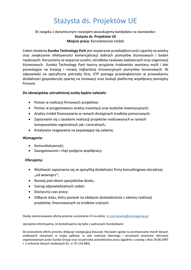 Stażysta ds. Projektów UE W związku z dynamicznym rozwojem poszukujemy kandydata na stanowisko: Stażysta ds. Projektów UE Miejsce pracy: Konstantynów Łódzki Celem działania Eureka Technology Park jest wspieranie przedsiębiorczości opartej na wiedzy oraz zwiększenie efektywności komercjalizacji dobrych pomysłów biznesowych i badań naukowych. Korzystamy ze wsparcia uczelni, ośrodków naukowo-badawczych oraz organizacji biznesowych. Eureka Technology Park tworzy przyjazne środowisko wymiany myśli i idei pozwalające na kreację i rozwój najbardziej innowacyjnych pomysłów biznesowych. W odpowiedzi na specyficzne potrzeby firm, ETP pomaga przedsiębiorcom w prowadzeniu działalności gospodarczej opartej na innowacji oraz buduje platformę współpracy pomiędzy firmami. Do obowiązków zatrudnionej osoby będzie należało: Pomoc w realizacji firmowych projektów; Pomoc w przygotowaniu analizy inwestycji oraz audytów inwestycyjnych; Analizy źródeł finansowania w ramach dostępnych środków pomocowych; Zapoznanie się z zasadami realizacji projektów realizowanych w ramach komponentów regionalnych jak i centralnych; Kreatywne reagowanie na pojawiające się zadania; Wymagania: Komunikatywność; Zaangażowanie i chęć podjęcia współpracy; Oferujemy: Możliwość zapoznania się ze specyfiką działalności firmy konsultingowo-doradczej „od wewnątrz”; Rozwój pod okiem specjalistów działu; Szereg odpowiedzialnych zadań; Elastyczny czas pracy; Odbycie stażu, który pozwoli na zdobycie doświadczenia z zakresu realizacji projektów; finansowanych ze środków unijnych. Osoby zainteresowane ofertą prosimy o przesłanie CV na adres: [email protected] Uprzejmie informujemy, że kontaktujemy się tylko z wybranymi Kandydatami Do przesyłanej oferty prosimy dołączyć następującą klauzulę: Wyrażam zgodę na przetwarzanie moich danych osobowych zawartych w mojej aplikacji w celu realizacji obecnego i przyszłych procesów rekrutacji organizowanych przez Eureka Group oraz na potrzeby pośrednictwa pracy (zgodnie z ustawą z dnia 29.08.1997 r. o ochronie danych osobowych Dz. U. 97.133.883).