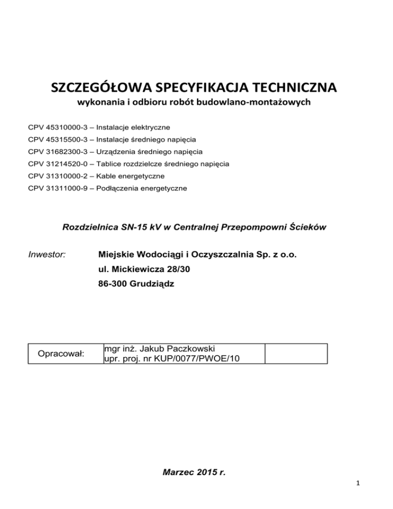 SZCZEGÓŁOWA SPECYFIKACJA TECHNICZNA wykonania i odbioru robót budowlano-montażowych CPV 45310000-3 – Instalacje elektryczne CPV 45315500-3 – Instalacje średniego napięcia CPV 31682300-3 – Urządzenia średniego napięcia CPV 31214520-0 – Tablice rozdzielcze średniego napięcia CPV 31310000-2 – Kable energetyczne CPV 31311000-9 – Podłączenia energetyczne Rozdzielnica SN-15 kV w Centralnej Przepompowni Ścieków Inwestor: Miejskie Wodociągi i Oczyszczalnia Sp. z o.o. ul. Mickiewicza 28/30 86-300 Grudziądz Opracował: mgr inż. Jakub Paczkowski upr. proj. nr KUP/0077/PWOE/10 Marzec 2015 r. 1 Spis treści 1. CZĘŚĆ OGÓLNA ................................................................................................................................................................................. 4 1.1. Przedmiot ST ....................................................................................................................................................................... 4 1.2.Zakres stosowania ST ............................................................................................................................................................... 4 1.3. Przedmiot i zakres robót objętych ST ............................................................................................................................. 4 1.5. Określenia podstawowe, definicje .................................................................................................................................... 5 1.6. Ogólne wymagania dotyczące robót ........................................................................................................................... 7 1.7. Dokumentacja robót montażowych .................................................................................................................................. 7 1.8. Nazwy i kody: ....................................................................................................................................................................... 7 2. WYMAGANIA DOTYCZĄCE WŁAŚCIWOŚCI ...................................................................................................................................... 7 2.1. Ogólne wymagania dotyczące właściwości materiałów, ich pozyskiwania i .......................................................................... 8 składowania podano w ST "Wymagania ogólne" Kod CPV 45000000-7, pkt. 2............................................................................. 8 2.2. Rodzaje materiałów .......................................................................................................................................................... 8 2.2.1. Kable i przewody ............................................................................................................................................................ 8 2.2.2. Osprzęt instalacyjny do kabli i przewodów .................................................................................................................. 9 2.2.3. Systemy mocujące przewody, kable, instalacje wiązkowe i osprzęt ....................................................................... 10 2.2.4. Sprzęt instalacyjny .......................................................................................................................................................... 11 2.2.5. Gniazda wtykowe ogólnego przeznaczenia do montażu w instalacjach podtynkowych, natynkowych i natynkowo-wtynkowych: ......................................................................................................................................................... 11 2.2.6. Sprzęt oświetleniowy ..................................................................................................................................................... 11 2.2.7. Sprzęt do innych instalacji .......................................................................................................................................... 12 2.2.8. Specyfikacja materiałowa ........................................................................................................................................... 12 2.3. Warunki przyjęcia na budowę materiałów do robót montażowych ..................................................................... 14 2.4. Warunki przechowywania materiałów do montażu instalacji elektrycznych ....................................................................... 14 3. WYMAGANIA DOTYCZĄCE SPRZĘTU, MASZYN I NARZĘDZI .................................................................................................... 14 3.1.OgóIne wymagania dotyczące sprzętu podano w ST "Wymagania ogólne" .............................................................. 14 4. WYMAGANIA DOTYCZĄCE TRANSPORTU ................................................................................................................................ 14 4.1.OgóIne wymagania dotyczące transportu podano w ST "Wymagania ogólne" ........................................................ 14 4.2. Transport materiałów .......................................................................................................................................................... 14 5. WYMAGANIA DOTYCZĄCE WYKONANIA ROBÓT ................................................................................................................ 15 5.1.Ogólne zasady wykonania robót podano w ST "Wymagania ogólne" ............................................................................ 15 5.2. Montaż przewodów instalacji elektrycznych ................................................................................................................... 15 5.3. Montaż opraw oświetleniowych i sprzętu instalacyjnego, urządzeń ................................................................... 16 odbiorników energii elektrycznej ............