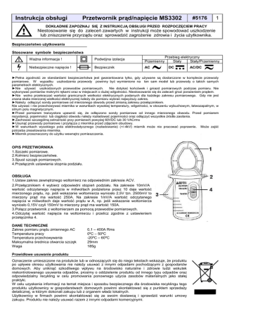 Instrukcja obsługi Przetwornik prąd/napięcie MS3302 #5176 1 DOKŁADNIE ZAPOZNAJ SIĘ Z INSTRUKCJĄ OBSŁUGI PRZED ROZPOCZĘCIEM PRACY Niestosowanie się do zaleceń zawartych w instrukcji może spowodować uszkodzenie lub zniszczenie przyrządu oraz sprowadzić zagrożenie zdrowia i życia użytkownika. Bezpieczeństwo użytkowania Stosowane symbole bezpieczeństwa Ważna informacja ! Podwójna izolacja Niebezpieczne napięcie ! Bezpiecznik Przemienny AC Przebieg elektryczny Stały Stały/Przemienny DC AC/DC ►Pełna zgodność ze standardami bezpieczeństwa jest gwarantowana tylko, gdy używane są dostarczone w komplecie przewody pomiarowe. W wypadku uszkodzenia przewody powinny być wymienione na ten sam model lub przewody o takich samych parametrach elektrycznych. ►Nie używać uszkodzonych przewodów pomiarowych. Nie dotykać końcówek i gniazd pomiarowych podczas pomiaru. Nie wykonywać pomiarów mokrymi rękami oraz w miejscach o dużej wilgotności. Niestosowanie się do zaleceń grozi porażeniem prądem. ►Nie wolno przekraczać wartości granicznych wielkości elektrycznych podanych dla każdego zakresu pomiarowego. Gdy nie jest znana skala mierzonej wielkości elektrycznej należy do pomiaru wybrać najwyższy zakres. ►Należy odłączyć sondy pomiarowe od mierzonego obwodu przed zmianą zakresu przełącznikiem. Nie używać i nie przechowywać miernika w warunkach wysokiej temperatury, wilgotności, w otoczeniu wybuchowym, łatwozapalnym, w silnym polu magnetycznym. ►Przed pomiarem tranzystora upewnić się, że odłączono sondy pomiarowe od innego mierzonego obwodu. Przed pomiarem rezystancji, pojemności lub ciągłości obwodu należy rozładować pojemności oraz odłączyć wszystkie źródła zasilania. ►Zachować szczególną ostrożność przy pomiarach powyżej 60VDC lub 30 VACrms ►Usunąć przewody pomiarowe i przyłącza z miernika przed zdjęciem obudowy. ►W warunkach wysokiego pola elektrostatycznego (rozładowanie) (+/-4kV) miernik może nie pracować poprawnie. Może zajść potrzeba zresetowania miernika. ►Miernik przeznaczony do użytku wewnątrz pomieszczenia. OPIS PRZETWORNIKA 1.Szczeki pomiarowe. 2.Kołnierz bezpieczeństwa. 3.Spust szczęk pomiarowych. 4.Przełącznik ustawiania stopnia podziału. OBSŁUGA 1.Ustaw zakres zewnętrznego woltomierz na odpowiednim zakresie ACV. 2.Przełącznikiem 4 wybierz odpowiedni stopień podziału. Na zakresie 10mV/A wartość odczytanego napięcia w miliwoltach podzielona przez 10 daje wartość mierzonego prądu, np. jeśli wskazanie woltomierza wyniosło 2,5V tzn. 2500mV to mierzony prąd ma wartość 250A. Na zakresie 1mV/A wartość odczytanego napięcia w miliwoltach daje wartość prądu w A, np. jeśli wskazanie woltomierza wyniosło 0,15V czyli 150mV to mierzony prąd ma wartość 150A. 3.Połącz przetwornik z woltomierzem za pomocą przewodów pomiarowych. 4.Odczytaj wartość napięcia na woltomierzu i przelicz zgodnie z ustawieniem przełącznika 4. DANE TECHNICZNE Zakres pomiaru prądu zmiennego AC Temperatura pracy Temperatura przechowywania Maksymalna średnica otwarcia szczęk Waga 0,1 – 400A Rms 0ºC – 50ºC -20ºC – 60ºC 29mm 185g Prawidłowe usuwanie produktu Oznaczenie umieszczone na produkcie lub w odnoszących się do niego tekstach wskazuje, że produktu po upływie okresu użytkowania nie należy usuwać z innymi odpadami pochodzącymi z gospodarstw domowych. Aby uniknąć szkodliwego wpływu na środowisko naturalne i zdrowie ludzi wskutek niekontrolowanego usuwania odpadów, prosimy o oddzielenie produktu od innego typu odpadów oraz odpowiedzialny recykling w celu promowania ponownego użycia zasobów materialnych jako stałej praktyki. W celu uzyskania informacji na temat miejsca i sposobu bezpiecznego dla środowiska recyklingu tego produktu użytkownicy w gospodarstwach domowych powinni skontaktować się z punktem sprzedaży detalicznej, w którym dokonali zakupu lub z organem władz lokalnych. Użytkownicy w firmach powinni skontaktować się ze swoim dostawcą i sprawdzić warunki umowy zakupu. Produktu nie należy usuwać razem z innymi odpadami komercyjnymi.