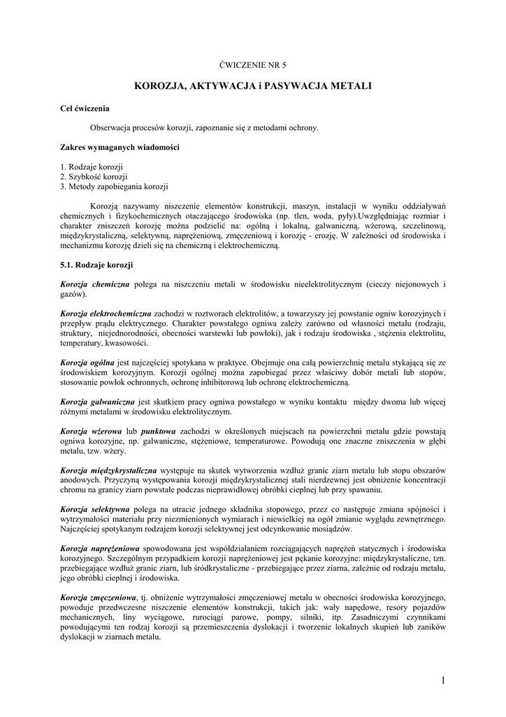ĆWICZENIE NR 5 KOROZJA, AKTYWACJA i PASYWACJA METALI Cel ćwiczenia Obserwacja procesów korozji, zapoznanie się z metodami ochrony. Zakres wymaganych wiadomości 1. Rodzaje korozji 2. Szybkość korozji 3. Metody zapobiegania korozji Korozją nazywamy niszczenie elementów konstrukcji, maszyn, instalacji w wyniku oddziaływań chemicznych i fizykochemicznych otaczającego środowiska (np. tlen, woda, pyły).Uwzględniając rozmiar i charakter zniszczeń korozję można podzielić na: ogólną i lokalną, galwaniczną, wżerową, szczelinową, międzykrystaliczną, selektywną, naprężeniową, zmęczeniową i korozję - erozję. W zależności od środowiska i mechanizmu korozję dzieli się na chemiczną i elektrochemiczną. 5.1. Rodzaje korozji Korozja chemiczna polega na niszczeniu metali w środowisku nieelektrolitycznym (cieczy niejonowych i gazów). Korozja elektrochemiczna zachodzi w roztworach elektrolitów, a towarzyszy jej powstanie ogniw korozyjnych i przepływ prądu elektrycznego. Charakter powstałego ogniwa zależy zarówno od własności metalu (rodzaju, struktury, niejednorodności, obecności warstewki lub powłoki), jak i rodzaju środowiska , stężenia elektrolitu, temperatury, kwasowości. Korozja ogólna jest najczęściej spotykana w praktyce. Obejmuje ona całą powierzchnię metalu stykającą się ze środowiskiem korozyjnym. Korozji ogólnej można zapobiegać przez właściwy dobór metali lub stopów, stosowanie powłok ochronnych, ochronę inhibitorową lub ochronę elektrochemiczną. Korozja galwaniczna jest skutkiem pracy ogniwa powstałego w wyniku kontaktu między dwoma lub więcej różnymi metalami w środowisku elektrolitycznym. Korozja wżerowa lub punktowa zachodzi w określonych miejscach na powierzchni metalu gdzie powstają ogniwa korozyjne, np. galwaniczne, stężeniowe, temperaturowe. Powodują one znaczne zniszczenia w głębi metalu, tzw. wżery. Korozja międzykrystaliczna występuje na skutek wytworzenia wzdłuż granic ziarn metalu lub stopu obszarów anodowych. Przyczyną występowania korozji międzykrystalicznej stali nierdzewnej jest obniżenie koncentracji chromu na granicy ziarn powstałe podczas nieprawidłowej obróbki cieplnej lub przy spawaniu. Korozja selektywna polega na utracie jednego składnika stopowego, przez co następuje zmiana spójności i wytrzymałości materiału przy niezmienionych wymiarach i niewielkiej na ogół zmianie wyglądu zewnętrznego. Najczęściej spotykanym rodzajem korozji selektywnej jest odcynkowanie mosiądzów. Korozja naprężeniowa spowodowana jest współdziałaniem rozciągających naprężeń statycznych i środowiska korozyjnego. Szczególnym przypadkiem korozji naprężeniowej jest pękanie korozyjne: międzykrystaliczne, tzn. przebiegające wzdłuż granic ziarn, lub śródkrystaliczne - przebiegające przez ziarna, zależnie od rodzaju metalu, jego obróbki cieplnej i środowiska. Korozja zmęczeniowa, tj. obniżenie wytrzymałości zmęczeniowej metalu w obecności środowiska korozyjnego, powoduje przedwczesne niszczenie elementów konstrukcji, takich jak: wały napędowe, resory pojazdów mechanicznych, liny wyciągowe, rurociągi parowe, pompy, silniki, itp. Zasadniczymi czynnikami powodującymi ten rodzaj korozji są przemieszczenia dyslokacji i tworzenie lokalnych skupień lub zaników dyslokacji w ziarnach metalu. 1 Erozja - korozja spowodowana jest mechanicznym i erozyjnym oddziaływaniem środowiska. 5.2. Podstawy teoretyczne korozji metali Proces korozji metali jest wynikiem reakcji chemicznych lub elektrochemicznych zachodzących pomiędzy metalem a jego środowiskiem. Korozja chemiczna metali przebiega między metalem, a gazem lub cieczą. Czynnikami powodującymi ten rodzaj korozji mogą być gazy (np. O2, H2S, H2, CO, CO2, NH3) lub ciecze nie będące elektrolitami (np. benzen) a ogólną reakcję można zapisać według równania: M+ 1 O2 ® MO 2 (5.1) Korozja elektrochemiczna metali przebiega w obecności wodnych roztworów elektrolitów (woda wodociągowa, gleba, roztwory związków chemicznych) i związana jest z reguły z przepływem elektronów lub jonów przez granicę faz metal - elektrolit i tworzeniem się ogniw galwanicznych: submikroogniw (korozja ogólna), mikroogniw (korozja lokalna), makroogniw (korozja galwaniczna), ogniw niejednakowego napowietrzenia, ogniw stężeniowych. W pracy ogniwa wyróżniamy następujące procesy: a) proces anodowy: ® M n+ + ne - (5.2) Fe ® Fe2+ + 2e- (5.3) Zn ® Zn 2+ + 2e - (5.4) M np.: w którym metal przechodzi do roztworu w postaci kationów, czyli utlenia się. b) proces katodowy (katoda nie ulega korozji): D + e - ® De (D - depolaryzator) (5.5) w którym następuje redukcja atomów, cząsteczek lub jonów roztworu np. jonów wodorowych w środowisku kwaśnym: 2H + + 2e - ® 2H ® H 2 (5.6) rozpuszczony tlen w środowisku kwaśnym: O2 + 4H+ + 4e- ® 2H2O (5.7) rozpuszczony tlen w środowisku obojętnym lub zasadowym: O2 + 2H2O + 4e- ® 4OH- (5.8) Zależność prądu od potencjału w ogólnym przypadku korozji ilustruje wykres Evansa: 2 Rys. 5.1 Warunki polaryzacji elektrody korodującej ¾¾¾¾¾¾ rzeczywisty prąd anodowy lub katodowy ia oraz ik - - - - - - - - - zewnętrzny (mierzony) prąd anodowy lub katodowy Ia lub Ik Ekor – potencjał korozyjny, ikor – prąd korozyjny. Uogólniając zjawisko korozji elektrochemicznej stwierdzono, że na anodzie zachodzi utlenianie metalu, a środowisko w obszarze anodowym ulega zakwaszeniu. Na katodzie zachodzi proces redukcji, a w obszarze katodowym wzrasta zasadowość środowiska. Metale o własnościach amfoterycznych, np. Al., Zn, Pb, mogą korodować będąc katodą dzięki tworzeniu się przy katodzie produktów alkalicznych. Konstrukcje metalowe zanurzone w wodach naturalnych, w ziemi, czy też stykające się z różnymi roztworami elektrolitów, narażone są na korozję, której przebieg zależy od powstającego potencjału między metalem, a środowiskiem. Metal