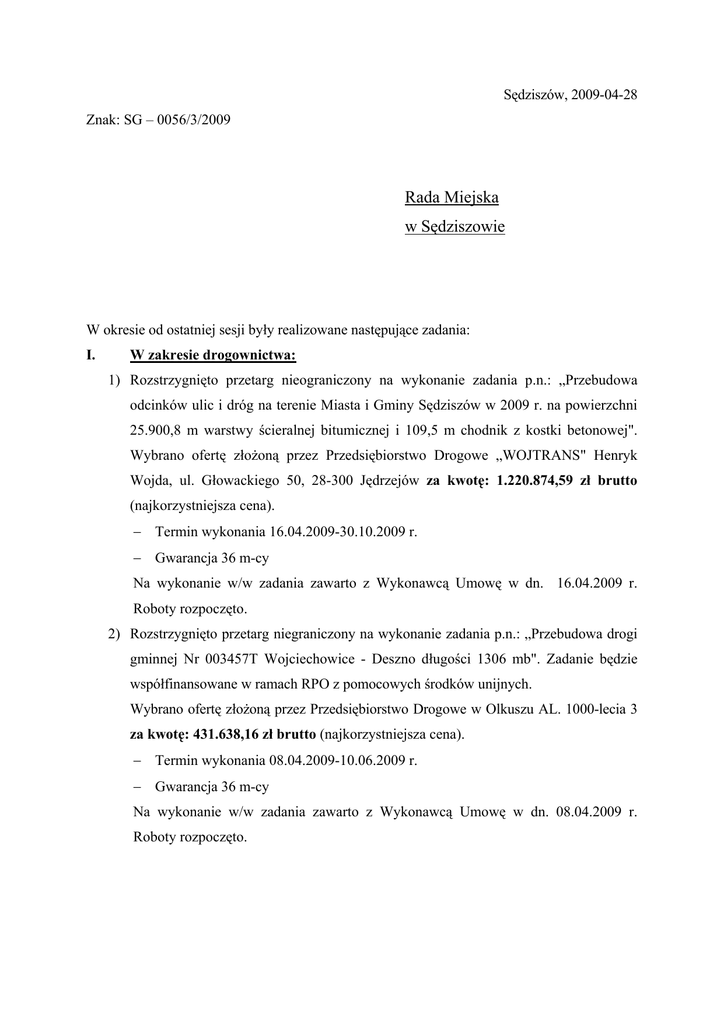 Sędziszów, 2009-04-28 Znak: SG – 0056/3/2009 Rada Miejska w Sędziszowie W okresie od ostatniej sesji były realizowane następujące zadania: I. W zakresie drogownictwa: 1) Rozstrzygnięto przetarg nieograniczony na wykonanie zadania p.n.: „Przebudowa odcinków ulic i dróg na terenie Miasta i Gminy Sędziszów w 2009 r. na powierzchni 25.900,8 m warstwy ścieralnej bitumicznej i 109,5 m chodnik z kostki betonowej". Wybrano ofertę złożoną przez Przedsiębiorstwo Drogowe „WOJTRANS" Henryk Wojda, ul. Głowackiego 50, 28-300 Jędrzejów za kwotę: 1.220.874,59 zł brutto (najkorzystniejsza cena). − Termin wykonania 16.04.2009-30.10.2009 r. − Gwarancja 36 m-cy Na wykonanie w/w zadania zawarto z Wykonawcą Umowę w dn. 16.04.2009 r. Roboty rozpoczęto. 2) Rozstrzygnięto przetarg niegraniczony na wykonanie zadania p.n.: „Przebudowa drogi gminnej Nr 003457T Wojciechowice - Deszno długości 1306 mb". Zadanie będzie współfinansowane w ramach RPO z pomocowych środków unijnych. Wybrano ofertę złożoną przez Przedsiębiorstwo Drogowe w Olkuszu AL. 1000-lecia 3 za kwotę: 431.638,16 zł brutto (najkorzystniejsza cena). − Termin wykonania 08.04.2009-10.06.2009 r. − Gwarancja 36 m-cy Na wykonanie w/w zadania zawarto z Wykonawcą Umowę w dn. 08.04.2009 r. Roboty rozpoczęto. 3) Rozstrzygnięto przetarg niegraniczony na wykonanie zadania p.n. „Budowa i przebudowa 8 dróg gminnych o łącznej długości 10.972 km szansą na rozwój gospodarczy oraz poprawę atrakcyjności turystycznej gminy Sędziszów - Etap I w tym: − Budowa ul. Zielonej − Budowa ul. Zielonej - ulice przyległe − Budowa ul. Majowej − Budowa ul. Marianowskiej Nr 003452T − Budowa drogi gminnej Nr 003456T Czekaj - Wydanka - Tarnawa" w/w będzie współfinansowane w ramach RPO z pomocowych środków unijnych. Wybrano ofertę złożoną przez Kieleckie Przedsiębiorstwo Robót Drogowych Sp. z o.o., ul. Przęsłowa 2a, 25-560 KIELCE za kwotę: 5.503.099,20 zł brutto − Termin wykonania do dnia 15.11.2010 r. − Gwarancja 60 m-cy − Na wykonanie w/w zadania zawarto Umowę z Wykonawcą. 4) Sporządzono i podpisano umowy na: ¾ Świadczenie usług sprzętem drogowym w ilości: − równiarka 320 godz. − walec drogowy 175 godz. za kwotę brutto: 65.943,30 zł Roboty wykonywać będzie firma „ANWOJ" - R. Kurkowski. Zakup kruszywa drogowego o granulacji 0-^63 i 0-K31 w ilości 2000 t za kwotę: 29.280,00 zł. Zakupu dokonamy w firmie EKO-WAP. ¾ Nadzór nad wykonaniem zadania „Przebudowa drogi Wojciechowice Deszno" za kwotę brutto 4.500,00 zł Inspektorem nadzoru będzie Pan inż. Dariusz Adamek. ¾ Nadzór nad wykonaniem zadania: „Przebudowa odcinków ulic i dróg na terenie miasta i gminy w 2009 r." za kwotę brutto: 11.136,19 zł Inspektorem nadzoru będzie Pan inż. Krzysztof Szarek. 5) Obmierzono w terenie wspólnie z przedstawicielami ZDP - Jędrzejów zakresy robót do wykonania przy odnowie odcinków dróg powiatowych w ramach partycypacji w kosztach. Kwota partycypacji na 2009 r. - 500.000,00 zł (dotacja). Na powyższe zawarto porozumienie z Zarządem Powiatu Jędrzejowskiego. 6) Podpisano Porozumienie z Zarządem Powiatu Jędrzejowskiego na wykonanie projektu p.n.: „Przebudowa drogi powiatowej nr 0188T Wywła - Słupia - Sędziszów Wodzisław - Gajówka o łącznej długości 11,0 km" w ramach RPO Woj. Świętokrzyskiego na lata 2007-2013. − całkowita wartość projektu − udział Gminy 8.150.000,00 zł 200.000,00 zł 7) Rozpoczęto roboty remontowe na drogach w ramach bieżącego ich utrzymania: − roboty sprzętem drogowym: równiarka, walec − dostawy żużla kotłowego i kruszywa drogowego. II. W zakresie kanalizacji: 1) Wystąpiono o pozwolenie na budowę dla zadania „Budowa kanalizacji sanitarnej w aglomeracji Sędziszów obejmującej tereny zlokalizowane na terenie Miasta i Gminy Sędziszów oraz Gminy Słupia Jędrzejowska wraz z przebudową oczyszczalni". 2) 08.04.2009 r. ogłoszono przetarg nieograniczony na Budowę sieci wodociągowej z przyłączami w miejscowości Szałas. Otwarcie ofert planowane jest na 30.04.2009 r. III. W zakresie monitorowania i rozliczania funduszy europejskich: 1) Przekazano do Urzędu Marszałkowskiego dokumentację do II etapu konkursu w ramach działania 5.3 RPOWŚ 2007 - 2013 dla zadania „Budowa kompleksu sportowo - rehabilitacyjno - edukacyjnego w Sędziszowie" (opinia RIO, Uchwała RM w Sędziszowie). 2) Trwają prace nad dokumentacją do II etapu konkursu dla zadania „Budowa kanalizacji sanitarnej i deszczowej oraz przebudowa oczyszczalni ścieków w Sędziszowie - etap I". 3) Trwają prace nad wnioskiem aplikacyjnym wraz z załącznikami dla zadania „Budowa kanalizacji sanitarnej w miejscowości Tarnawa i Borszowice oraz budowa kanalizacji deszczowej w miejscowości Borszowice" - Beneficjent Zakład Usług Komunalnych w Sędziszowie. 4) 22.04.2009 zamieszczono ogłoszenie o zamówieniu dla zadania „Budowa kanalizacji sanitarnej i deszczowej oraz przebudowa oczyszczalni ścieków w Sędziszowie - etap I". Otwarcie ofert planowane jest na 14.05.2009 r. IV. W zakresie obrotu nieruchomościami: 1) Podpisano akt notarialny z p. Batko na sprzedaż działki rolno-leśnej położonej w Szałasie o pow. 0,37 ha za kwotę 6 240,00 zł. 2) Sporządzono protokół uzgodnień na bezprzetargową sprzedaż 3 działek jako uzupełnienie dotychczasowych powierzchni placów przy butikach w Sędziszowie: 1. działka o pow. 6 m2 - 400,00 zł + VAT 2. działka o pow. 14 m2 - 700,00 zł + VAT 3. działka o pow. 93 m2 - 3 500,00 zł + VAT 3) Rozpisano przetarg na sprzedaż 3 działek rolnych w Krzelowie o pow. 60 ara. Rozstrzygnięcie przetargu nastąpi 3 czerwca br. V. W zakresie rolnictwa i ochrony środowiska: 1) Podpisano umowy z Firmą P.P.H.U. „Borex" Przemysław Borówka Jędrzejów na demontaż, transport i unieszkodliwienie eternitu z budynku SP Nr 2 Filia Klimontów, Świetlicy Wiejskiej w Klimontowie i budynku ZUK za kwotę ł
