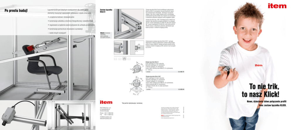 elementy muszą być spasowane, ustawiane i często zmieniane: Zestaw łącznika Klick 8 Zestaw łącznika Klick 8 jest kształtowym połączeniem dwóch profili 8, krzyżujących się pod dowolnym kątem lub prowadzonych równolegle. Obrotowe mocowanie sięgaja z obu stron w głąb rowków profili, umożliwiając przesuwanie łącznika wzdłuż obu rowków oraz obracanie w dowolnym położeniu kątowym profili względem siebie. • urządzenia testowe i doświadczalne Zestaw łącznika typu „Klik“ 8 dostępny jest w dwóch wariantach: jako łączenie pomiędzy profilami 8 (w odstępie 20 mm, numer katalogowy 0.0.489.79) albo jako wariant 90° (numer katalogowy 0.0.606.94), który łączy profil 8 40x40 człowo, w dowolnym położeniu obrotowym pod katem prostym z rowkiem drugiego profila. • konstrukcje szkieletu w technice fotograficznej i oświetleniowej • regulowane urządzenia wykorzystywane do uchwytu przedmiotów • konstrukcje pomocnicze stosowane w produkcji – i wiele innych rozwiązań! innowacja niemiecki wzór użytkowy 20 2004 019 675 Zastosowanie zestawu łącznika Klick 8 90˚ wymaga wykonania w otworze rdzeniowym czołowo połączonego profilu 8 otworu M8x20. Odstęp pomiędzy powierzchnią czołową a bokiem drugiego profilu wynosi w tym przypadku 24 mm. Zestaw łącznika Klick 8 profil napinający Al, kolor naturalny elementy napinające, St, nierdzewne 2 blaszki ryglujące, St, nierdzewne śruba z łbem cylindrycznym M6x25, St, ocynkowana m = 105,0 g 1 zestaw 0.0.489.79 Zestaw łącznika Klick 8 90° profil napinający Al, kolor naturalny elementy napinające, St, nierdzewne 2 blaszki ryglujące, St, nierdzewne śruba z łbem cylindrycznym M6x25, St, ocynkowana śruba zaciskowa M8, St, ocynkowana zaślepka 8 40x40, GD, Zn, białe aluminium m = 125,0 g 1 zestaw 0.0.606.94 Twój partner dystrybucyjny i serwisowy item Polska Sp. z o.o. ul. Komandorska 6 50-022 Wrocław Phone +48 71 7885700 Fax +48 71 7885720 [email protected] www.item-polska.com Zastrzega się możliwość zmian i błędów. Wszystkie prawa zastrzeżone. Wykorzystanie tekstów i zdjęć, względnie przedruk – również fragmenty - wyłącznie za naszym pisemnym zezwoleniem. Dotyczy to w szczególności powielania, tłumaczenia lub wykorzystania w systemach elektronicznych. Made in Germany Łącznik KLICK jest idealnym rozwiązaniem dla zadań gdzie jest zarejestrowanym znakiem towarowym item Industrietechnik GmbH. 05/2010 Po prostu buduj! © item Industrietechnik GmbH 2010 To nie trik, to nasz Klick! Nowe, dziecinnie łatwe połączenie profili item: zestaw łącznika KLICK. Dziecinnie proste: bez procesu planowania i obróbki. Klick – i gotowe! Nowy wymiar współgrania z systemem modułowym MB: Szczególną zaletą zestawu łącznika Klick jest szybkość Wszędzie tam, gdzie system modułowy MB ma posłużyć Możliwe jest ustawienie i połącznie profili w dowolnej jego zastosowania: osadzenie łącznika w rowkach profili do szybkiej i łatwej budowy elastycznej konstrukcji, pozycji między sobą. oraz jego zaryglowanie poprzez ¼ obrotu wymaga zaled- pierwszy wybór pada na zestaw łącznika Klick! Odcinki profili mogą być umieszczone na gotowej kon- wie jednego ruchu ręką. Pozostaje jeszcze tylko ustalić strukcji i użyte ponownie jako np. element wsporczy. jego położenie poprzez dociągnięcie jednej bocznej śruby Przy użyciu zestawu łącznika Klick nie jest wymagane napinającej: najwyższy stopień elastyczności przy jednoc- dokładne przycięcie podpór profilowych! zesnej łatwej obsłudze. Fakt ten zwiększa atrakcyjność łącznika Klick używanego Osadzenie zestawu łącznika Klick w rowku profilu i zaryglowanie (KLICK!) Połączenie zestawu łącznika Klick w konstrukcjach o charakterze przejściowym: zmian z drugim profilem. można dokonać w krótkim czasie! Wyregulowanie zestawu łącznika Klick i dociągnięcie śruby napinającej. Demontaż: po poluzowaniu śruby Zestaw łącznika Klick 8 napinającej następuje podniesienie oraz wyjęcie blaszki ryglującej z rowka profilu. Zestaw łącznika Klick jest natychmiast gotowy do następnego użycia. Szybko. Uniwersalnie. Elastycznie. Z możliwością wielokrotnego użycia. Zestaw łącznika Klick 8 90°