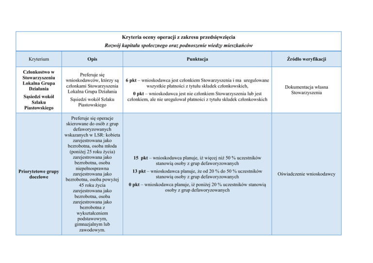 Kryteria oceny operacji z zakresu przedsięwzięcia Rozwój kapitału społecznego oraz podnoszenie wiedzy mieszkańców Kryterium Członkostwo w Stowarzyszeniu Lokalna Grupa Działania Sąsiedzi wokół Szlaku Piastowskiego Priorytetowe grupy docelowe Opis Punktacja Preferuje się wnioskodawców, którzy są członkami Stowarzyszenia Lokalna Grupa Działania 6 pkt – wnioskodawca jest członkiem Stowarzyszenia i ma uregulowane wszystkie płatności z tytułu składek członkowskich, Sąsiedzi wokół Szlaku Piastowskiego Preferuje się operacje skierowane do osób z grup defaworyzowanych wskazanych w LSR: kobieta zarejestrowana jako bezrobotna, osoba młoda (poniżej 25 roku życia) zarejestrowana jako bezrobotna, osoba niepełnosprawna zarejestrowana jako bezrobotna, osoba powyżej 45 roku życia zarejestrowana jako bezrobotna, osoba zarejestrowana jako bezrobotna z wykształceniem podstawowym, gimnazjalnym lub zawodowym. 0 pkt – wnioskodawca jest nie członkiem Stowarzyszenia lub jest członkiem, ale nie uregulował płatności z tytułu składek członkowskich Źródło weryfikacji Dokumentacja własna Stowarzyszenia 15 pkt – wnioskodawca planuje, iż więcej niż 50 % uczestników stanowią osoby z grup defaworyzowanych 13 pkt – wnioskodawca planuje, że od 20 % do 50 % uczestników stanowią osoby z grup defaworyzowanych 0 pkt – wnioskodawca planuje, iż poniżej 20 % uczestników stanowią osoby z grup defaworyzowanych Oświadczenie wnioskodawcy Nabycie uprawnień Preferuje się operacje, które umożliwią uczestnikom nabycie uprawnień zawodowych 10 pkt – wnioskodawca planuje, że operacja umożliwi uczestnikom nabycie uprawnień zawodowych Priorytetowe typy operacji Preferuje się operacje, które dotyczyć będą tematyki: przedsiębiorczość i prowadzenie działalności gospodarczej 8 pkt – operacja dotyczy tematyki: przedsiębiorczość i prowadzenie działalności gospodarczej 0 pkt – operacja nie dotyczy tematyki: przedsiębiorczość i prowadzenie działalności gospodarczej Preferuje się operacje o charakterze innowacyjnym. 3 pkt – projekt innowacyjny Innowacyjność Definicja innowacyjności wskazana w LSR Ochrona środowiska Preferuje się operacje przewidujące zastosowanie rozwiązań sprzyjających ochronie środowiska lub przeciwdziałanie zmianom klimatu Doradztwo biura LGD Preferuje się wnioskodawców, którzy korzystali z doradztwa pracowników biura LGD w zakresie przygotowywania wniosku o przyznanie pomocy 0 pkt – wnioskodawca nie planuje, że operacja które umożliwi uczestnikom nabycie uprawnień zawodowych 0 pkt – projekt nieinnowacyjny Oświadczenie wnioskodawcy Wniosek Wniosek – wyraźne wskazanie i opis innowacyjnego charakteru operacji 3 pkt – projekt przewiduje zastosowanie rozwiązań sprzyjających ochronie środowiska lub przeciwdziałanie zmianom klimatu Wniosek 0 pkt – projekt nie przewiduje zastosowania rozwiązań sprzyjających ochronie środowiska lub przeciwdziałanie zmianom klimatu Oświadczenie wnioskodawcy 5 pkt – wnioskodawca korzystał z doradztwa 0 pkt – wnioskodawca nie korzystał z doradztwa Minimalna liczba punktów: 25 Maksymalna liczba punktów: 50 lub Dokumentacja własna Stowarzyszenia