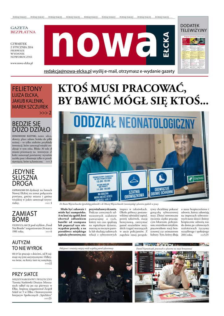 podaj dalej....... podaj dalej....... podaj dalej....... podaj dalej....... podaj dalej....... podaj dalej....... podaj dalej....... podaj dalej....... podaj dalej....... Dodatek Telewizyjny GAZETA BEZPŁATNA 2 Program telewizyjny 2-8 stycznia 2014 NOWA EŁCKA CZWARTE piątek 3 stycznia czwartek 2 STYCZNIA 2014 Boso przez świat, godz. 12.55 TVP 1 PIERWSZE WYDANIE NOWOrOCZNE www.nowa-elcka.pl [email protected] wyślij e-mail, otrzymasz e-wydanie gazety 08:00 Wiadomości 08:15 Pogoda poranna 08:20 Telezakupy 09:00 Ojciec Mateusz - serial (99) 09:55 Osobliwi mieszkańcy oceanów - dok. 11:00 Bohdan trzymaj się! benefis Bohdana Łazuki 12:00 Wiadomości 12:10 Agrobiznes 12:35 Przepis dnia - magazyn 12:45 Osobliwi mieszkańcy przestworzy - dok. 13:50 Jaka to melodia? (2776) 14:25 Moda na sukces - serial (5908) 15:00 Wiadomości 15:05 Pogoda 15:15 Klan - odc. 2520 15:45 Sprawa dla reportera 17:00 Teleexpress 17:15 Pogoda 17:25 Jaka to melodia? (2777) 17:55 Galeria - serial, odc. 146 18:30 Ojciec Mateusz - serial (82) 19:15 Przepis dnia - magazyn 19:30 Wiadomości 20:00 Sport 20:05 Rajdowe Samochodowe Mistrzostwa Europy 20:10 Pogoda 20:25 Świat bez końca - serial (1) reż. Michael Caton-Jones, 21:20 C.K. Dezerterzy - cz. 1, reż. Janusz Majewski, 23:00 Zdrajca - thriller, reż. Jeffrey Nachmanoff, (2008) 01:00 Weekendowy magazyn filmowy - magazyn 01:25 Notacje - Wojciech Giełżyński, dok. 01:40 Galeria - serial (146) 04:10 Notacje - Krystyna Habsburg, dok. TVP 2 05:55 Faceci do wzięcia - serial (72) 06:30 Lokatorzy - serial (44) 07:05 M jak miłość - serial (414) 08:00 Pytanie na śniadanie 10:15 Biegi narciarskie - Puchar Świata - Toblach: Tour de Ski - 15 km techniką dowolną - studio 10:25 Biegi narciarskie - Puchar Świata - Toblach: Tour de Ski - 15 km techniką dowolną 11:50 Barwy szczęścia - serial (1038) 12:25 W krainie lwów - serial (4) 12:55 Wojciech Cejrowski - boso przez świat: Wśród berberów 13:30 Szkoła życia - serial (9) 14:15 Disco Sylwester z Dwójką. Wrocław 2013 - koncert 14:55 The Voice of Poland. Przesłuchania w ciemno 15:45 Panorama Kraj 16:05 Pogoda Kraj 16:15 The Voice of Poland. 17:05 Herkules - serial (2) 18:00 Panorama 18:35 Sport Telegram 18:45 Pogoda 18:50 Jeden z dziesięciu - (1952) 19:30 Barwy szczęścia - (1038) 20:05 Barwy szczęścia - (1039) 20:40 Rodzinka.pl - serial (111) 21:10 Rodzinka.pl - serial (112) 21:45 Dzięki Bogu już weekend 23:00 CSI: Kryminalne zagadki Las Vegas XI - serial (224) 23:50 Ciało - komedia 01:35 Nowa - serial (12) 23:00 CSI: Kryminalne zagadki Las Vegas XI - serial (225) 03:30 Herkules - serial (2) Mission: Impossible, 20.00 TVN 00:35 Lekarze 3 - serial (4/13) reż. Filip Zylber, Marcin Wrona, Polska 2012 01:35 Uwaga! 01:50 Arkana magii 05:05 Uwaga! - odc. 3788 05:20 Rozmowy w toku - (2121) 06:20 Mango - Telezakupy 07:25 Na Wspólnej 12 - (1844) 08:00 Dzień dobry TVN 11:10 Ukryta prawda - serial, odc. 177 12:15 Szpital - obyczajowy (73) 13:15 W-11 Wydział Śledczy - serial odc. 983 14:00 Wawa non stop - odc. 86 15:00 Ukryta prawda - serial (178) 16:00 Rozmowy w toku 17:00 Wawa non stop - odc. 87 18:00 Szpital - obyczajowy (74) 19:00 Fakty 19:30 Sport 19:40 Pogoda 19:50 Uwaga! program odc. 3788 20:00 Mission: Impossible - film sensacyjny, reż. Brian De Palma, wyk. Tom Cruise, Jon Voight, Henry Czerny, Jean Reno, USA 1996 22:20 Amerykański gangster film sensacyjny, reż. Ridley Scott, wyk. Denzel Washington, Russell Crowe, Chiwetel Ejiofor, Josh Brolin, USA 2007 01:30 Kuba Wojewódzki 4 - talk show odc. 26 02:35 Uwaga! 02:50 Arkana magii 05:05 Uwaga! - program odc. 3789 05:20 Rozmowy w toku Brzdąc w opałach, godz. 20.05 POLSAT 06:00 Nowy dzień z Polsat News 08:15 Świat według Kiepskich - serial (147) 09:00 Malanowski i Partnerzy - serial (127) 09:30 Malanowski i Partnerzy - serial (128) 10:00 Trudne sprawy - (209) 11:00 Dlaczego ja? (206) 12:00 Dom nie do poznania reality show 13:00 Dom nie do poznania reality show odc. 235 14:00 Pierwsza miłość - (1809) 14:45 Trudne sprawy - (207) 15:50 Wydarzenia 16:10 Pogoda 16:15 Interwencja - magazyn reporterów odc. 1241 16:30 Malanowski i Partnerzy - serial (173) 17:00 Dlaczego ja? (145) 18:00 Pierwsza miłość - (1810) 18:50 Wydarzenia 19:20 Sport 19:25 Pogoda 19:30 Świat według Kiepskich - serial (408) 20:00 Dziewczyny z Fortuną teleturniej odc. 72 20:05 Brzdąc w opałach - komedia familijna, USA 1994 22:05 W stronę słońca - thriller sensacyjny, wyk. Steven Seagal, Chiaki Kuriyama, 1992 00:05 CSI: Kryminalne zagadki Miami - serial (9) 01:00 CSI: Kryminalne zagadki Miami - serial (10) 03:15 Tajemnice losu - program interaktywny 05:00 Wstawaj! Gramy! - pro gram muzyczny odc. 2506 Przepis na życie, godz. 17,00 TVN 7 05:00 Pascal: po prostu gotuj 12 - program kulinarny (8/16) 05:35 We Dwoje - pr. rozryw. odc. 15/16, prow.: Piotr Szwedes, prod.: Polska, 2002 06:50 Męski Typ 2: Zbigniew Lew-Starowicz - talk show 07:20 Sąd rodzinny - serial (189) 08:15 Sędzia Anna Maria Wesołowska - serial odc. 486 09:15 Dr House III - serial (1/24) 10:10 Ostry dyżur XI - (20/22) 11:15 Mango - Telezakupy 12:50 Sąd rodzinny - serial (190) 13:50 Sędzia Anna Maria Wesołowska - serial odc. 487 14:50 Tożsamość szpiega - (12/13) 15:50 Czerwony orzeł - serial obyczajowy odc. 18/19 17:00 Przepis na życie - (12) 18:00 Dr House III - serial (2/24) 19:00 Tożsamość szpiega - (13) 20:00 Hotel dla psów - komedia reż. Thor Freudenthal, wyk. Emma Roberts, Jake T. Austin, Don Cheadle, Johnny Simmons, Kyla Pratt, Lisa Kudrow, Kevin Dillon, USA/Niemcy 2009 22:10 Rodzina Addamsów komedia 00:10 Mentalista III - serial sen sacyjny odc. 19/24 reż. David Nutter, USA 2008 01:10 Kto zabił moją córkę? film sensacyjny, reż. Eric Laneuville, wyk. Markie Post, Gerald McRaney, Jeffrey Nordling, Spencer Garrett, USA 1994 03:10 Arkana Magii 05:15 Zakończenie programu Wojownicze żółwi TV 4 03:35 mała Czarn 04:35 Mega chich 04:50 4music - p 05:55 Łowca Kro 06:25 Mega chich 