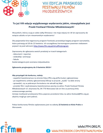 To już VIII edycja wyjątkowego wydarzenia jakim, niewątpliwie jest Praski Festiwal Filmów Młodzieżowych! Wszystkich, którzy czują w sobie żyłkę filmowca i nie maja więcej niż 18 lat zapraszamy do wzięcia udziału w tym niesamowitym wydarzeniu! Dla pasjonatów kina tegoroczny program Festiwalu przewiduje bogaty program warsztatów, które potrwają od 20 do 22 kwietnia. Ich szczegółowy harmonogram powinien niebawem pojawić się pod adresem http://www.ffm.org.pl/viii-pffm/program Zapraszamy do zgłaszania swoich produkcji w trzech kategoriach: - dokument i reportaż, - wideoklip i animacja - fabuła Każda kategoria jest oceniana indywidualnie. Zgłoszenia przyjmujemy do 3 Kwietnia 2015r! Aby przystąpić do konkursu, należy: - wypełnić kwestionariusz na stronie http://ffm.org.pl/formularz-zgloszeniowy - po wypełnieniu ankiety zgłoszeniowej kliknąć w przycisk „wyślij” na dole strony - sprawdzić, czy w pobranym formularzu nie wkradł się błąd - przesłać film i wydrukowany kwestionariusz pocztą na adres: Praski Festiwal Filmów Młodzieżowych Ul. Jeżynowa 9a, 04-770 Warszawa lub on-line za pomocą linku umieszczonego poniżej. Istnieje możliwość przekazania filmu poprzez przesłanie linku na adres [email protected], abyśmy mogli go sami pobrać. Pokaz konkursowy filmów zaplanowany jest na sobotę 22 kwietnia w Kinie Praha w Warszawie. Nagrody VIII PFFM: - Złota Praska Klisza za zajęcie pierwszego miejsca, - Srebrna Praska Klisza za zajęcie drugiego miejsca, - Brązowa Praska Klisza za zajęcie trzeciego miejsca, - nagroda specjalna Magazynu Ekspres Reporterów, emisja filmu w TVP2), - nagroda publiczności, - nagroda internautów. Oprócz pamiątkowych statuetek laureaci otrzymają nagrody pieniężne oraz rzeczowe. Pula nagród jest bardzo wysoka i z każdą edycją wzrasta. Jednocześnie przypominamy najważniejsze zasady konkursowe w nim opisane: - przyjmujemy filmy zrealizowane po 1 stycznia 2010 przez osoby, które w momencie ukończenia filmu miały nie więcej niż 18 lat; - dopuszczalne jest wsparcie przy realizacji filmu przez osoby powyżej 18 roku życia, ale autorstwo filmu musi być bezspornie przypisane osobie spełniającej kryterium wiekowe; - film przesyłamy w najlepszej dostępnej jakości; - filmy należy zgłosić i przesłać, nie później niż do 3 kwietnia 2015; - filmy powinny zostać zrealizowane w języku polskim lub posiadać w tym języku napisy; - warunkiem odbioru nagród finansowych jest obecność podczas gali ogłoszenia wyników w dniu 22.04.2015. Informacja dla osób, które chciałby, w ramach wolontariatu, wesprzeć organizację VIII PFFM znajduje się na stronie http://ffm.org.pl/aktualnosci/246-zostan-wolontariuszem-podczasviii-pffm Regulamin i formularz zgłoszeniowy dostępne są pod adresem www.ffm.org.pl oraz na funpage’u https://www.facebook.com/festiwalfilmow Czekamy na wsze zgłoszenia!