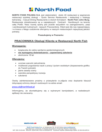 NORTH FOOD POLSKA S.A. jest właścicielem około 40 restauracji w segmencie restauracji szybkiej obsługi – Quick Service Restaurants i restauracji z obsługą kelnerską – Casual Dining Restaurants w dwóch formatach: North Fish iJohn Burg. Restauracje zlokalizowane są w największych Centrach Handlowych na terenie całej Polski. Nasz rozwój oparty jest przede wszystkim na zaangażowaniu, pasji i zamiłowaniach kulinarnych naszych Pracowników. Klient jest dla nas najważniejszy i w trosce o Niego codziennie oferujemy w naszych restauracjach najwyższej jakości potrawy. Poszukujemy w Poznaniu: PRACOWNIKA Obsługi Klienta w Restauracji North Fish Wymagania: książeczka do celów sanitarno-epidemiologicznych nie wymagamy doświadczenia – zapewniamy szkolenia ukończone 18 lat Oferujemy: uczciwe warunki zatrudnienia możliwość pogodzenia nauki z pracą i życiem osobistym (dopasowanie grafiku do Twoich potrzeb) jasne zasady oceny szerokie perspektywy rozwoju szkolenia Osoby zainteresowane prosimy o przesyłanie cv,zdjęcia oraz dopisanie klauzuli dotyczącej ochrony danych osobowych na adres email: [email protected] Informujemy, że skontaktujemy się z wybranymi kandydatami, a nadesłanych aplikacji nie zwracamy. North Food Polska S.A., al. Solidarności 36, 25-323 Kielce www.northfood.pl Sąd Rejonowy w Kielcach, X Wydział Gospodarczy Krajowego Rejestru Sądowego, NIP: 959-15-05-646 REGON: 292457948, KRS Nr:0000289192 Wysokość kapitału zakładowego Spółki: 22.550.000,00PLN