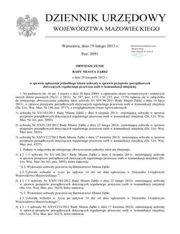 DZIENNIK URZĘDOWY WOJEWÓDZTWA MAZOWIECKIEGO Warszawa, dnia 19 lutego 2013 r. Elektronicznie podpisany przez: Sławomir Parys Poz. 2091 Data: 2013-02-19 13:34:14 OBWIESZCZENIE RADY MIASTA ZĄBKI z dnia 29 listopada 2012 r. w sprawie ogłoszenia jednolitego tekstu uchwały w sprawie przepisów porządkowych dotyczących regularnego przewozu osób w komunikacji miejskiej. 1. Na podstawie art. 16 ust. 3 ustawy z dnia 20 lipca 2000r. o ogłaszaniu aktów normatywnych i niektórych innych aktów prawnych (Dz.U. z 2011r. Nr 197, poz. 1172 i Nr 232, poz. 1378) ogłasza się w załączniku do niniejszego obwieszczenia jednolity tekst uchwały Nr XIV/96/2011 Rady Miasta Ząbki z dnia 14 lipca 2011r. w sprawie przepisów porządkowych dotyczących regularnego przewozu osób w komunikacji miejskiej (Dz. Urz. Woj. Maz. Nr 148, poz. 4717), z uwzględnieniem zmian wprowadzonych: 1) uchwałą Nr XV/102/2011 Rady Miasta Ząbki z dnia 4 sierpnia 2011r. zmieniającą uchwałę w sprawie przepisów porządkowych dotyczących regularnego przewozu osób w komunikacji miejskiej (Dz. Urz. Woj. Maz. Nr 161, poz. 5093), 2) uchwałą Nr XXIV/185/2012 Rady Miasta Ząbki z dnia 22 lutego 2012r. zmieniającą uchwałę w sprawie przepisów porządkowych dotyczących regularnego przewozu osób w komunikacji miejskiej (Dz. Urz. Woj. Maz. poz. 3825), 3) uchwałą Nr XXVI/212/2012 Rady Miasta Ząbki z dnia 17 kwietnia 2012r. zmieniającą uchwałę w sprawie przepisów porządkowych dotyczących regularnego przewozu osób w komunikacji miejskiej (Dz. Urz. Woj. Maz. poz. 4227). 2. Podany w załączniku do niniejszego obwieszczenia jednolity tekst nie obejmuje: 1) § 2 i 3 uchwały Nr XV/102/2011 Rady Miasta Ząbki z dnia 4 sierpnia 2011r. zmieniającej uchwałę w sprawie przepisów porządkowych dotyczących regularnego przewozu osób w komunikacji miejskiej (Dz. Urz. Woj. Maz. Nr 161, poz. 5093), które stanowią: “§ 2. Wykonanie uchwały powierza się Burmistrzowi Miasta Ząbki. § 3. Uchwała wchodzi w życie po upływie 14 dni od dnia ogłoszenia w Dzienniku Urzędowym Województwa Mazowieckiego.”; 2) § 2 i 3 uchwały Nr XXIV/185/2012 Rady Miasta Ząbki z dnia 22 lutego 2012r. zmieniającej uchwałę w sprawie przepisów porządkowych dotyczących regularnego przewozu osób w komunikacji miejskiej (Dz. Urz. Woj. Maz. poz. 3825), które stanowią: “§ 2. Wykonanie uchwały powierza się Burmistrzowi Miasta Ząbki. § 3. Uchwała wchodzi w życie po upływie 14 dni od dnia ogłoszenia w Dzienniku Urzędowym Województwa Mazowieckiego.”; 3) § 2 i 3 uchwały Nr XXVI/212/2012 Rady Miasta Ząbki z dnia 17 kwietnia 2012r. zmieniającej uchwałę w sprawie przepisów porządkowych dotyczących regularnego przewozu osób w komunikacji miejskiej (Dz. Urz. Woj. Maz. poz. 4227), które stanowią: Dziennik Urzędowy Województwa Mazowieckiego –2– Poz. 2091 “§ 2. Wykonanie uchwały powierza się Burmistrzowi Miasta Ząbki. § 3. Uchwała wchodzi w życie po upływie 14 dni od dnia ogłoszenia w Dzienniku Urzędowym Województwa Mazowieckiego.”. Przewodniczący Rady Miasta Ząbki: Krzysztof Bławdziewicz Dziennik Urzędowy Województwa Mazowieckiego –3– Poz. 2091 Załącznik do obwieszczenia Rady Miasta Ząbki z dnia 29 listopada 2012r. w sprawie ogłoszenia jednolitego tekstu uchwały w sprawie przepisów porządkowych dotyczących regularnego przewozu osób w komunikacji miejskiej UCHWAŁA Nr XIV/96/2011 RADY MIASTA ZĄBKI z dnia 14 lipca 2011 r. w sprawie przepisów porządkowych dotyczących regularnego przewozu osób w komunikacji miejskiej. Na podstawie art. 15 ust. 5 ustawy z dnia 15 listopada 1984r. - Prawo przewozowe (Dz.U. z 2012r. poz. 1173) Rada Miasta Ząbki uchwala, co następuje: § 1. Uchwala się przepisy porządkowe dotyczące regularnego przewozu osób w komunikacji miejskiej w Ząbkach, stanowiące załącznik do uchwały. § 2. Wykonanie uchwały powierza się Burmistrzowi Miasta Ząbki. § 3. Uchwała wchodzi w życie po upływie 14 dni od dnia ogłoszenia w Dzienniku Urzędowym Województwa Mazowieckiego. Dziennik Urzędowy Województwa Mazowieckiego –4– Poz. 2091 Załącznik do uchwały Nr XIV/96/2011 Rady Miasta Ząbki z dnia 14 lipca 2011r. PRZEPISY PORZĄDKOWE DOTYCZĄCE REGULARNEGO PRZEWOZU OSÓB W KOMUNIKACJI MIEJSKIEJ Rozdział 1 Przepisy ogólne § 1. Przepisy porządkowe obowiązują pasażerów korzystających z przejazdów autobusami komunikacji miejskiej w Ząbkach, przewoźników, kierowców autobusów i kontrolerów biletów na liniach komunikacyjnych, których organizatorem jest Miasto Ząbki. § 2. Przewoźnik jest obowiązany umieścić w pojazdach informację o adresie swojej siedziby, numerze telefonu kontaktowego, cenach biletów, uprawnieniach do ulg i bezpłatnych przejazdów oraz wysokości opłaty dodatkowej za przejazd bez ważnego biletu albo dokumentu uprawniającego do przejazdu bezpłatnego lub ulgowego. § 3. Przewoźnik umieszcza każdorazowo w autobusie widoczną z zewnątrz tablicę informacyjną o numerze linii i aktualnej trasie przejazdu. § 4. W razie awarii lub uszkodzenia autobusu w czasie jazdy, pasażerowi posiadającemu bilet przysługuje prawo kontynuowania jazdy z tym biletem autobusem zastępczym przewoźnika. Rozdział 2 Obowiązki pasażerów § 5. Wsiadanie do autobusów i wysiadanie z nich jest dozwolone wyłącznie na wyznaczonych przystankach, po całkowitym zatrzymaniu się autobusu. § 6. Pasażer zamierzający wysiąść na przystanku oznaczonym „na żądanie” jest obowiązany wcześniej uprzedzić o tym kierującego autobusem. § 7.1 Po wejściu do autobusu pasażerowie są obowiązani do okazania biletu okresowego kierowcy lub wykupienia i skasowania biletu jednorazowego na przejazd zgodnie z taryfą opłat ustaloną przez Radę Miasta Ząbki. Każdy pasażer jest obowiązany posiadać oddzielny bilet. § 8.1.2 Bilet zakupiony u kierowcy jest ważny tylko po skasowaniu w kasowniku w autobusie i na danym kursie w którym 