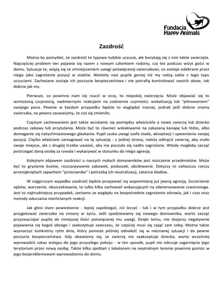Zazdrość Można by pomyśleć, że zazdrość to typowo ludzkie uczucie, ale borykają się z nim także zwierzęta. Najczęściej problem ten pojawia się razem z nowym członkiem rodziny, czy też podczas wizyt gości w domu. Sytuacje te, wiążą się ze zmniejszeniem uwagi poświęcanej zwierzakowi, co zostaje odebrane przez niego jako zagrożenie pozycji w stadzie. Niestety nasi pupile gorzej niż my radzą sobie z tego typu uczuciami. Zachwiane zostaje ich poczucie bezpieczeństwa i nie potrafią kontrolować swoich obaw, tak dobrze jak my. Pierwsze, co powinno nam się rzucić w oczy, to niepokój zwierzęcia. Może objawiać się to wzmożoną czujnością, nadmiernymi reakcjami na codzienne czynności, wokalizacją lub “pilnowaniem” swojego pana. Pewnie w każdym przypadku będzie to wyglądać inaczej, jednak jeśli dobrze znamy zwierzaka, na pewno zauważymy, że coś się zmieniło. Częstym zachowaniem jest także wciskanie się pomiędzy właściciela a nowe zwierzę lub dziecko podczas zabawy lub przytulania. Może być to również wskakiwanie na zakazaną kanapę lub łóżko, albo domaganie się natychmiastowego głaskania. Pupil szuka uwagi szefa stada, akceptacji i upewnienia swojej pozycji. Ciężko właściwie zareagować na tę sytuację - z jednej strony, należy odtrącić zwierzę, aby znało swoje miejsce, ale z drugiej trzeba uważać, aby nie poczuło się nadto zagrożone. Wtedy mogłoby zacząć postrzegać daną osobę za rywala i wykazywać w stosunku do niego agresję. Kolejnym objawem zazdrości u naszych małych domowników jest niszczenie przedmiotów. Może być to gryzienie butów, rozszarpywanie zabawek, poduszek, obsikiwanie. Dotyczy to zwłaszcza rzeczy przesiąkniętych zapachem “przeciwnika” i potrzebą ich neutralizacji, zatarcia śladów. W najgorszym wypadku zazdrość będzie przejawiać się wspomnianą już jawną agresją. Szczerzenie zębów, warczenie, obszczekiwanie, to tylko kilka zachowań wskazujących na zdenerwowanie czworonoga. Jest to najtrudniejszy przypadek, zarówno ze względu na bezpośrednie zagrożenie zdrowia, jak i czas oraz metody oduczania niechcianych reakcji. Jak głosi stare powiedzenie - lepiej zapobiegać, niż leczyć - tak i w tym przypadku dobrze jest przygotować zwierzaka na zmiany w życiu. Jeśli spodziewamy się nowego domownika, warto zacząć przyzwyczajać pupila do mniejszej ilości poświęcanej mu uwagi. Dzięki temu, nie skojarzy negatywnie pojawienia się kogoś obcego i zaakceptuje zawczasu, że częściej musi się zająć sam sobą. Można także wyznaczyć konkretny rytm dnia, który pomoże później odnaleźć się w nieznanej sytuacji i da pewne poczucie bezpieczeństwa. Gdy obawiamy się, że zwierzę nie zaakceptuje dziecka, warto wcześniej wprowadzić zakaz wstępu do jego przyszłego pokoju - w ten sposób, pupil nie odczuje zagarnięcia jego terytorium przez nową osobę. Także kilka spotkań z lokatorem na neutralnym terenie powinno pomóc w jego bezproblemowym wprowadzeniu do domu. Czasem dobrym rozwiązaniem jest stosowanie feromonów przed, oraz w trakcie znaczących zmian w otoczeniu zwierzaka. Nie można ich stosować jako panaceum na wszelkie problemy, ale mogą one znacząco przyspieszyć proces aklimatyzacji. Kiedy domownik pojawił się już w życiu zwierzaka, powinniśmy dbać o odpowiednią ilość uwagi poświęcanej zwierzakowi - nie za dużo, ani nie za mało. Należy starać się znaleźć chwilę na wspólną zabawę, spacer, rzeczy, które pomogą się zrelaksować, zmęczyć i pozbyć natłoku emocji. Możemy również poprosić nowego lokatora, aby on przejął jeden spacer w ciągu dnia, napełnił miskę chrupkami, pobawił się z naszym zwierzakiem. Dzięki temu, szybciej nawiąże się między nimi pozytywna relacja, oboje poznają się lepiej i nauczą reagować na dane zachowania. Warto spróbować także sprawić, aby obecność obcego zaczęła się dobrze kojarzyć zazdrosnemu futrzakowi. Podawanie smakołyków tylko w obecności nowego członka rodziny, wspólne karmienie, pieszczoty, spacery - wszystko, co uwielbia robić nasz zwierzak może się przydać w tej sytuacji. Każdy ze zwierzaków ma inny niepowtarzalny charakter. Także od niego zależy w jaki sposób dany osobnik poradzi sobie z uczuciem zazdrości. Na pewno większe problemy mogą pojawić się u tych bardziej aktywnych, ekspresyjnych, niż u spokojnych i stabilnych emocjonalnie czworonogów. Duży wpływ ma jednak również to, w jak sposób pies czy też kot został wychowany, oraz czy właściciel pomaga mu przetrwać trudny okres zmian. Bardzo ważne jest zapobieganie i to nie tylko w czasie, gdy spodziewamy się kogoś nowego w naszym domu. Trzeba już w zalążku likwidować każde zachowanie zwierzaka wskazujące na jego zaborcze zapędy. Pamiętajmy, że młode osobniki znacznie łatwiej kształtować - czyli zapobiegać niechcianym cechom, a czym skorupka za młodu nasiąknie, tym na starość trąci. Mądrze postępujący właściciel, to najczęściej i mądry, dobrze wychowany zwierzak. Autor tekstu: Aleksandra Skwarcan Pomóż nam pomagać 74 1050 1575 1000 0090 3015 5601 (ING Bank Śląski S.A.) Fundacja Happy Animals ul. Ogrodowa 62 lok. 9, 55-040 Bielany Wrocławskie