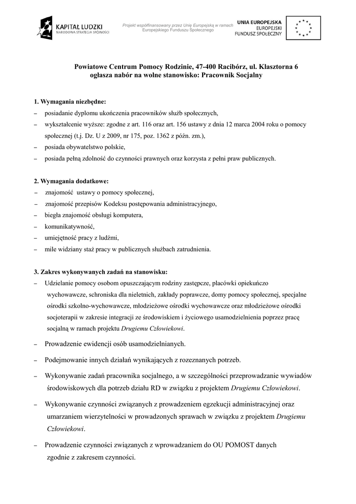 Projekt współfinansowany przez Unię Europejską w ramach Europejskiego Funduszu Społecznego Powiatowe Centrum Pomocy Rodzinie, 47-400 Racibórz, ul. Klasztorna 6 ogłasza nabór na wolne stanowisko: Pracownik Socjalny 1. Wymagania niezbędne: – posiadanie dyplomu ukończenia pracowników służb społecznych, – wykształcenie wyższe: zgodne z art. 116 oraz art. 156 ustawy z dnia 12 marca 2004 roku o pomocy społecznej (t.j. Dz. U z 2009, nr 175, poz. 1362 z późn. zm.), – posiada obywatelstwo polskie, – posiada pełną zdolność do czynności prawnych oraz korzysta z pełni praw publicznych. 2. Wymagania dodatkowe: – znajomość ustawy o pomocy społecznej, – znajomość przepisów Kodeksu postępowania administracyjnego, – biegła znajomość obsługi komputera, – komunikatywność, – umiejętność pracy z ludźmi, – mile widziany staż pracy w publicznych służbach zatrudnienia. 3. Zakres wykonywanych zadań na stanowisku: – Udzielanie pomocy osobom opuszczającym rodziny zastępcze, placówki opiekuńczo wychowawcze, schroniska dla nieletnich, zakłady poprawcze, domy pomocy społecznej, specjalne ośrodki szkolno-wychowawcze, młodzieżowe ośrodki wychowawcze oraz młodzieżowe ośrodki socjoterapii w zakresie integracji ze środowiskiem i życiowego usamodzielnienia poprzez pracę socjalną w ramach projektu Drugiemu Człowiekowi. – Prowadzenie ewidencji osób usamodzielnianych. – Podejmowanie innych działań wynikających z rozeznanych potrzeb. – Wykonywanie zadań pracownika socjalnego, a w szczególności przeprowadzanie wywiadów środowiskowych dla potrzeb działu RD w związku z projektem Drugiemu Człowiekowi. – Wykonywanie czynności związanych z prowadzeniem egzekucji administracyjnej oraz umarzaniem wierzytelności w prowadzonych sprawach w związku z projektem Drugiemu Człowiekowi. – Prowadzenie czynności związanych z wprowadzaniem do OU POMOST danych zgodnie z zakresem czynności. Projekt współfinansowany przez Unię Europejską w ramach Europejskiego Funduszu Społecznego – Archiwizowanie dokumentów działu RD dotyczących spraw prowadzonych zgodnie z zakresem czynności. 3. Warunki pracy – wymiar czasu pracy – pełny etat, – miejsce pracy – Dział Pomocy Rodzinie i Dziecku, teren powiatu raciborskiego, – termin rozpoczęcia pracy – czerwiec 2012 roku 4. Wymagane dokumenty: – życiorys (CV), – list motywacyjny, – dokument poświadczający wykształcenie (dyplom lub zaświadczenie o stanie odbytych studiów), – kwestionariusz osobowy (dostępny w BIP oraz Dziale Obsługi Administracyjnej PCPR), – inne dodatkowe dokumenty o posiadających kwalifikacjach i umiejętnościach, – oświadczenie kandydata, że nie był prawomocnie skazany za przestępstwo umyślne, 5. Wymagane dokumenty należy składać: – osobiście w siedzibie Powiatowego Centrum Pomocy Rodzinie w Raciborzu, ul. Klasztorna 6, – pocztą na adres Powiatowego Centrum Pomocy Rodzinie. Dokumenty należy składać do dnia 28 maja 2012 roku do godziny 15 Informacja o wyniku naboru zostanie umieszczona na stronie internetowej Biuletynu Informacji Publicznej oraz na tablicy informacyjnej w siedzibie jednostki. Dokumenty list motywacyjny, CV powinny być opatrzone klauzulą : Wyrażam zgodę na przetwarzanie moich danych osobowych zawartych w ofercie pracy dla potrzeb niezbędnych do realizacji procesu rekrutacji zgodnie z ustawą z dnia 29 sierpnia 1997 roku o ochronie danych osobowych (tj. Dz, U. z 2002 r., Nr 101, poz. 926 z późn. zm) oraz ustawą z dnia 21 listopada 2008r. o pracownikach samorządowych (Dz. U. Nr 223, poz. 1458 z późn. zm.) Szczegółowe informacje można uzyskać telefonicznie pod numerem 032 415 20 28.