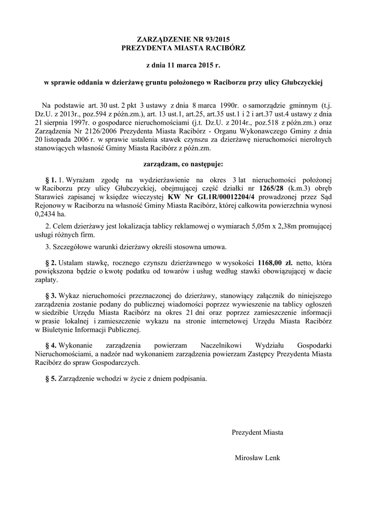ZARZĄDZENIE NR 93/2015 PREZYDENTA MIASTA RACIBÓRZ z dnia 11 marca 2015 r. w sprawie oddania w dzierżawę gruntu położonego w Raciborzu przy ulicy Głubczyckiej Na podstawie art. 30 ust. 2 pkt 3 ustawy z dnia 8 marca 1990r. o samorządzie gminnym (t.j. Dz.U. z 2013r., poz.594 z późn.zm.), art. 13 ust.1, art.25, art.35 ust.1 i 2 i art.37 ust.4 ustawy z dnia 21 sierpnia 1997r. o gospodarce nieruchomościami (j.t. Dz.U. z 2014r., poz.518 z późn.zm.) oraz Zarządzenia Nr 2126/2006 Prezydenta Miasta Racibórz - Organu Wykonawczego Gminy z dnia 20 listopada 2006 r. w sprawie ustalenia stawek czynszu za dzierżawę nieruchomości nierolnych stanowiących własność Gminy Miasta Racibórz z późn.zm. zarządzam, co następuje: § 1. 1. Wyrażam zgodę na wydzierżawienie na okres 3 lat nieruchomości położonej w Raciborzu przy ulicy Głubczyckiej, obejmującej część działki nr 1265/28 (k.m.3) obręb Starawieś zapisanej w księdze wieczystej KW Nr GL1R/00012204/4 prowadzonej przez Sąd Rejonowy w Raciborzu na własność Gminy Miasta Racibórz, której całkowita powierzchnia wynosi 0,2434 ha. 2. Celem dzierżawy jest lokalizacja tablicy reklamowej o wymiarach 5,05m x 2,38m promującej usługi różnych firm. 3. Szczegółowe warunki dzierżawy określi stosowna umowa. § 2. Ustalam stawkę, rocznego czynszu dzierżawnego w wysokości 1168,00 zł. netto, która powiększona będzie o kwotę podatku od towarów i usług według stawki obowiązującej w dacie zapłaty. § 3. Wykaz nieruchomości przeznaczonej do dzierżawy, stanowiący załącznik do niniejszego zarządzenia zostanie podany do publicznej wiadomości poprzez wywieszenie na tablicy ogłoszeń w siedzibie Urzędu Miasta Racibórz na okres 21 dni oraz poprzez zamieszczenie informacji w prasie lokalnej i zamieszczenie wykazu na stronie internetowej Urzędu Miasta Racibórz w Biuletynie Informacji Publicznej. § 4. Wykonanie zarządzenia powierzam Naczelnikowi Wydziału Gospodarki Nieruchomościami, a nadzór nad wykonaniem zarządzenia powierzam Zastępcy Prezydenta Miasta Racibórz do spraw Gospodarczych. § 5. Zarządzenie wchodzi w życie z dniem podpisania. Prezydent Miasta Mirosław Lenk Uzasadnienie Podjęcie zarządzenia w sprawie wydzierżawienia nieruchomości następuje w związku z wnioskiem agencji reklamowej o dzierżawę części działki opisanej szczegółowo w §1. niniejszego zarządzenia. Fragment działki nr 1265/28 k.m.3 obręb Starawieś wydzierżawia się na okres 3 lat, celem lokalizacji tablicy reklamowej o wymiarach 5,05m x 2,38m, promującej usługi różnych firm. Zgodnie z art.37 ust.4 ustawy z dnia 21 sierpnia 1997r. o gospodarce nieruchomościami (j.t. Dz.U. z 2014r., poz.518 z późn.zm) przy dzierżawach terminowych do 3 lat nie ma obowiązku stosowania trybu przetargowego. Nieruchomość, na której której zostanie umieszczona tablica reklamowa stanowi własność Gminy Racibórz i znajduje się poza pasem drogowym. Wnioskowana do dzierżawy działka, zgodnie z zapisami miejscowego planu zagospodarowania przestrzennego obejmującego obszar w jednostce strukturalnej Proszowiec-Starawieś zatwierdzonego Uchwałą Nr XLIII/648/2006 Rady Miasta Racibórz z dnia 24 maja 2006r. (Dz. Urz. Woj. Śl. z 28 sierpnia 2006r. Nr 103, poz.2898) oraz miejscowego planu ogólnego zagospodarowania przestrzennego miasta Raciborza zatwierdzonego Uchwałą Nr XXV/316/97 Rady Miejskiej w Raciborzu z dnia 19 marca 1997r. (Dz. Urz. Woj. Kat. z dnia 15 lipca 1997r. Nr 23, poz.158), zlokalizowana jest na terenach oznaczonych symbolami: F2U i F7U - tereny zabudowy usługowej, F9KDD i F11KDD - tereny dróg publicznych klasy dojazdowa, F1KDG - tereny dróg publicznych klasy główna oraz 4''MJ - tereny zabudowy mieszkaniowej jednorodzinnej. Zapisy te dopuszczają lokalizację tablic reklamowych na zasadach określonych szczegółowo w tekście wyżej powołanych planów. Możliwość dzierżawy na wskazany cel uzyskała pozytywne opinie Wydziału Dróg Miejskich i Wydziału Inwestycji i Urbanistyki. Ustawienie reklamy wymaga jednakże spełnienia szeregu warunków, które zawarte zostaną w umowie dzierżawy. Biorąc pod uwagę powyższe okoliczności postanowiono jak w sentencji. Załącznik do Zarządzenia Prezydenta Miasta Racibórz nr 93/2015 z dnia 11 marca 2015r. WYKAZ NIERUCHOMOŚCI PRZEZNACZONEJ DO DZIERŻAWY NA CELE NIEROLNE Na podstawie art. 35 ust.1 i 2 ustawy z 21 sierpnia 1997r. o gospodarce nieruchomościami (t.j. Dz.U.Nr z 2014r. poz.518 z późn.zm.) Prezydent Miasta podaje do publicznej wiadomości, że z zasobu nieruchomości Gminy Miasta Racibórz została przeznaczona do dzierżawy następująca nieruchomość: 1. Oznaczenie nieruchomości według księgi wieczystej oraz katastru nieruchomości: 1) numer księgi wieczystej: KW Nr GL1R/00012204/4, 2) nieruchomość opisana ewidencyjnie numerem działki 1265/28 (k.m.3) obręb Starawieś; 3) klaso-użytek: Bi 2. Powierzchnia nieruchomości: 1) Całkowita powierzchnia nieruchomości: 0,2434 ha. 2) Powierzchnia dzierżawy: tablica reklamowa o wymiarach 5,50 m x 2,38 m. 3. Opis nieruchomości: Nieruchomość położona w Raciborzu przy ulicy Głubczyckiej, stanowiąca własność Gminy Miasta Racibórz. 4. Przeznaczenie nieruchomości i sposób ich zagospodarowania: Wnioskowana nieruchomość, zgodnie z zapisami miejscowego planu zagospodarowania przestrzennego obejmującego obszar w jednostce strukturalnej Proszowiec-Starawieś zatwierdzonego Uchwałą Nr XLIII/648/2006 Rady Miasta Racibórz z dnia 24 maja 2006r. (Dz. Urz. Woj. Śl. z 28 sierpnia 2006r. Nr 103, poz.2898) oraz miejscowego planu ogólnego zagospodarowania przestrzennego miasta Raciborza zatwierdzonego Uchwałą Nr XXV/316/97 Rady Miejskiej w Raciborzu z dnia 19 marca 1997r. (Dz. Urz. Woj. Kat. z dnia 15 lipca 1997r. Nr 23, poz.158), zlokalizowana jest na terenach oznaczonych symbolami: F2U i F7U - tereny zabudowy usługowej, F9KDD i F11KDD - tereny dróg publicznych klasy dojazdowa, F1