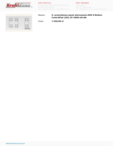 akcesoriamuzyczne.pl Salon Bemowo Salon Białołęka Powstańców Śląskich 87 lok. U10 B 01-466 Warszawa Tel. (22)427-89-95, (22)398-73-32 Kabrioletu 4 03-117 Warszawa Tel. (22)490-31-43, (22)243-36-05 Nazwa: 6- przyciskowy panel sterowania AMX 6-Button ControlPad (UK) CP-2006-UK-BA Cena: 1 636,00 zł