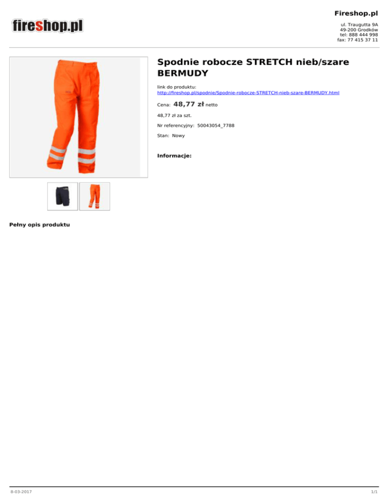 Fireshop.pl ul. Traugutta 9A 49-200 Grodków tel: 888 444 998 fax: 77 415 37 11 Spodnie robocze STRETCH nieb/szare BERMUDY link do produktu: http://fireshop.pl/spodnie/Spodnie-robocze-STRETCH-nieb-szare-BERMUDY.html Cena: 48,77 zł netto 48,77 zł za szt. Nr referencyjny: 50043054_7788 Stan: Nowy Informacje: Pełny opis produktu 8-03-2017 1/1