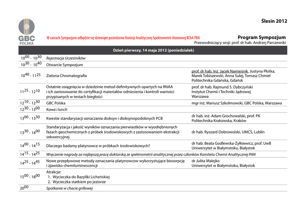 Ślesin 2012 W ramach Sympozjum odbędzie się dziewiąte posiedzenie Komisji Analitycznej Spektrometrii Atomowej KChA PAN Program Sympozjum Przewodniczący sesji: prof. dr hab. Andrzej Parczewski POLSKA www.gbcpolska.pl Dzień pierwszy, 14 maja 2012 (poniedziałek) 1000 - 1030 1030 - 1040 Rejestracja Uczestników Otwarcie Sympozjum 1040 - 1125 Zielona Chromatografia prof. dr hab. inż. Jacek Namieśnik, Justyna Płotka, Marek Tobiszewski, Anna Sulej, Tomasz Chmiel Politechnika Gdańska, Gdańsk 1125 - 1210 Ostatnie osiągnięcia w dziedzinie metod definitywnych opartych na RNAA i ich zastosowanie do certyfikacji materiałów odniesienia i kontroli wartości przypisanych w testach biegłości prof. dr hab. Rajmund S. Dybczyński Instytut Chemii i Techniki Jądrowej Warszawa GBC Polska mgr inż. Mariusz Szkolmowski, GBC Polska, Warszawa 1210 - 1230 1230 - 1300 Kawa i lunch 1300 - 1330 Kwestie standaryzacji oznaczania dioksyn i dioksynopodobnych PCB dr hab. inż. Adam Grochowalski, prof. PK Politechnika Krakowska, Kraków 1330 - 1400 Standaryzacja i jakość wyników oznaczania pierwiastków w wyodrębnionych fazach geochemicznych z próbek środowiskowych z zastosowaniem ekstrakcji sekwencyjnej dr hab. Ryszard Dobrowolski, UMCS, Lublin 1400 - 1415 Dlaczego badamy platynowce w próbkach środowiskowych? 1415 - 1425 dr hab. Beata Godlewska-Żyłkiewicz, prof. UwB Uniwersytet w Białymstoku, Białystok Wręczenie nagrody za najlepszą pracę doktorską ze spektrometrii analitycznej przez członków Komitetu Chemii Analitycznej PAN 1425 - 1445 Nowe przepływowe metody oznaczania platynowcow wykorzystujące biosorpcję i zjawisko chemiluminescencji 1500 - 1800 Atrakcje: 1. Wycieczka do Bazyliki Licheńskiej 2. Wycieczka statkiem po jeziorze 2000 Spotkanie w chacie grillowej dr Julita Malejko Uniwersytet w Białymstoku, Białystok Ślesin 2012 Program Sympozjum Przewodniczący sesji - dr hab. inż. Adam Grochowalski, prof. PK POLSKA www.gbcpolska.pl Dzień drugi, 15 maja 2012 (wtorek) 845 - 930 Śniadanie 930 - 1000 Zastosowanie spektrometrii mas w badaniach antydopingowych: czyli o procedurach znormalizowanych i Mistrzostwach Europy w Piłce Nożnej Euro ‘2012 prof. dr hab. Ewa Bulska Uniwersytet Warszawski, Warszawa 1000 - 1045 Advancements in Laser Ablation ICP-MS and LIBS; from Nanosecond to Femtoseconds R.E. Russo, PhD Lawrence Berkeley National Laboratory, Berkeley, CA 1045 - 1100 Kawa 1100 - 1115 Techniki elektromigracyjne - książka roku Wydawnictwa MALAMUT - NOWA KSIĄŻKA pod redakcją prof. Bogusława Buszewskiego 1115 - 1145 Rola materiałów odniesienia w sterowaniu jakością dr hab. Beata Godlewska-Żyłkiewicz, prof. UwB Uniwersytet w Białymstoku, Białystok 1145 - 1215 1215 - 1245 Jakość wyników specjacyjnego oznaczania pierwiastków techniką HPLC‑ICP‑MS prof. dr hab. Danuta Barałkiewicz, UAM, Poznań Rola i znaczenie materii organicznej gleb dr Przemysław Kosobucki, Wydział Chemii UMK, Toruń Sposób oceny niepewności przygotowania próbki do badań w laboratorium dr Waldemar Korol, Krajowe Laboratorium Pasz, Lublin 1245 - 1315 1315 - 1345 1345 - 1645 Obiad Warsztaty aparaturowe (rotacyjne zajęcia w podgrupach) Najnowsze rozwiązania w technice wagowej i filtracyjnej Sartorius Rozwiązania firmy Foss w zakresie analizy chemicznej; demonstracja aparatu do analizy Kjeldahla FOSS Nowe systemy do oznaczania rtęci Testchem 1645 - 1700 Kawa 1700 - 1730 Standaryzacja testów laboratoryjnych stosowanych do kontroli ilości wymywanych metali z materiałów kontaktujących się z wodą przeznaczoną do spożycia przez ludzi mgr inż. Dorota Święcicka, dr Sławomir Garboś Narodowy Instytut Zdrowia Publicznego Państwowy Zakład Higieny, Warszawa 1730 - 1750 Winter Conference on Plasma Spectrochemistry, Tucson USA European Winter Conference on Plasma Spectrochemistry, Kraków dr hab. Stanisław Walas, Uniwersytet Jagielloński, Kraków 1750 - 1800 2000 Nowości MALAMUTA czyli nie tylko “Analityką” MALAMUT żyje dr Piotr Bieńkowski, Warszawa Uroczysta kolacja Ślesin 2012 Program Sympozjum Przewodniczący sesji - dr hab. Ryszard Dobrowolski POLSKA www.gbcpolska.pl Dzień trzeci, 16 maja 2012 (środa) Śniadanie 930 - 1000 Porównania międzylaboratoryjne - jak je organizować i dlaczego warto... mgr inż. Agnieszka Kalarus, ekspert techniczny PCA Ferrocarbo, Kraków 1000 - 1030 Dobór i optymalizacja warunków rozdzielania w GC i HPLC 1030 - 1045 prof. dr hab. Waldemar Wardencki Politechnika Gdańska, Gdańsk Kawa 1045 - 1115 Jak zwiększyć pewność w szacowaniu niepewności? dr hab. inż. Piotr Konieczka Politechnika Gdańska, Gdańsk 1115 - 1145 Problemy analityczne związane z atestacją materiału na certyfikowany materiał odniesienia miedzi wysokiej czystości dr inż. Ewa Szmyd Instytut Metali Nieżelaznych, Gliwice 1145 - 1215 Prezentowanie wyników badań - wybrane błędy prezentacji dr hab. Stanisław Walas Uniwersytet Jagielloński, Kraków 1215 - 1245 Spektrometria mas z plazmą indukcyjnie sprzężoną od podstaw czyli ICP MS dla praktyków prof. dr hab. Ewa Bulska Uniwersytet Warszawski, Warszawa 1245 1300 Zamknięcie Sympozjum Obiad -A n al ity ka od po ds ta w 900 - 930