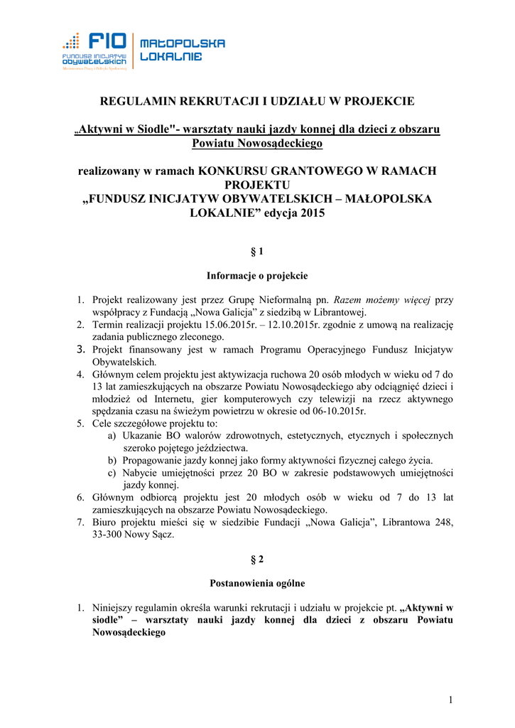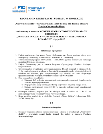REGULAMIN REKRUTACJI I UDZIAŁU W PROJEKCIE „Aktywni w Siodle"- warsztaty nauki jazdy konnej dla dzieci z obszaru Powiatu Nowosądeckiego realizowany w ramach KONKURSU GRANTOWEGO W RAMACH PROJEKTU „FUNDUSZ INICJATYW OBYWATELSKICH – MAŁOPOLSKA LOKALNIE” edycja 2015 §1 Informacje o projekcie 1. Projekt realizowany jest przez Grupę Nieformalną pn. Razem możemy więcej przy współpracy z Fundacją „Nowa Galicja” z siedzibą w Librantowej. 2. Termin realizacji projektu 15.06.2015r. – 12.10.2015r. zgodnie z umową na realizację zadania publicznego zleconego. 3. Projekt finansowany jest w ramach Programu Operacyjnego Fundusz Inicjatyw Obywatelskich. 4. Głównym celem projektu jest aktywizacja ruchowa 20 osób młodych w wieku od 7 do 13 lat zamieszkujących na obszarze Powiatu Nowosądeckiego aby odciągnięć dzieci i młodzież od Internetu, gier komputerowych czy telewizji na rzecz aktywnego spędzania czasu na świeżym powietrzu w okresie od 06-10.2015r. 5. Cele szczegółowe projektu to: a) Ukazanie BO walorów zdrowotnych, estetycznych, etycznych i społecznych szeroko pojętego jeździectwa. b) Propagowanie jazdy konnej jako formy aktywności fizycznej całego życia. c) Nabycie umiejętności przez 20 BO w zakresie podstawowych umiejętności jazdy konnej. 6. Głównym odbiorcą projektu jest 20 młodych osób w wieku od 7 do 13 lat zamieszkujących na obszarze Powiatu Nowosądeckiego. 7. Biuro projektu mieści się w siedzibie Fundacji „Nowa Galicja”, Librantowa 248, 33-300 Nowy Sącz. §2 Postanowienia ogólne 1. Niniejszy regulamin określa warunki rekrutacji i udziału w projekcie pt. „Aktywni w siodle” – warsztaty nauki jazdy konnej dla dzieci z obszaru Powiatu Nowosądeckiego 1 2. Grupa nieformalna wraz z Fundacją „Nowa Galicja” z siedzibą w Librantowej zakwalifikuje do udziału w projekcie łącznie 20 dzieci. 3. Udział dziecka w projekcie jest finansowany w 79,8% z budżetu projektu. Rodzice/ prawni opiekunowie zobowiązani są do pokrycia łącznego wkładu własnego do projektu w kwocie do 2 100 zł. Koszt udziału 1 dziecka w projekcie wyniesie nie więcej niż 90 zł. Organizator w ramach kosztów projektu zapewnia: instruktora jazdy konnej, plac jeździecki, konie, stajnie, napoje dla dzieci podczas zajęć, dyplomy. 4. Rodzice/prawni opiekunowie zobowiązani są w wyznaczonych terminach zajęć przywieźć dziecko do stadniny koni w Nawojowej, a po skończonych zajęciach odebrać je osobiście lub przez pisemnie upoważnioną osobę. 5. W ramach projektu przeprowadzone zostaną następujące zajęcia: Terminy realizacji Poszczególne działania w zakresie poszczególnych działań realizowanego zadania publicznego Etap I: Nauka jazdy konnej dla początkujących: obejmuje naukę jazdy konnej od podstaw na lonży i w grupie (w zastępie); założenia Lipiec – wrzesień 2015 szkolenia - nauka równowagi i rozluźnienia podczas jazdy w stępie i w kłusie, właściwego używania podstawowych pomocy jeździeckich Stadnina koni w Nawojowej (łydek, dosiadu, wodzy). W programie zajęcia praktyczne i teoretyczne na ujeżdżalni: - omówienie zasad bezpieczeństwa w stajni i przy koniu, - zapoznanie się ze sprzętem jeździeckim, - przygotowanie konia do jazdy i oporządzenie konia po jeździe, - dopasowanie sprzętu na koniu, - prawidłowe prowadzenie konia, wchodzenie i wychodzenie z ujeżdżalni, regulamin ujeżdżalni, - wsiadanie na konia, - jazda na lonży - jazda w zastępie za czołowym. Uczestnicy projektu zostaną podzieleni na 4 grupy 5 osobowe. Czas zajęć: 3h-4h dziennie w okresie wakacyjnym; 1 raz w tygodniu; łącznie 20h/grupę; łącznie: 80h. Zapewniamy: instruktora jazdy konnej, plac jeździecki, konie, stajnie, napoje dla dzieci podczas zajęć II etap: Pokaz jazdy konnej Organizacja imprezy pokazowej dla rodziców dzieci objętych Lipiec – wrzesień 2015 projektem oraz zaproszonych gości aby pokazać jakie walory zdrowotne ma ruch na świeżym powietrzu, co daje nam jazda konna, Stadnina koni w Nawojowej ile radności dzieciom dają takie zajęcia. Czas trwania imprezy: 2h. Program: 1. Wprowadzenie - prezentacja zalet jazdy konnej 2. Pokaz umiejętności jeździeckich nabytych przez uczestników projektu 3. Pokaz profesjonalnej jazdy konnej- instruktor 4. Wręczenie dyplomów uczestników 5. Poczęstunek Liczba uczestników: ok. 70 osób 2 §3 Kryteria rekrutacji 1. Rekrutacja przeprowadzona będzie w okresie 22.06.2015r. do 28.06.2015r. 2. Dokumenty rekrutacyjne znajdują się na stronie www organizacji wspierającej www.fundacjanowagalicja.pl w zakładce Realizowane projekty 3. Działaniami będzie objętych (grupa docelowa) 20 dzieci w wieku 7 – 13 lat zamieszkujących na terenie Powiatu Nowosądeckiego. 4. Do udziału w projekcie mogą zgłaszać się osoby spełniające poniższe kryteria: a) są w wieku 7 – 13 lat i zamieszkują na terenie Powiatu Nowosądeckiego b) dostarczą w okresie od 22.06.2015 do 28.06.2015r. komplet dokumentów rekrutacyjnych tj. Formularz zgłoszeniowy stanowiący zał. Nr 1 do regulaminu c) dostarczą zgodę rodziców/opiekunów prawnych na przetwarzanie danych osobowych i na wykorzystanie wizerunku stanowiące załącznik nr 3 do regulaminu; d) dostarczą zgodę rodziców/ prawnych opiekunów na udział w projekcie- deklarację udziału w projekcie stanowiącą zał. Nr 2 do regulaminu; e) dostarczą komplet dokumentów rekrutacyjnych w terminie trwania naboru, f) stan zdrowia dziecka umożliwia jego udział w zajęciach. 5. W projekcie stosować będziemy następujące kryteria preferencyjne: a) Pochodzenie z rodziny wielodzietnej – 5 pkt b) Pochodzenie z rodziny, gdzie rodzic lub dziecko jest niepełnosprawne – 5 pkt c) Pochodzenie z rodziny korzystającej z pomocy OPS – 5 pkt §4 Procedura naboru 1. Osobą odpowiedzialną za przebieg rekrutacji jest Koordynator. 2. Odpowiedzialność za bieżącą obsługę warsztatów należy do Koordynatora Projektu i trenerów prow