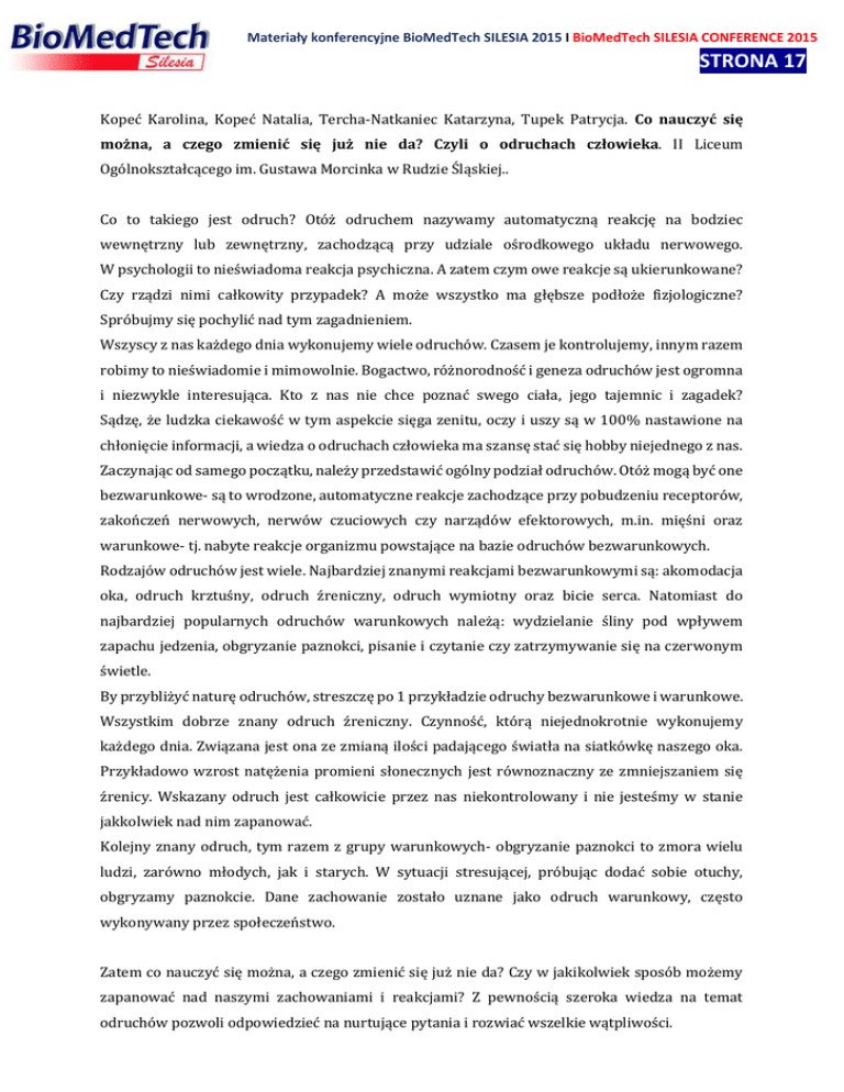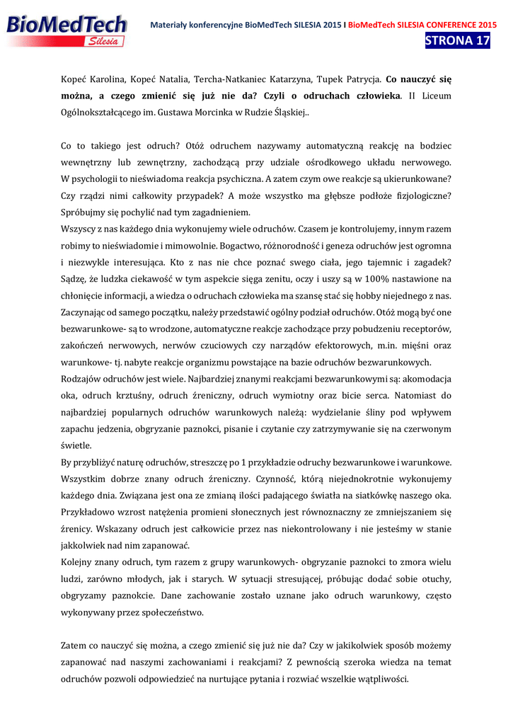 Materiały konferencyjne BioMedTech SILESIA 2015 I BioMedTech SILESIA CONFERENCE 2015 STRONA 172 Kopeć Karolina, Kopeć Natalia, Tercha-Natkaniec Katarzyna, Tupek Patrycja. Co nauczyć się można, a czego zmienić się już nie da? Czyli o odruchach człowieka. II Liceum Ogólnokształcącego im. Gustawa Morcinka w Rudzie Śląskiej.. Co to takiego jest odruch? Otóż odruchem nazywamy automatyczną reakcję na bodziec wewnętrzny lub zewnętrzny, zachodzącą przy udziale ośrodkowego układu nerwowego. W psychologii to nieświadoma reakcja psychiczna. A zatem czym owe reakcje są ukierunkowane? Czy rządzi nimi całkowity przypadek? A może wszystko ma głębsze podłoże fizjologiczne? Spróbujmy się pochylić nad tym zagadnieniem. Wszyscy z nas każdego dnia wykonujemy wiele odruchów. Czasem je kontrolujemy, innym razem robimy to nieświadomie i mimowolnie. Bogactwo, różnorodność i geneza odruchów jest ogromna i niezwykle interesująca. Kto z nas nie chce poznać swego ciała, jego tajemnic i zagadek? Sądzę, że ludzka ciekawość w tym aspekcie sięga zenitu, oczy i uszy są w 100% nastawione na chłonięcie informacji, a wiedza o odruchach człowieka ma szansę stać się hobby niejednego z nas. Zaczynając od samego początku, należy przedstawić ogólny podział odruchów. Otóż mogą być one bezwarunkowe- są to wrodzone, automatyczne reakcje zachodzące przy pobudzeniu receptorów, zakończeń nerwowych, nerwów czuciowych czy narządów efektorowych, m.in. mięśni oraz warunkowe- tj. nabyte reakcje organizmu powstające na bazie odruchów bezwarunkowych. Rodzajów odruchów jest wiele. Najbardziej znanymi reakcjami bezwarunkowymi są: akomodacja oka, odruch krztuśny, odruch źreniczny, odruch wymiotny oraz bicie serca. Natomiast do najbardziej popularnych odruchów warunkowych należą: wydzielanie śliny pod wpływem zapachu jedzenia, obgryzanie paznokci, pisanie i czytanie czy zatrzymywanie się na czerwonym świetle. By przybliżyć naturę odruchów, streszczę po 1 przykładzie odruchy bezwarunkowe i warunkowe. Wszystkim dobrze znany odruch źreniczny. Czynność, którą niejednokrotnie wykonujemy każdego dnia. Związana jest ona ze zmianą ilości padającego światła na siatkówkę naszego oka. Przykładowo wzrost natężenia promieni słonecznych jest równoznaczny ze zmniejszaniem się źrenicy. Wskazany odruch jest całkowicie przez nas niekontrolowany i nie jesteśmy w stanie jakkolwiek nad nim zapanować. Kolejny znany odruch, tym razem z grupy warunkowych- obgryzanie paznokci to zmora wielu ludzi, zarówno młodych, jak i starych. W sytuacji stresującej, próbując dodać sobie otuchy, obgryzamy paznokcie. Dane zachowanie zostało uznane jako odruch warunkowy, często wykonywany przez społeczeństwo. Zatem co nauczyć się można, a czego zmienić się już nie da? Czy w jakikolwiek sposób możemy zapanować nad naszymi zachowaniami i reakcjami? Z pewnością szeroka wiedza na temat odruchów pozwoli odpowiedzieć na nurtujące pytania i rozwiać wszelkie wątpliwości.
