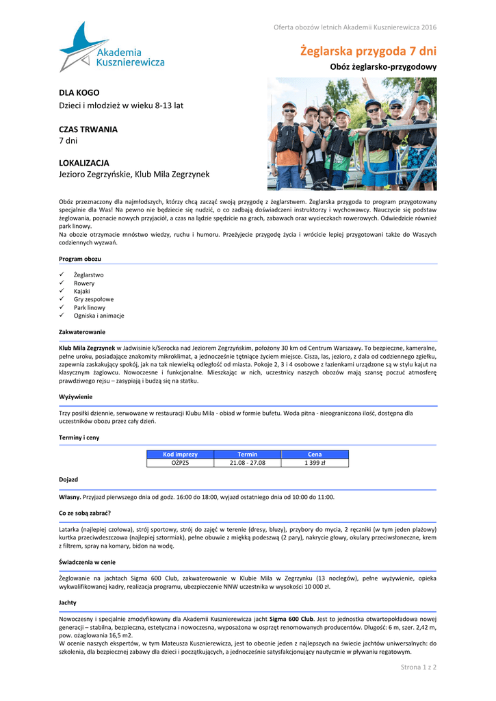 Oferta obozów letnich Akademii Kusznierewicza 2016 Żeglarska przygoda 7 dni Obóz żeglarsko-przygodowy DLA KOGO Dzieci i młodzież w wieku 8-13 lat CZAS TRWANIA 7 dni LOKALIZACJA Jezioro Zegrzyńskie, Klub Mila Zegrzynek Obóz przeznaczony dla najmłodszych, którzy chcą zacząć swoją przygodę z żeglarstwem. Żeglarska przygoda to program przygotowany specjalnie dla Was! Na pewno nie będziecie się nudzić, o co zadbają doświadczeni instruktorzy i wychowawcy. Nauczycie się podstaw żeglowania, poznacie nowych przyjaciół, a czas na lądzie spędzicie na grach, zabawach oraz wycieczkach rowerowych. Odwiedzicie również park linowy. Na obozie otrzymacie mnóstwo wiedzy, ruchu i humoru. Przeżyjecie przygodę życia i wrócicie lepiej przygotowani także do Waszych codziennych wyzwań. Program obozu Żeglarstwo Rowery Kajaki Gry zespołowe Park linowy Ogniska i animacje Zakwaterowanie Klub Mila Zegrzynek w Jadwisinie k/Serocka nad Jeziorem Zegrzyńskim, położony 30 km od Centrum Warszawy. To bezpieczne, kameralne, pełne uroku, posiadające znakomity mikroklimat, a jednocześnie tętniące życiem miejsce. Cisza, las, jezioro, z dala od codziennego zgiełku, zapewnia zaskakujący spokój, jak na tak niewielką odległość od miasta. Pokoje 2, 3 i 4 osobowe z łazienkami urządzone są w stylu kajut na klasycznym żaglowcu. Nowoczesne i funkcjonalne. Mieszkając w nich, uczestnicy naszych obozów mają szansę poczuć atmosferę prawdziwego rejsu – zasypiają i budzą się na statku. Wyżywienie Trzy posiłki dziennie, serwowane w restauracji Klubu Mila - obiad w formie bufetu. Woda pitna - nieograniczona ilość, dostępna dla uczestników obozu przez cały dzień. Terminy i ceny Kod imprezy OŻPZ5 Termin 21.08 - 27.08 Cena 1 399 zł Dojazd Własny. Przyjazd pierwszego dnia od godz. 16:00 do 18:00, wyjazd ostatniego dnia od 10:00 do 11:00. Co ze sobą zabrać? Latarka (najlepiej czołowa), strój sportowy, strój do zajęć w terenie (dresy, bluzy), przybory do mycia, 2 ręczniki (w tym jeden plażowy) kurtka przeciwdeszczowa (najlepiej sztormiak), pełne obuwie z miękką podeszwą (2 pary), nakrycie głowy, okulary przeciwsłoneczne, krem z filtrem, spray na komary, bidon na wodę. Świadczenia w cenie Żeglowanie na jachtach Sigma 600 Club, zakwaterowanie w Klubie Mila w Zegrzynku (13 noclegów), pełne wyżywienie, opieka wykwalifikowanej kadry, realizacja programu, ubezpieczenie NNW uczestnika w wysokości 10 000 zł. Jachty Nowoczesny i specjalnie zmodyfikowany dla Akademii Kusznierewicza jacht Sigma 600 Club. Jest to jednostka otwartopokładowa nowej generacji – stabilna, bezpieczna, estetyczna i nowoczesna, wyposażona w osprzęt renomowanych producentów. Długość: 6 m, szer. 2,42 m, pow. ożaglowania 16,5 m2. W ocenie naszych ekspertów, w tym Mateusza Kusznierewicza, jest to obecnie jeden z najlepszych na świecie jachtów uniwersalnych: do szkolenia, dla bezpiecznej zabawy dla dzieci i początkujących, a jednocześnie satysfakcjonujący nautycznie w pływaniu regatowym. Strona 1 z 2 Oferta obozów letnich Akademii Kusznierewicza 2016 Na jachcie pływa do 5 osób plus instruktor. Kadra Akademia Kusznierewicza to ludzie z pasją, współpracujący z nami od lat - wysokiej klasy specjaliści, instruktorzy, sternicy, trenerzy, wychowawcy, posiadający wieloletnie doświadczenie w pracy z młodzieżą, predyspozycje pedagogiczne, a przede wszystkim radość dzielenia się wiedzą i umiejętnościami. Przykładowy plan dnia 8:00 8:30 9:15 10:00 13:30 14:00 15:00 19:00 20:00 22:00 Gimnastyka poranna Śniadanie Apel organizacyjny Zajęcia programowe Obiad Przerwa poobiednia Zajęcia programowe Kolacja Zajęcia wieczorne Cisza nocna Opcjonalnie Wyżywienie W przypadku dzieci wymagających specjalnej diety, istnieje możliwość dostosowania posiłków do potrzeb uczestnika (np. dieta wegetariańska) bez dodatkowych opłat. Prosimy o zgłoszenie takiej potrzeby w momencie dokonywania rezerwacji. Kontakt i rezerwacje Akademia Kusznierewicza T: (22) 844 77 99 lub 661 070 000 E: [email protected] | www.AkademiaKusznierewicza.pl Strona 2 z 2