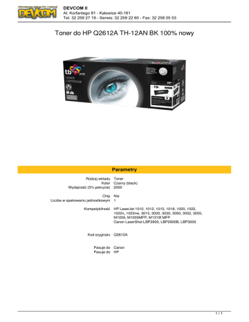 DEVCOM II Al. Korfantego 81 - Katowice 40-161 Tel. 32 259 27 19 - Serwis: 32 259 22 60 - Fax: 32 258 05 53 Toner do HP Q2612A TH-12AN BK 100% nowy Parametry Rodzaj wkładu Toner Kolor Czarny (black) Wydajność (5% pokrycie) 2000 Chip Nie Liczba w opakowaniu jednostkowym 1 Kompatybilność HP LaserJet 1010, 1012, 1015, 1018, 1020, 1022, 1022n, 1022nw, 3015, 3020, 3030, 3050, 3052, 3055, M1005, M1005MFP, M1319f MFP Canon LaserShot LBP2900, LBP2900B, LBP3000 Kod oryginału Q2612A Pasuje do Canon Pasuje do HP 1/1 Powered by TCPDF (www.tcpdf.org)
