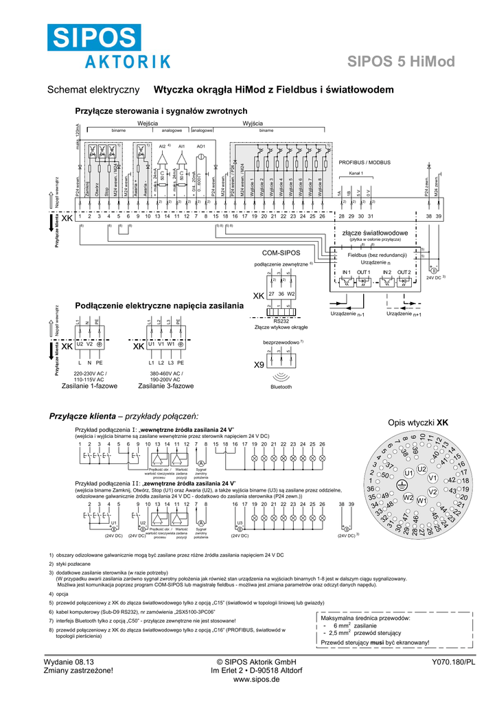 SIPOS 5 HiMod Schemat elektryczny Wtyczka okrągła HiMod z Fieldbus i światłowodem Przyłącze sterowania i sygnałów zwrotnych 2) XK 1 2 3 4 8) 5 8) 8) 6 9 analogowe 2) 1) 2) 10 13 14 11 12 2) 7 PROFIBUS / MODBUS 2) 8 2) 15 18 16 17 19 20 21 22 23 24 25 26 8) 2) M24 zewn. P24 zewn. 0V 2) 2) 28 29 30 31 38 39 5) 8) 5) 8) złącze światłowodowe (płytka w osłonie przyłącza) 8) 2) IN 1 OUT 1 PE 5 5 L3 2 N PE Urządzenie n+1 X9 L1 L2 L3 PE 380-460V AC / 190-200V AC Zasilanie 3-fazowe Bluetooth Przyłącze klienta – przykłady połączeń: Opis wtyczki XK 2 3 4 5 6 9 10 13 14 11 12 7 8 15 18 16 17 19 20 21 22 23 24 25 26 6 1 5 Sygnał zwrotny położenia Przykład podłączenia II: „zewnętrzne źródła zasilania 24 V” (wejścia binarne Zamknij, Otwórz, Stop (U1) oraz Awaria (U2), a także wyjścia binarne (U3) są zasilane przez oddzielne, odizolowane galwanicznie źródła zasilania 24 V DC - dodatkowo do zasilania sterownika (P24 zewn.)) 5 10 13 14 11 12 U2 + Prędkość obr. / Wartość wartość rzeczywista zadana procesu pozycji (24V DC) 7 8 16 17 19 20 21 22 23 24 25 26 A U3 + Sygnał zwrotny położenia 38 39 + (24V DC) 3) (24V DC) 15 16 U2 17 U1 V1 42 18 43 19 V2 20 W2 W1 21 44 22 41 23 24 5 45 2 26 27 U1 - + (24V DC) 9 - 4 - 3 - 2 4 3 37 2 5 0 1 36 35 49 34 48 33 32 31 A Prędkość obr. / Wartość wartość rzeczywista zadana procesu pozycji 9 39 8 38 7 (wejścia i wyjścia binarne są zasilane wewnętrznie przez sterownik napięciem 24 V DC) 14 Przykład podłączenia I: „wewnętrzne źródła zasilania 24 V” 10 11 12 13 Zasilanie 1-fazowe 40 220-230V AC / 110-115V AC 30 29 4 7 28 46 L 24V DC 3) bezprzewodowo 7) U1 V1 W1 XK + - OUT 2 RS232 Złącze wtykowe okrągłe 3 U2 V2 L2 L1 PE N L1 Urządzenie n-1 XK IN 2 5) 27 36 W2 2 Napęd wewnątrz Podłączenie elektryczne napięcia zasilania 6) 2) 1 XK Fieldbus (bez redundancji) Urządzenie n 5 3 2 podłączenie zewnętrzne 8) 5) COM-SIPOS Przyłącze klienta 5V 1B Wyjście 8 Wyjście 7 Wyjście 6 Wyjście 5 Wyjście 4 Wyjście 3 Wyjście 2 Kanał 1 Wyjście 1 M24 wewn. / M24 P24 wewn. / P24 M24 wewn. P24 wewn. + 0/4...20mA 0…600 - AO1 50 2) binarne 1A AI1 - 50 - Awaria - Awaria + AI2 4) + maks. 24mA 1) M24 wewn. M24 wewn. / M24 Stop Zamknij Otwórz 1) P24 wewn. Napęd wewnątrz Przyłącze klienta Wyjścia analogowe + maks. 24mA maks. 120mA Wejścia binarne 1) obszary odizolowane galwanicznie mogą być zasilane przez różne źródła zasilania napięciem 24 V DC 2) styki pozłacane 3) dodatkowe zasilanie sterownika (w razie potrzeby) (W przypadku awarii zasilania zarówno sygnał zwrotny położenia jak również stan urządzenia na wyjściach binarnych 1-8 jest w dalszym ciągu sygnalizowany. Możliwa jest komunikacja poprzez program COM-SIPOS lub magistralę fieldbus - możliwa jest zmiana parametrów oraz odczyt danych napędu). 4) opcja 5) przewód połączeniowy z XK do złącza światłowodowego tylko z opcją „C15” (światłowód w topologii liniowej lub gwiazdy) 6) kabel komputerowy (Sub-D9 RS232), nr zamówienia „2SX5100-3PC06” 7) interfejs Bluetooth tylko z opcją „C50” - przyłącze zewnętrzne nie jest stosowane! 8) przewód połączeniowy z XK do złącza światłowodowego tylko z opcją „C16” (PROFIBUS, światłowód w topologii pierścienia) Maksymalna średnica przewodów: - 6 mm2 zasilanie - 2,5 mm2 przewód sterujący Przewód sterujący musi być ekranowany! Wydanie 08.13 Zmiany zastrzeżone! © SIPOS Aktorik GmbH Im Erlet 2 • D-90518 Altdorf www.sipos.de Y070.180/PL