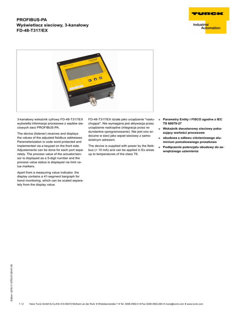 PROFIBUS-PA Wyświetlacz sieciowy, 3-kanałowy FD-48-T317/EX 3-kanałowy wskaźnik cyfrowy FD-48-T317/EX wyświetla informacje procesowe z węzłów sieciowych sieci PROFIBUS-PA. The device (listener) receives and displays the values of the adjusted fieldbus addresses. Parameterization is code word protected and implemented via a keypad on the front side. Adjustements can be done for each port separately. The process value of the actuator/sensor is displayed as a 5-digit number and the process value status is displayed via limit value markers. FD-48-T317/EX działa jako urządzenie "nasłuchujące". Nie wymagana jest aktywacja przez urządzenie nadrzędne (integracja przez redundantne oprogramowanie). Nie jest ono widoczne w sieci jako węzeł sieciowy z samodzielnym adresem. ■ Parametry Entity i FISCO zgodne z IEC TS 60079-27 The device is supplied with power by the fieldbus (< 10 mA) and can be applied in Ex areas up to temperatures of the class T6. ■ Podłączenie potencjału obudowy do zewnętrznego uziemienia ■ Wskaźnik dwustanowy sieciowy pokazujący wartości procesowe ■ obudowa z odlewu ciśnieniowego aluminium pomalowanego proszkowo Edition • 2016-11-10T03:01:26+01:00 Apart from a measuring value indicator, the display contains a 41-segment bargraph for trend monitoring, which can be scaled separately from the display value. 1/2 Hans Turck GmbH & Co.KG ñ D-45472 Mülheim an der Ruhr ñ Witzlebenstraße 7 ñ Tel. 0208 4952-0 ñ Fax 0208 4952-264 ñ [email protected] ñ www.turck.com PROFIBUS-PA Wyświetlacz sieciowy, 3-kanałowy FD-48-T317/EX Typ Nr kat. FD-48-T317/EX 6901315 Standard sieciowy IEC 61158-2 Napięcie zasilania Samokompensacja prądowa 9…30 VDC ð 10 mA Wskazanie Wyświetlacz element pozycjonujący LCD, 5-cyfrowe, 7-segmentowe Wymiary Dopuszczenie Ex zgodne z odpowiednimi certyfikata- TÜV 07 ATEX 553588 mi Oznaczenie urządzenia É II 2 (1) G EEx ia IIC T6 lub T5 Oznaczenie urządzenia É II 2 D IP65 T70°C Urządzenie obiektowe FISCO / Entity Maks. napięcie wejścia Ui ð 30 V Maks. prąd wejścia Ii ð 660 mA Maks. moc wejściowa Pi ð 1600 mW Wewnętrzna indukcyjność/pojemność Li/Ci pomijalne Połączenie elektryczne Przekrój zacisku dławik kablowy Klasa ochrony Temperatura pracy Materiał obudowy IP66 -10…+60 °C odlew ciśnieniowy aluminium pomalowany proszkowo czarny 140 x 140 x 71 mm Instalacja naścienna 2 Edition • 2016-11-10T03:01:26+01:00 Kolor obudowy Wymiary Tryb połączenia 2,5 mm 2/2 Hans Turck GmbH & Co.KG ñ D-45472 Mülheim an der Ruhr ñ Witzlebenstraße 7 ñ Tel. 0208 4952-0 ñ Fax 0208 4952-264 ñ [email protected] ñ www.turck.com