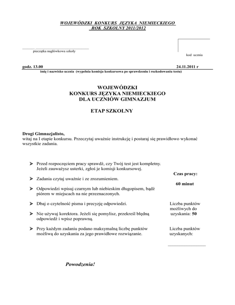 WOJEWÓDZKI KONKURS JĘZYKA NIEMIECKIEGO DLA UCZNIÓW